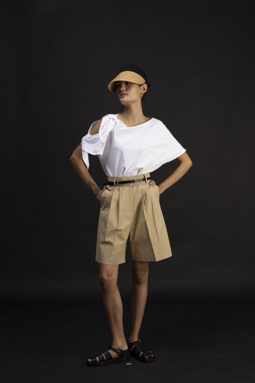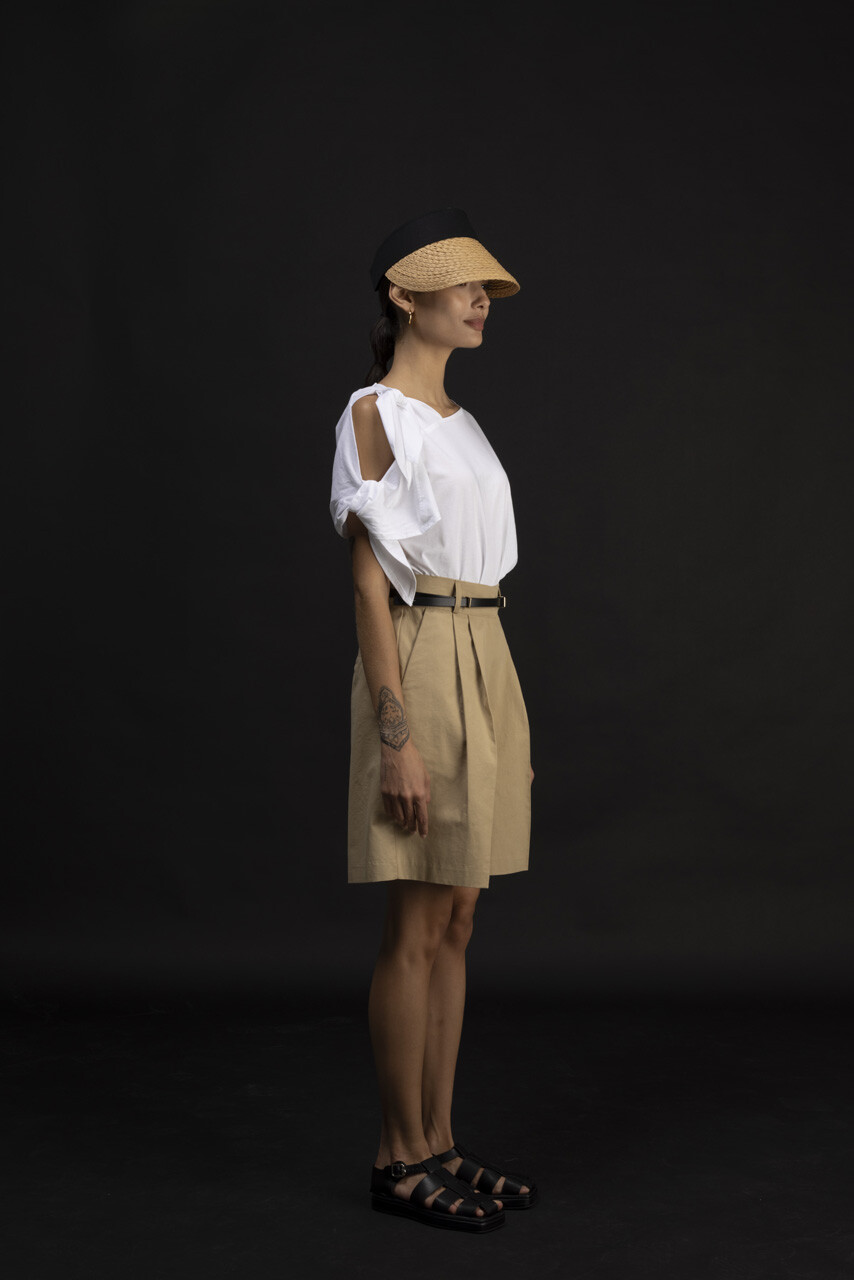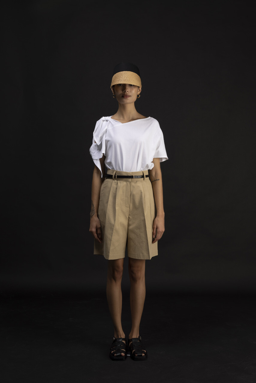 어깨와 소매부분의 매듭이 시선을 분산시켜 날씬해 보이며 심플하지만 장식적인 느낌이 시원시원한 오버티셔츠입니다.