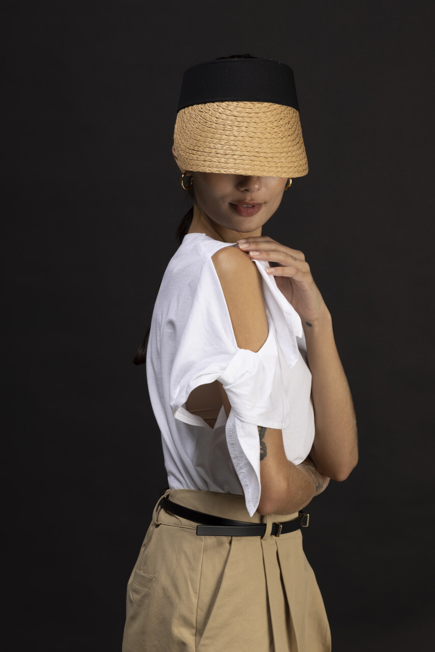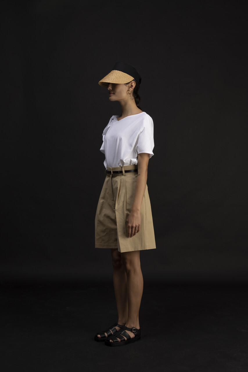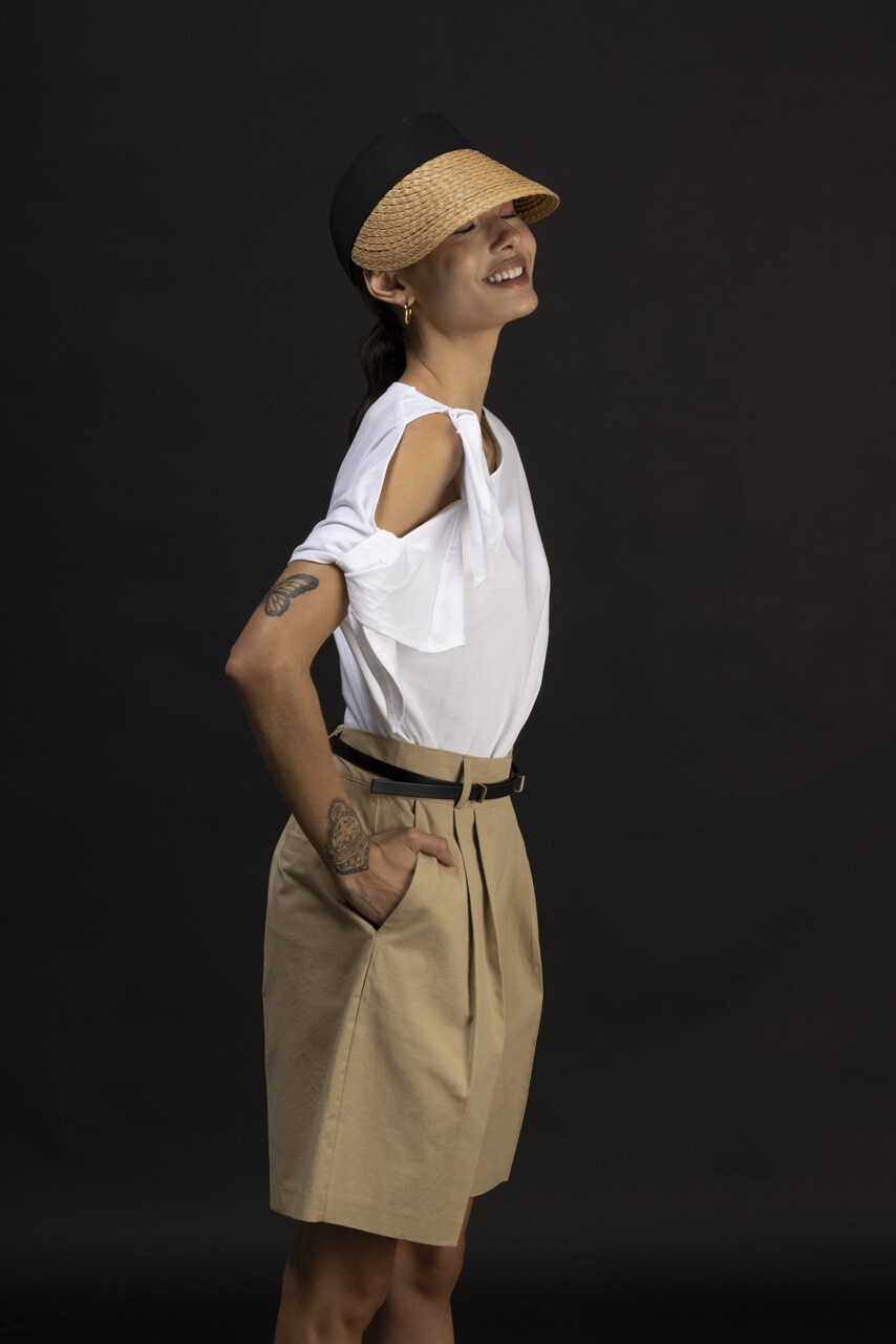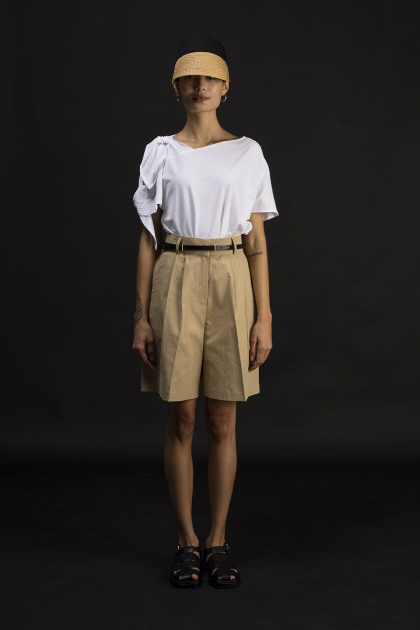 어깨와 소매부분의 매듭이 시선을 분산시켜 날씬해 보이며 심플하지만 장식적인 느낌이 시원시원한 오버티셔츠입니다.