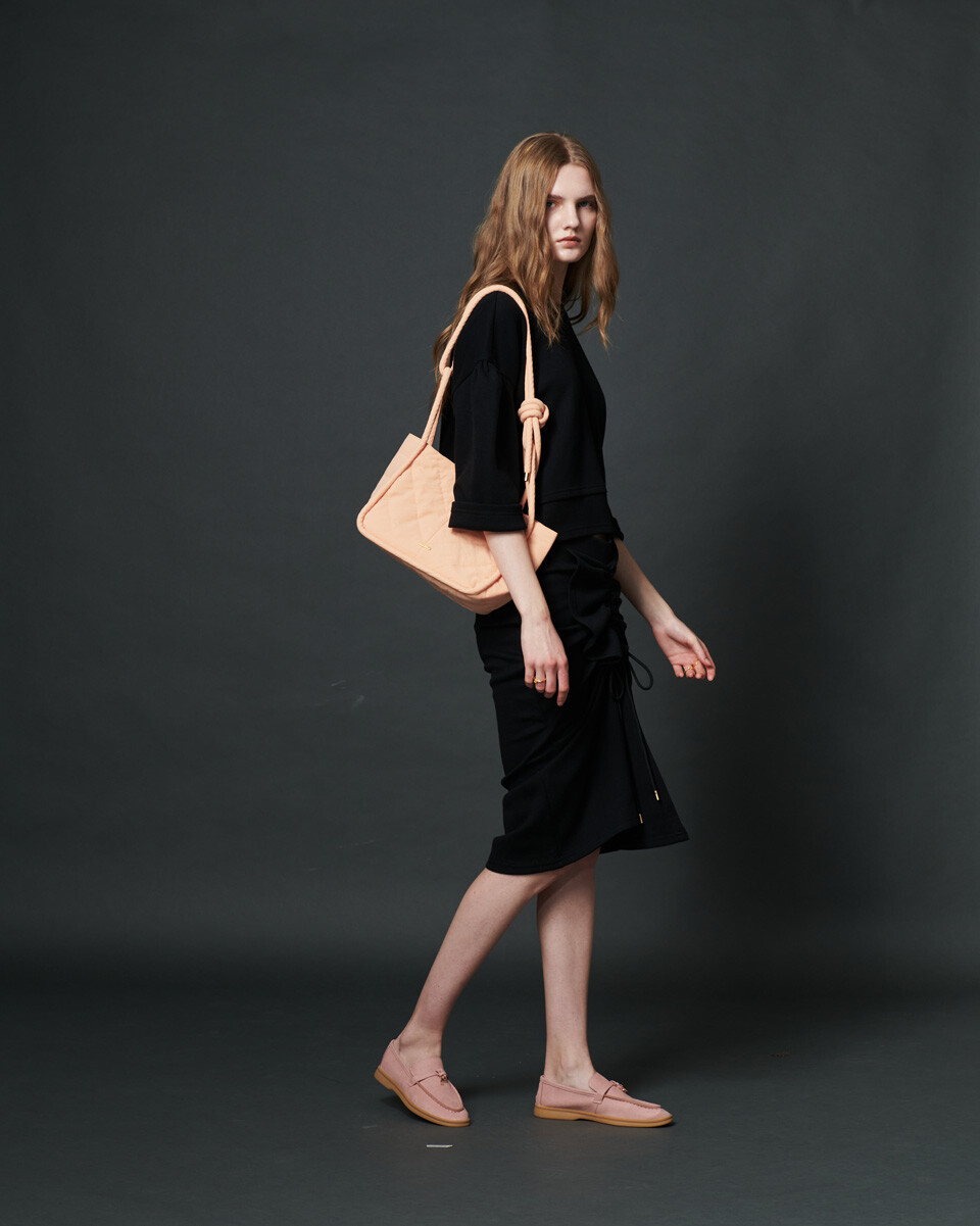 앞중심에 트임이 있고, 금속엔딩팁의 스트링을 연출하기에 따라 스커트의 길이와 디테일을 조절 할 수 있습니다.