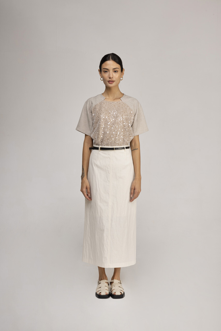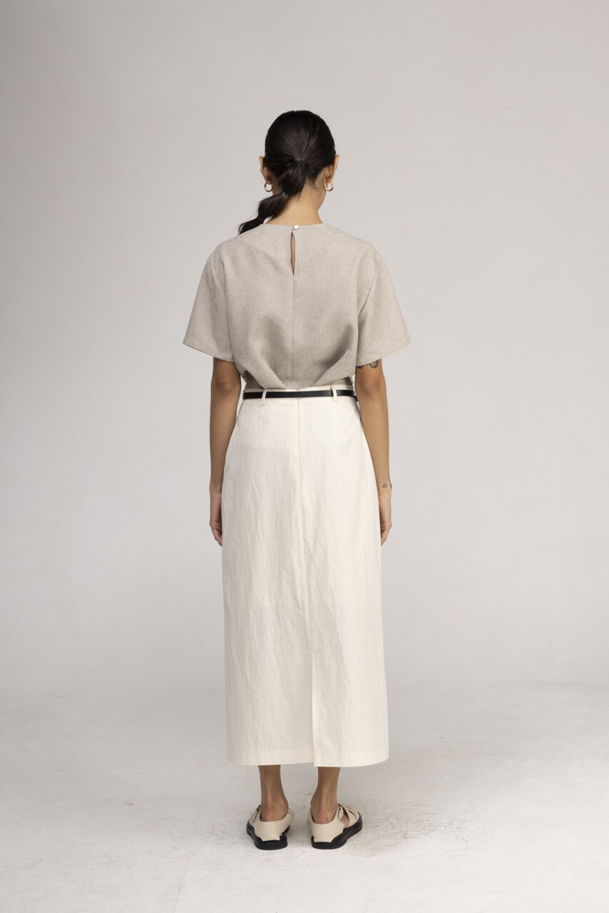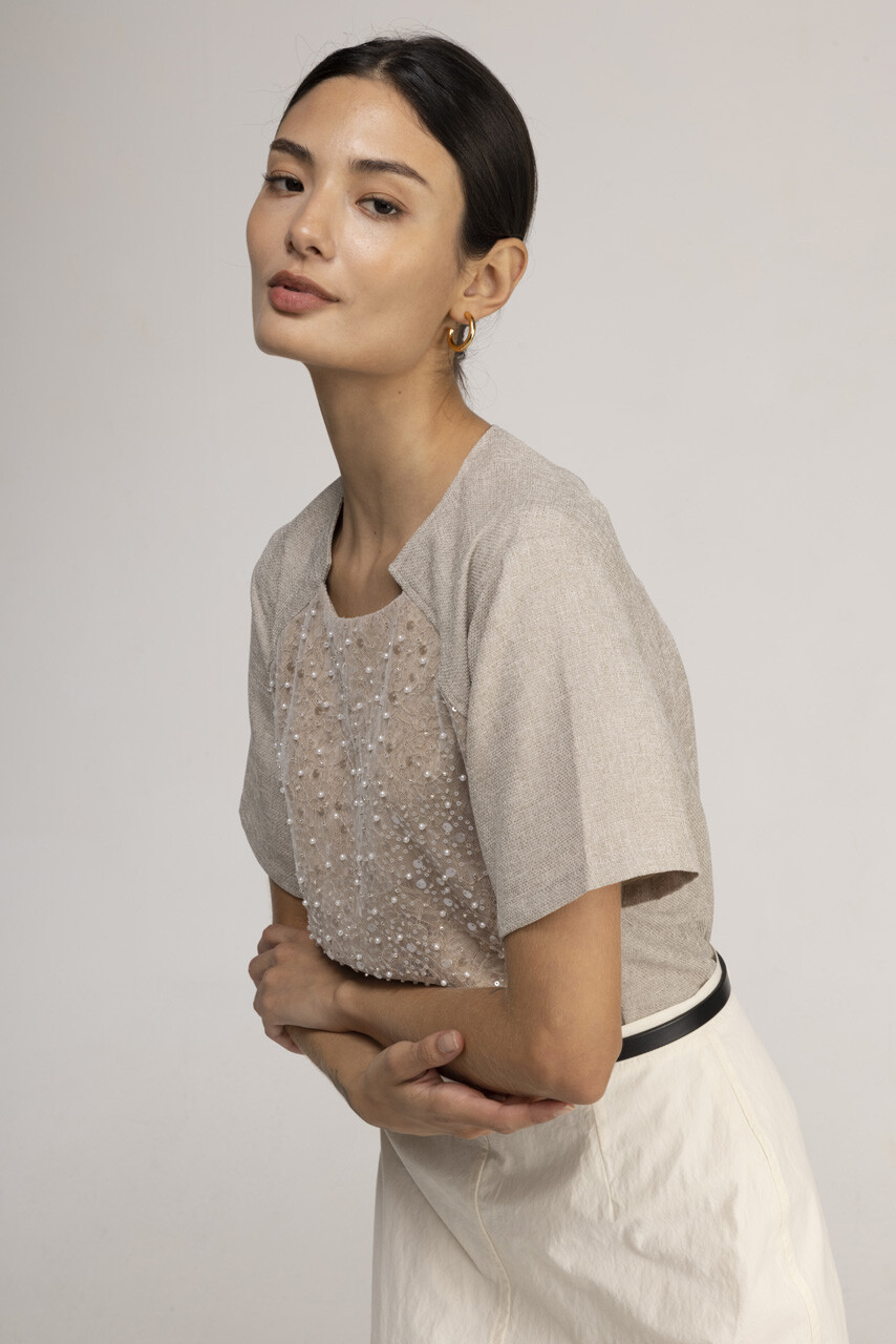 소매부분은 리넨과레이온의 혼방, 몸판 앞부분은 레이어링된 3중소재로 디자인 했습니다.