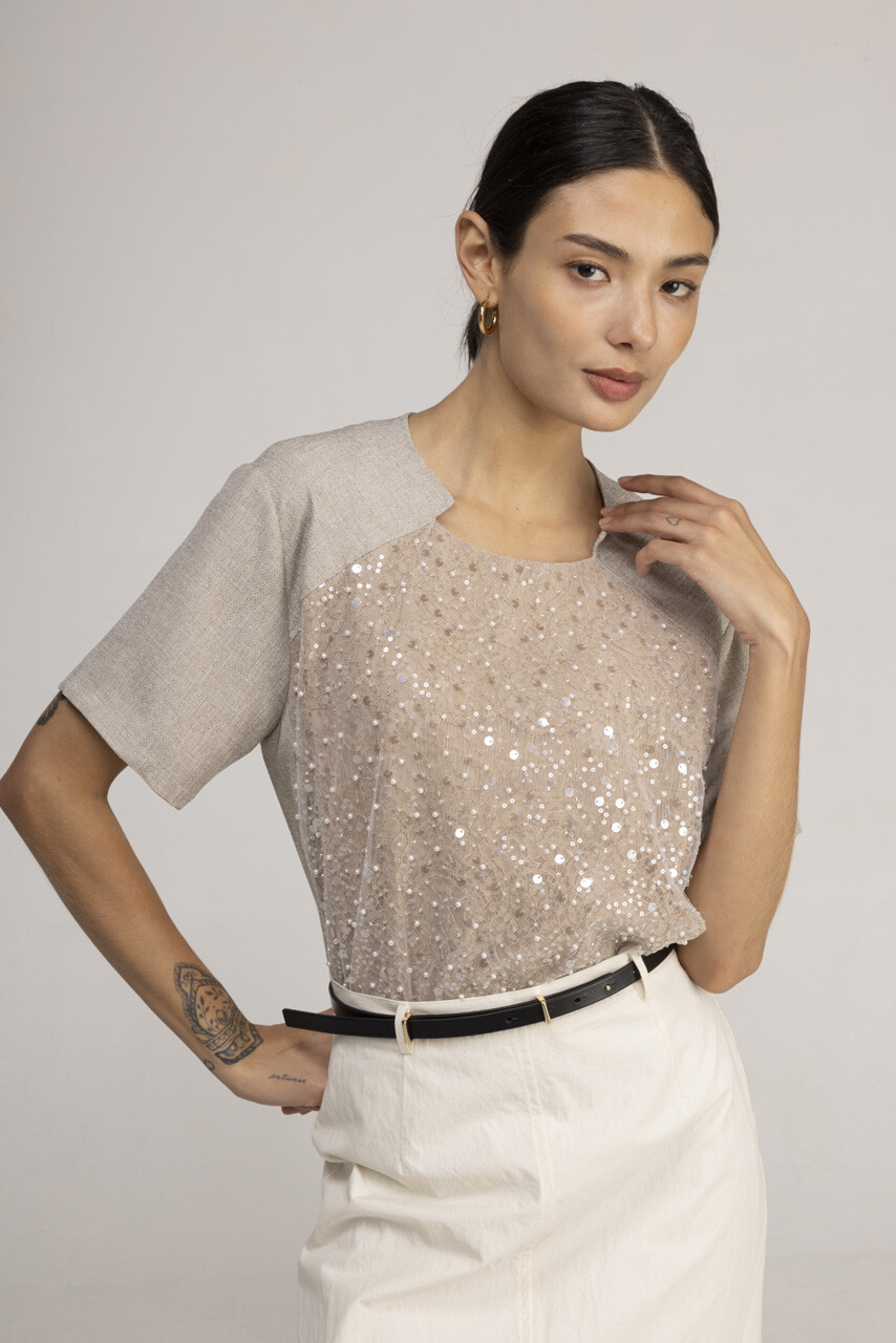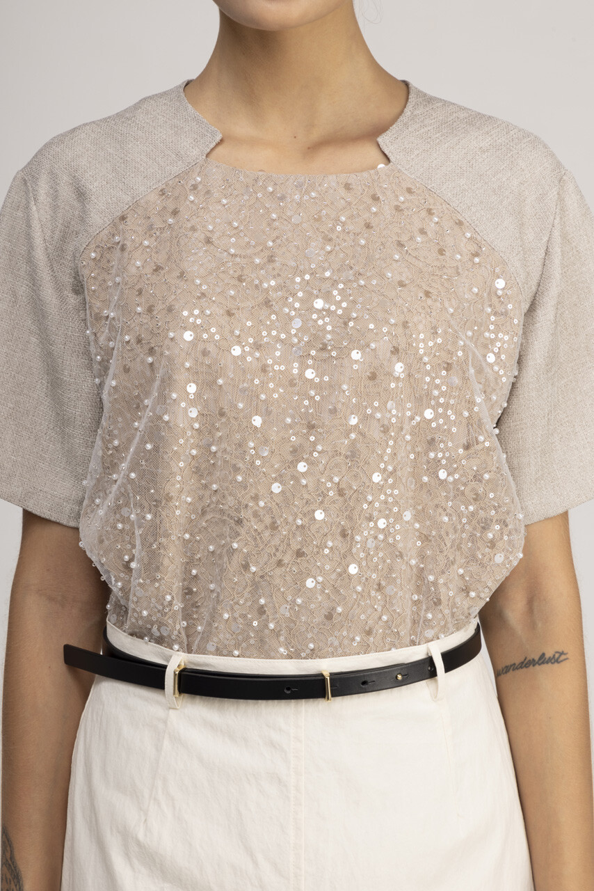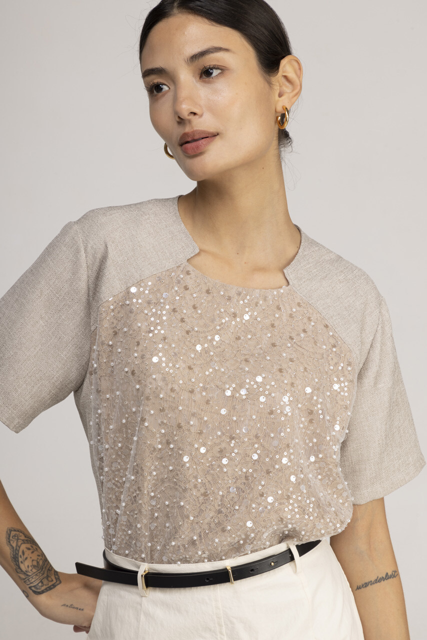 스팽글, 레이스, 쉬폰 소재의 레이어링이 고급스러운 기본실루엣의 블라우스입니다.