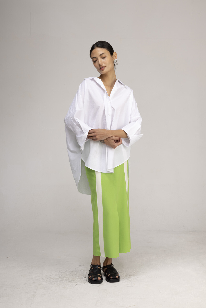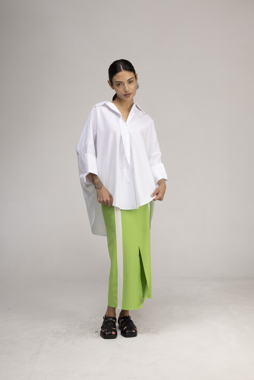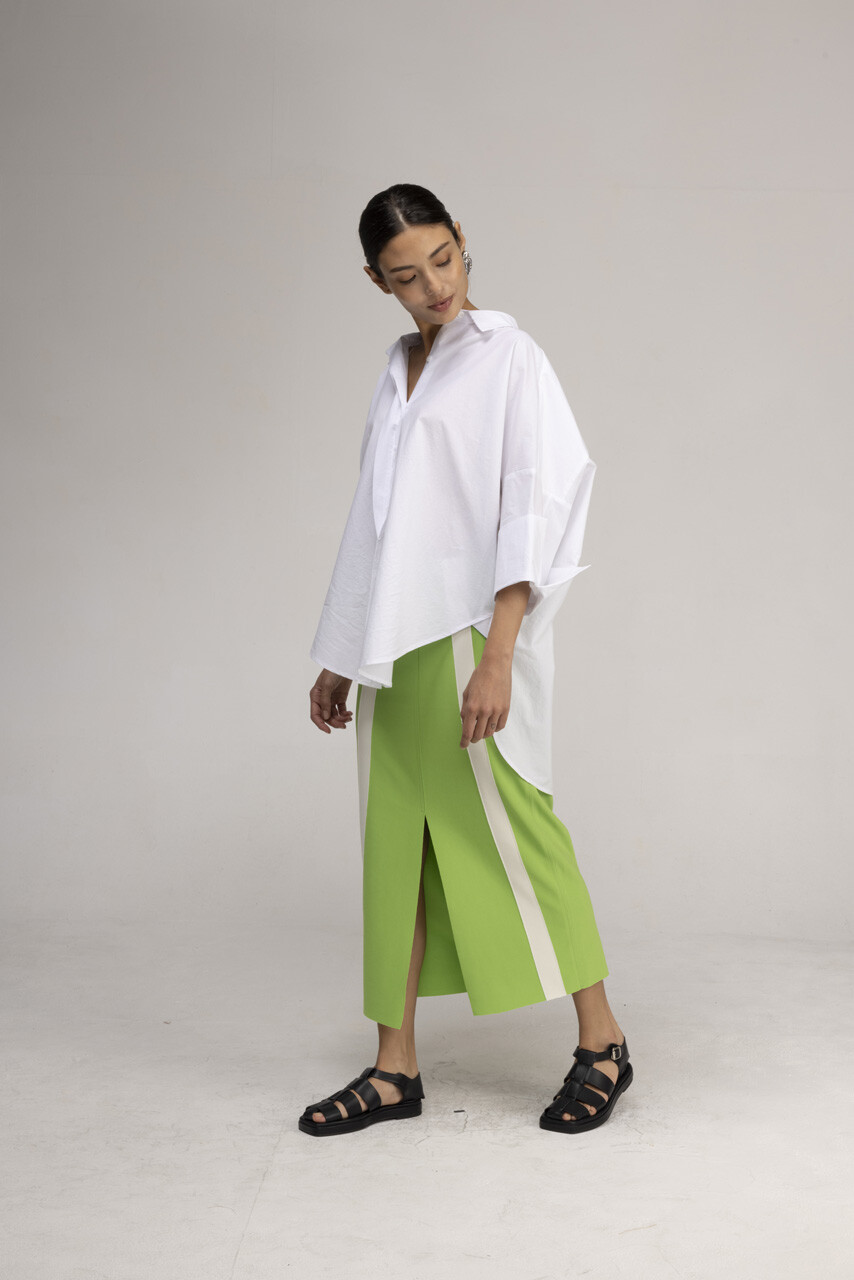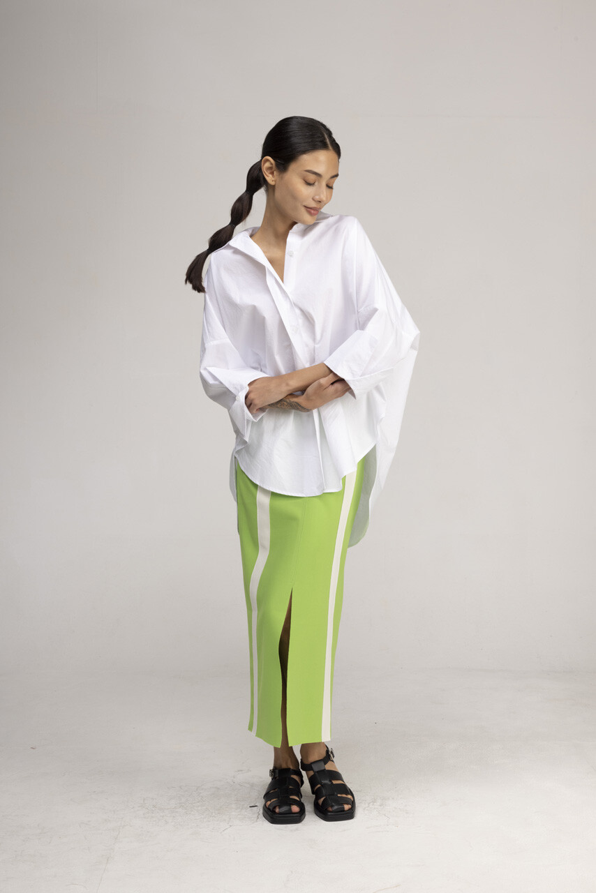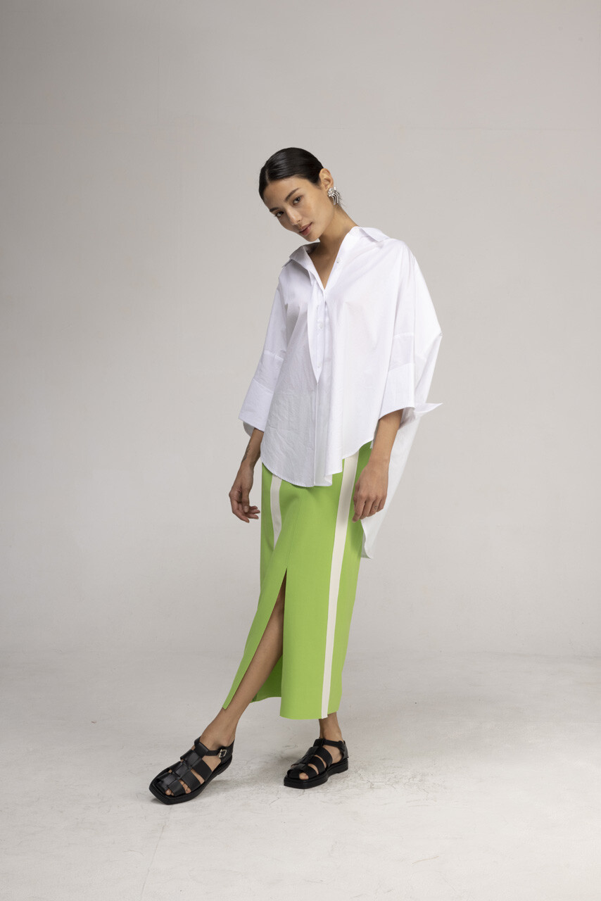 포인트 컬러배색으로 슬림 해 보이는 디자인의 스트레이트실루엣 스커트 입니다.