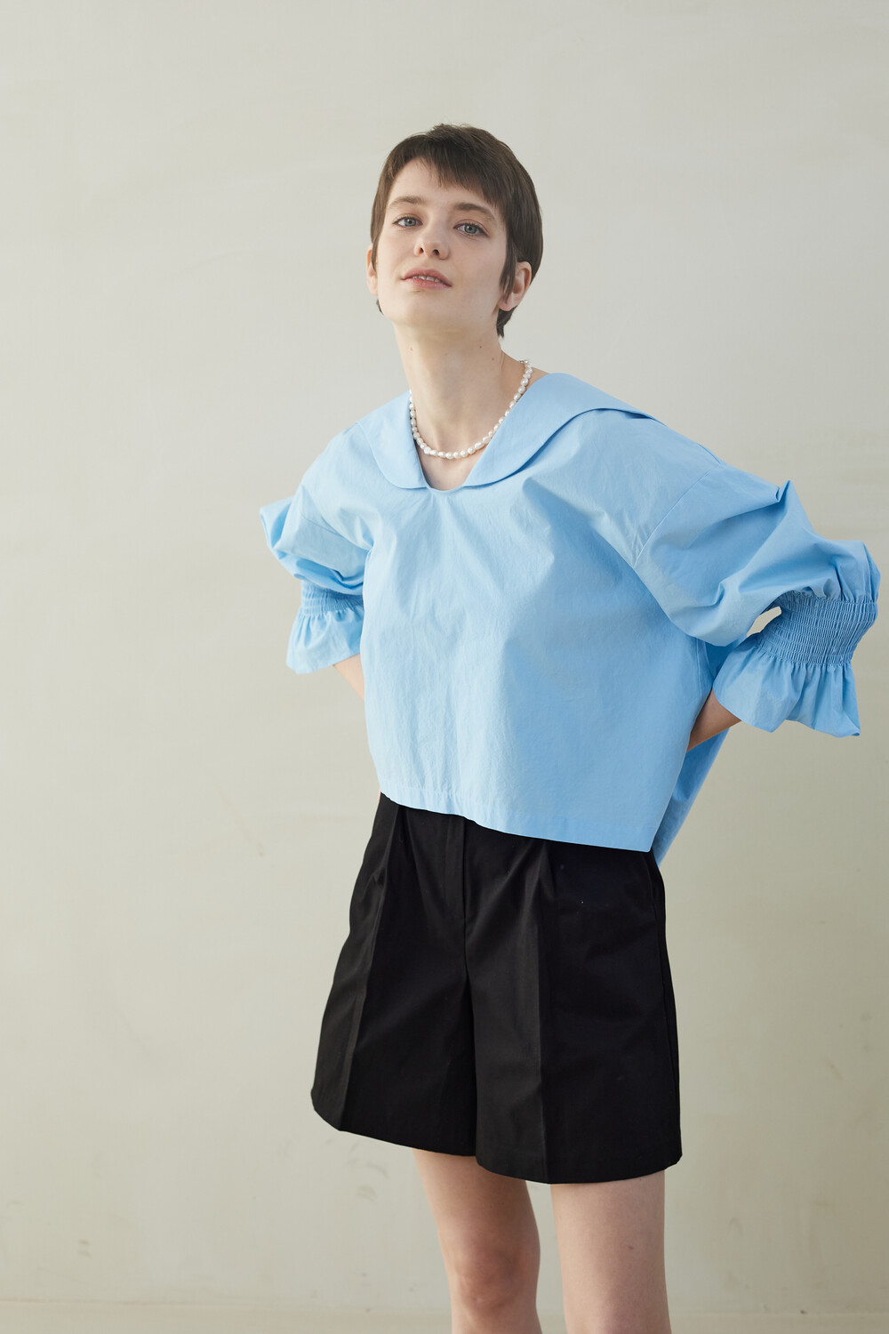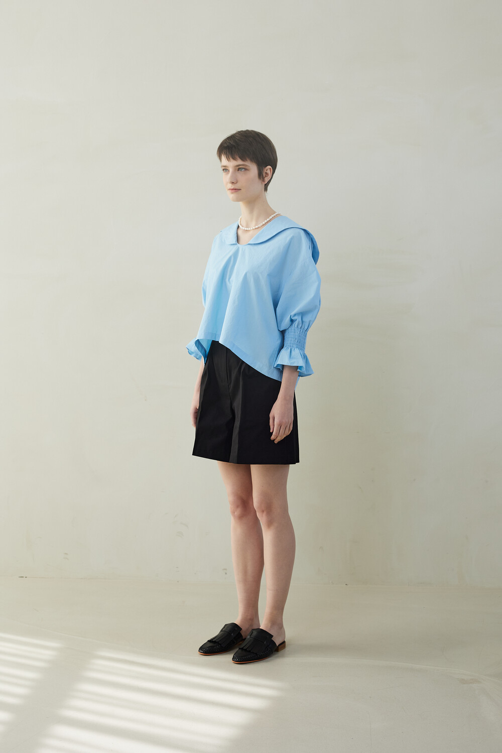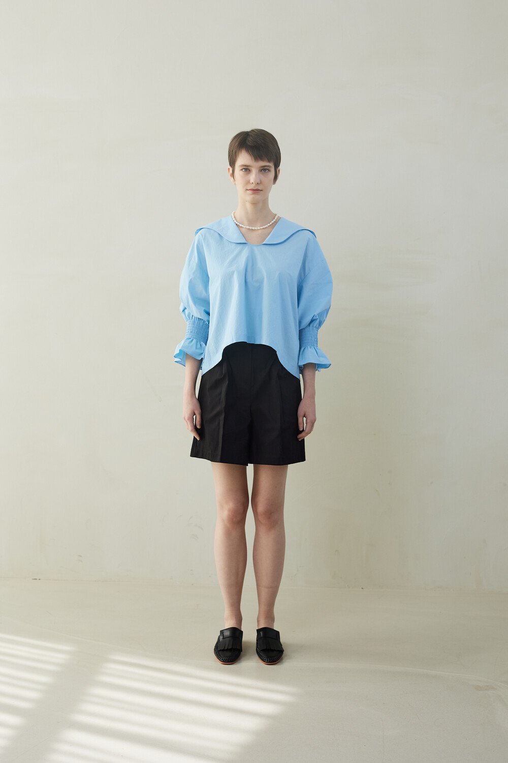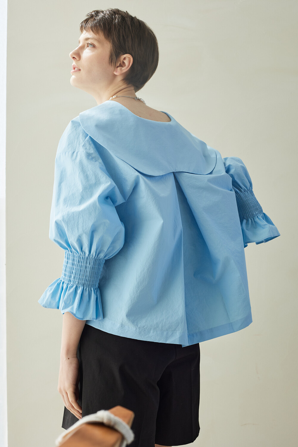 카라의 형태와 소매실루엣이 매력적인 블라우스 입니다.