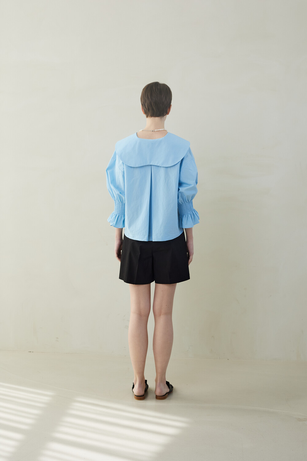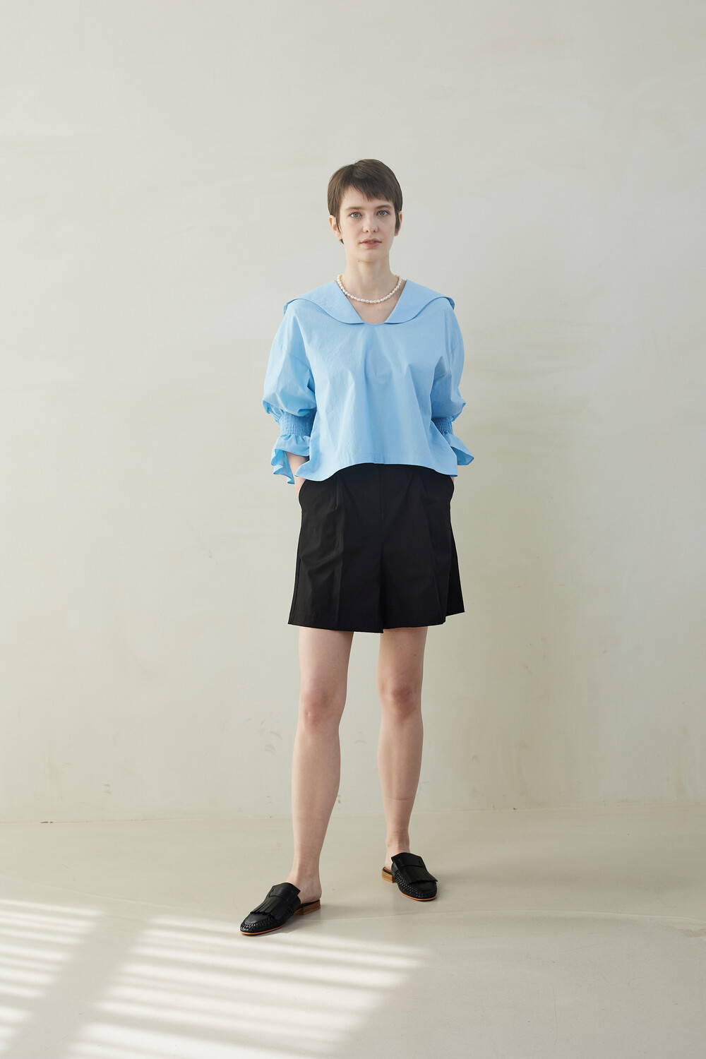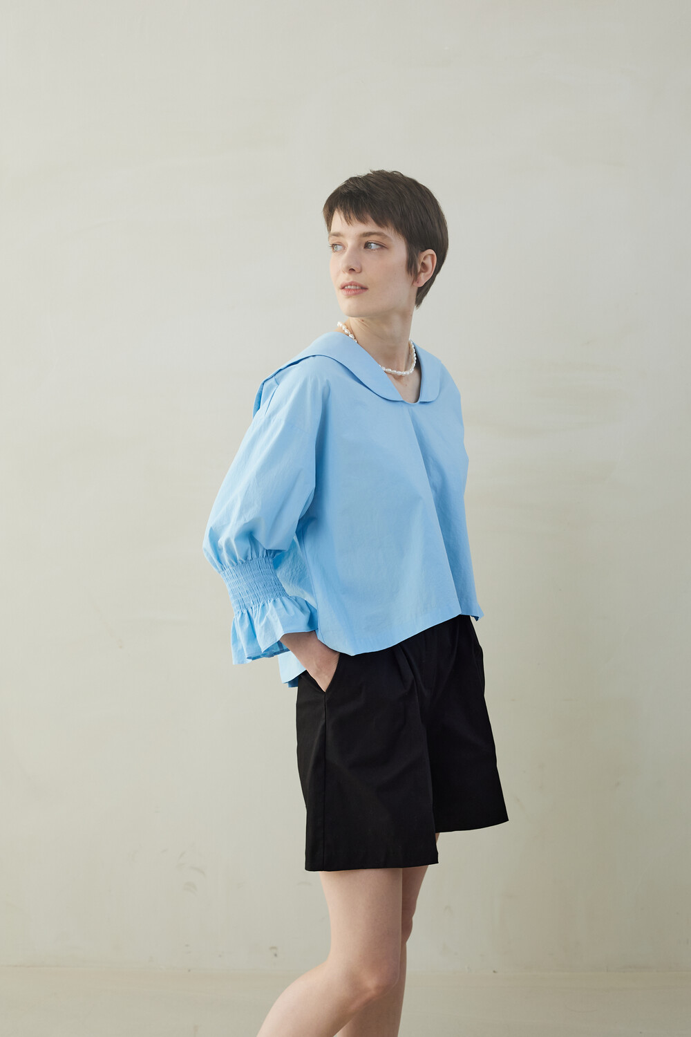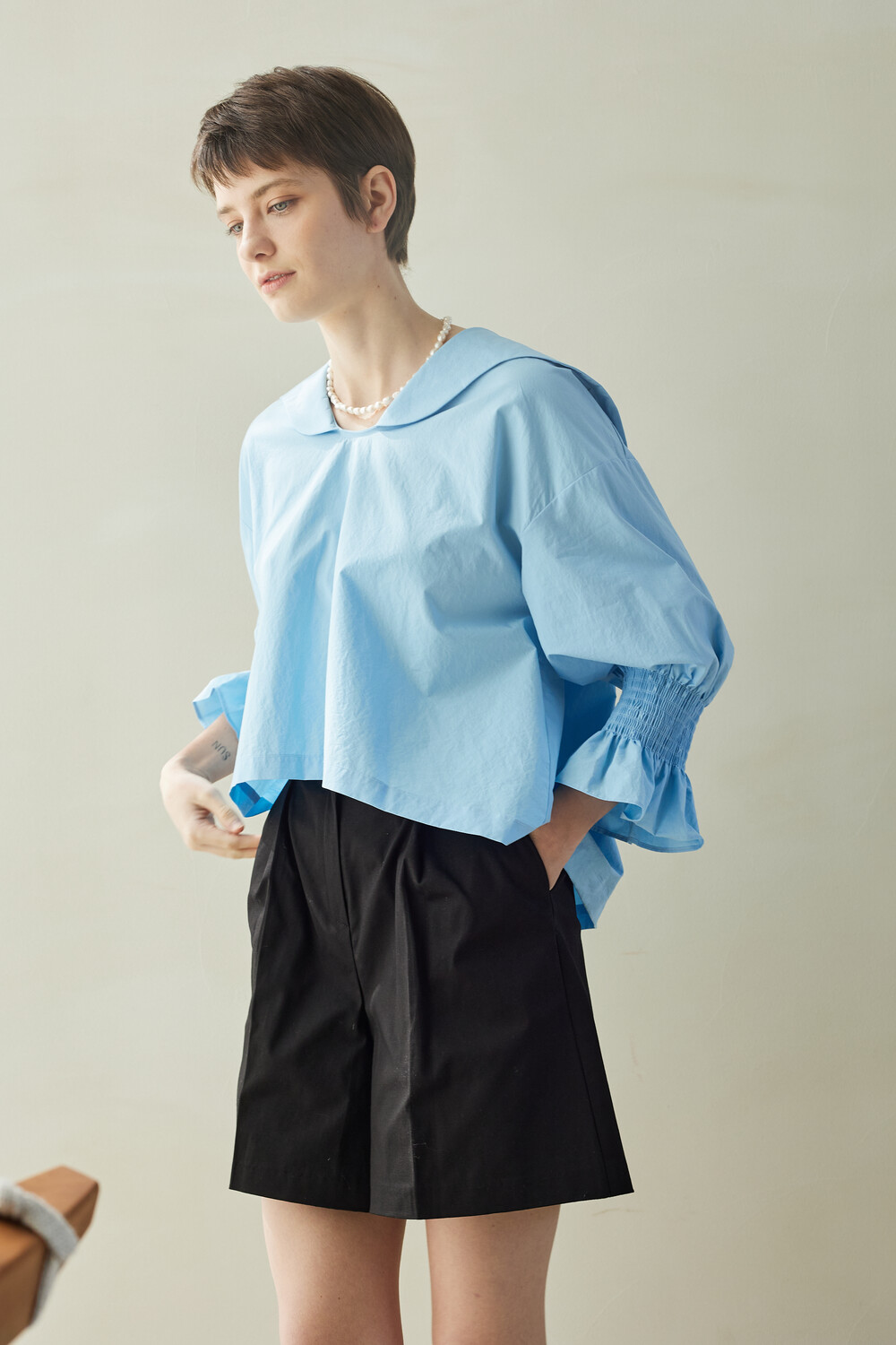 카라의 형태와 소매실루엣이 매력적인 블라우스 입니다.