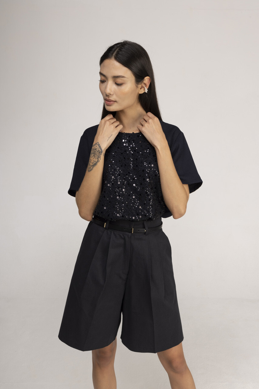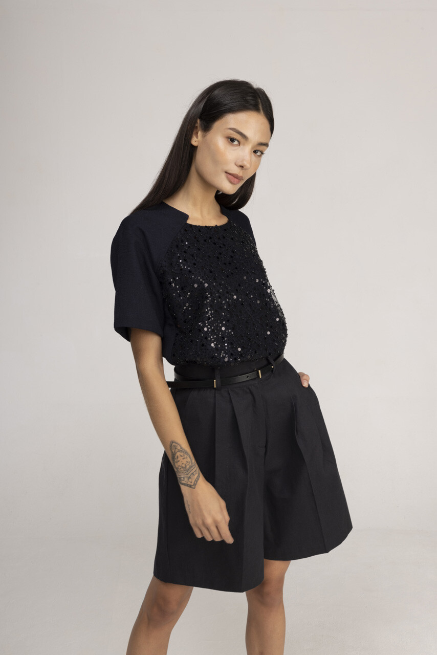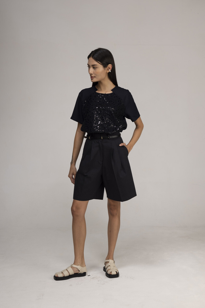 앞부분의 핀턱으로 체형을 커버할 수 있고, 허리 뒷부분이 밴딩으로 되어있어 활동이 편안합니다.