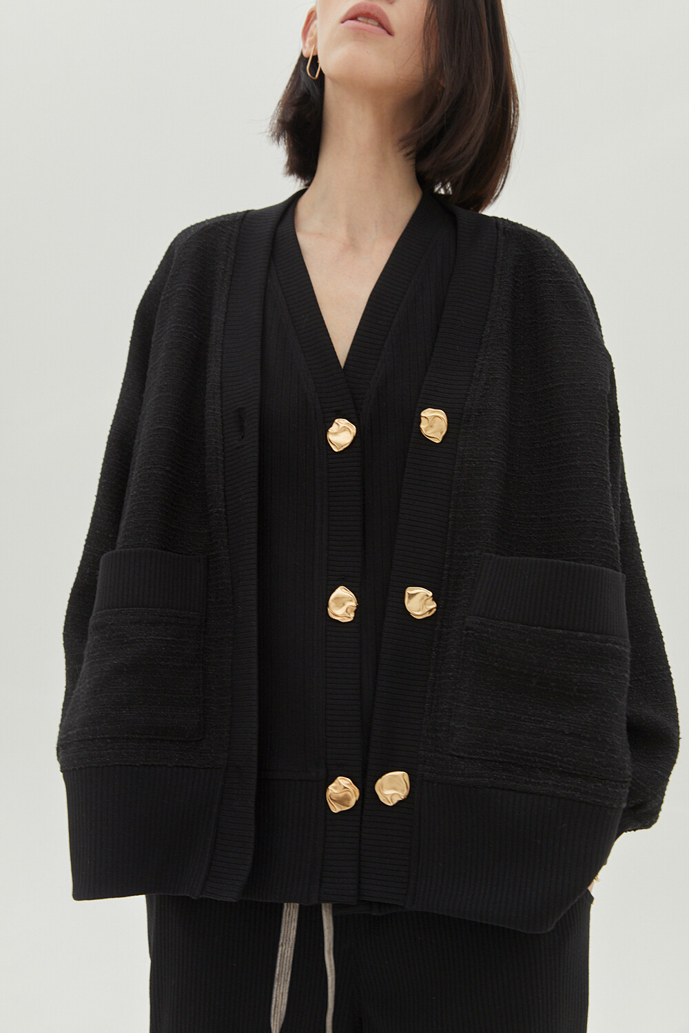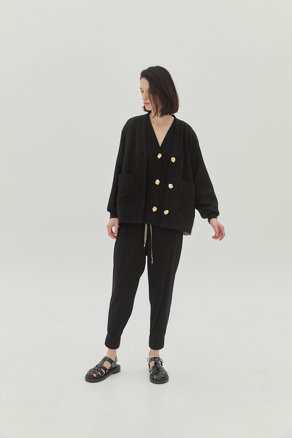 가벼운 트위트소재의 가디건과 트렌치코트의 형태가 결합된 디자인의 아우터입니다.