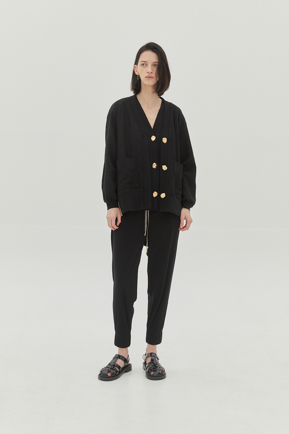 한여름까지 착용하기 좋은 소재로 활용 폭이 넓은 디자인이며, 아우터와 같은 포인트 단추의 디테일이 고급스럽습니다.