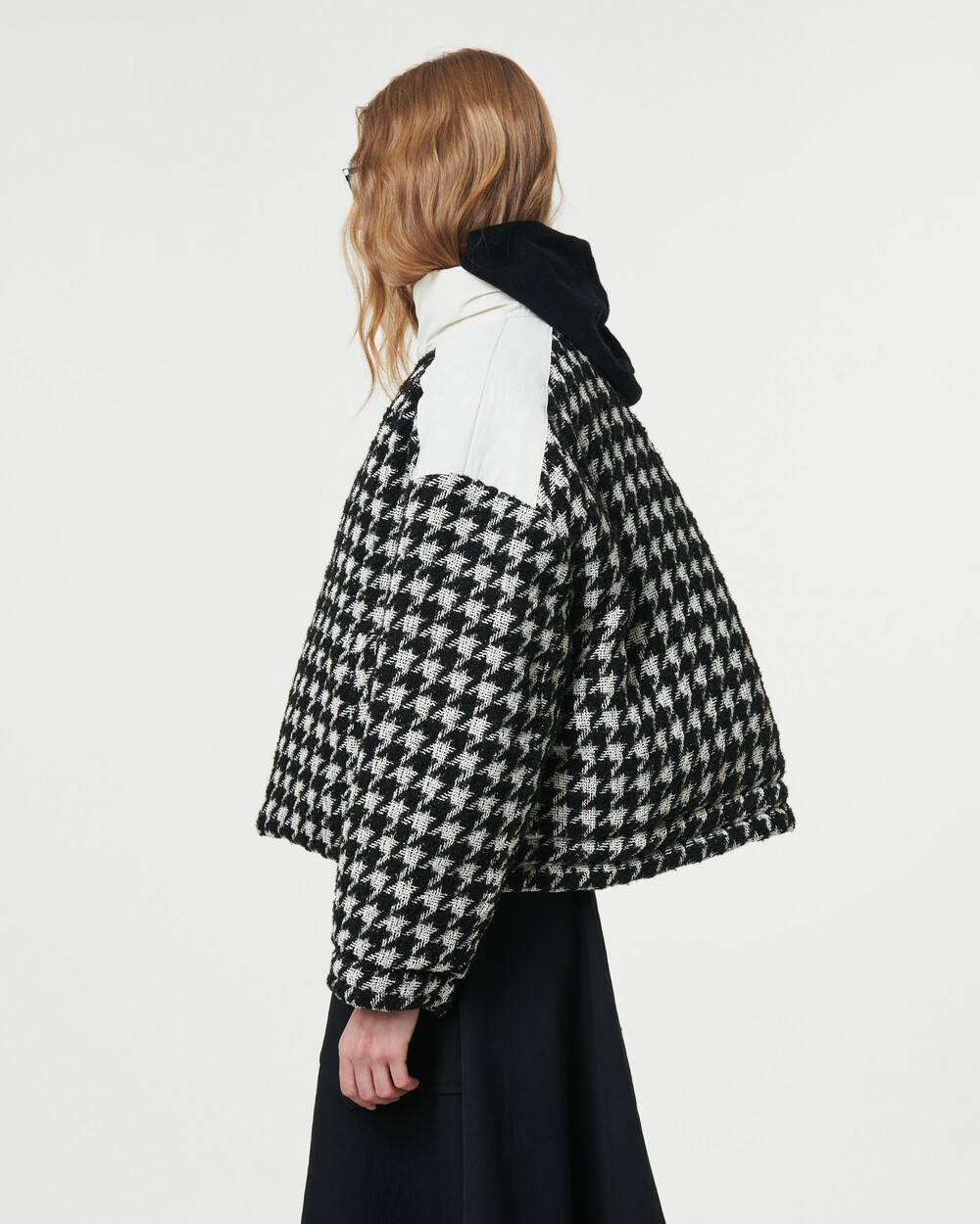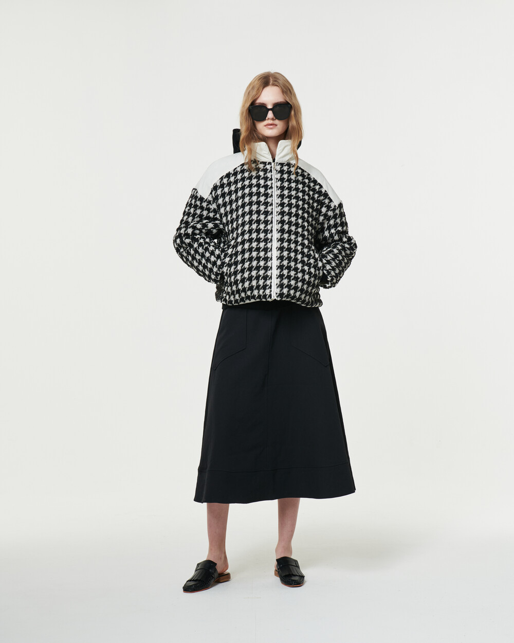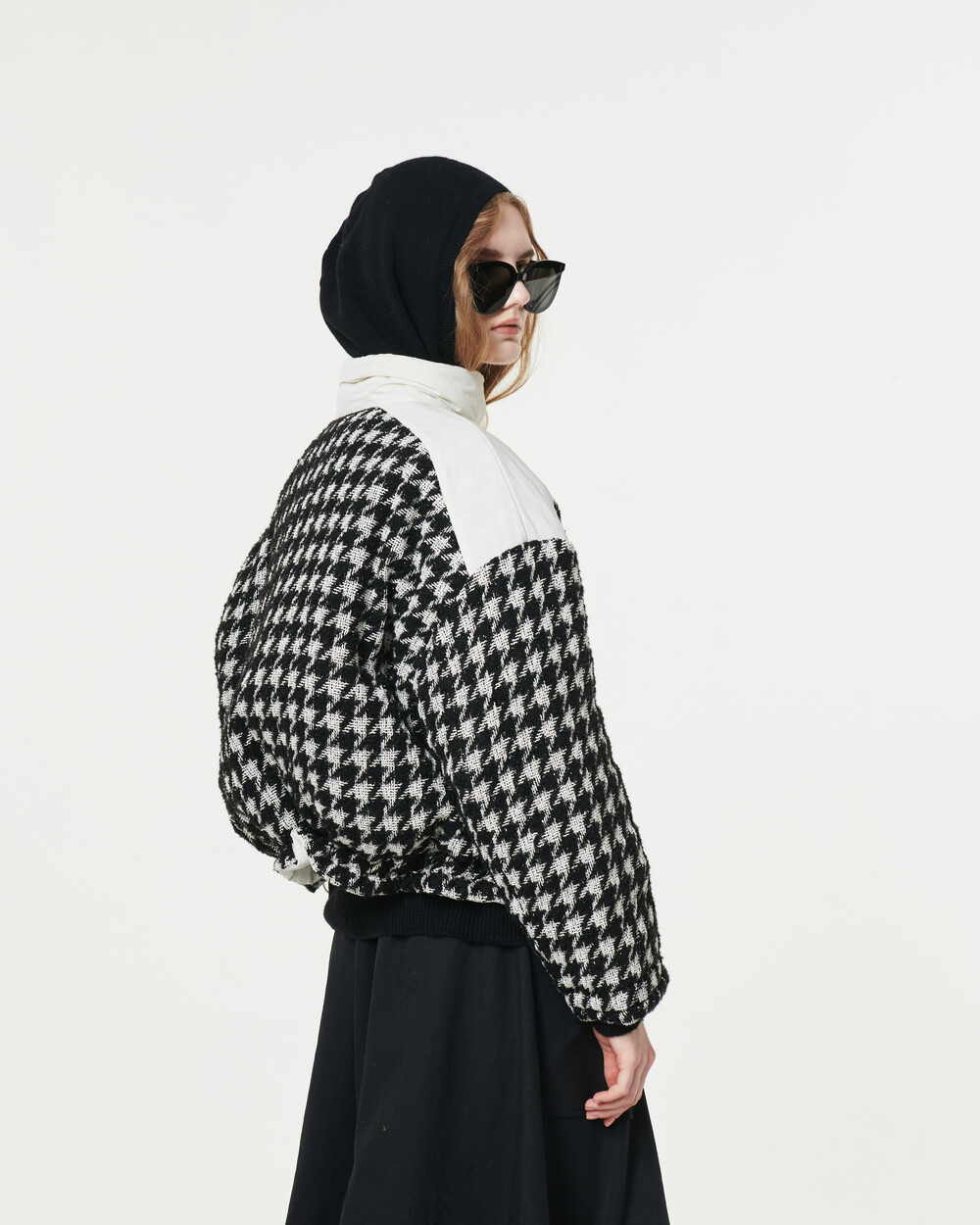 6온스 웰론솜을 충전제로 사용하여 따뜻하며, 고급스러운 하운드투스원단을 점퍼로 디자인하여