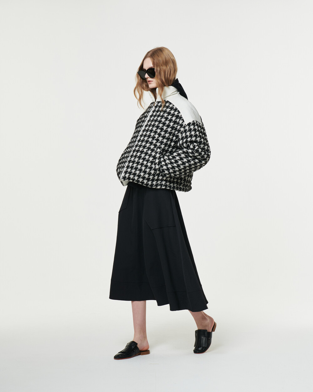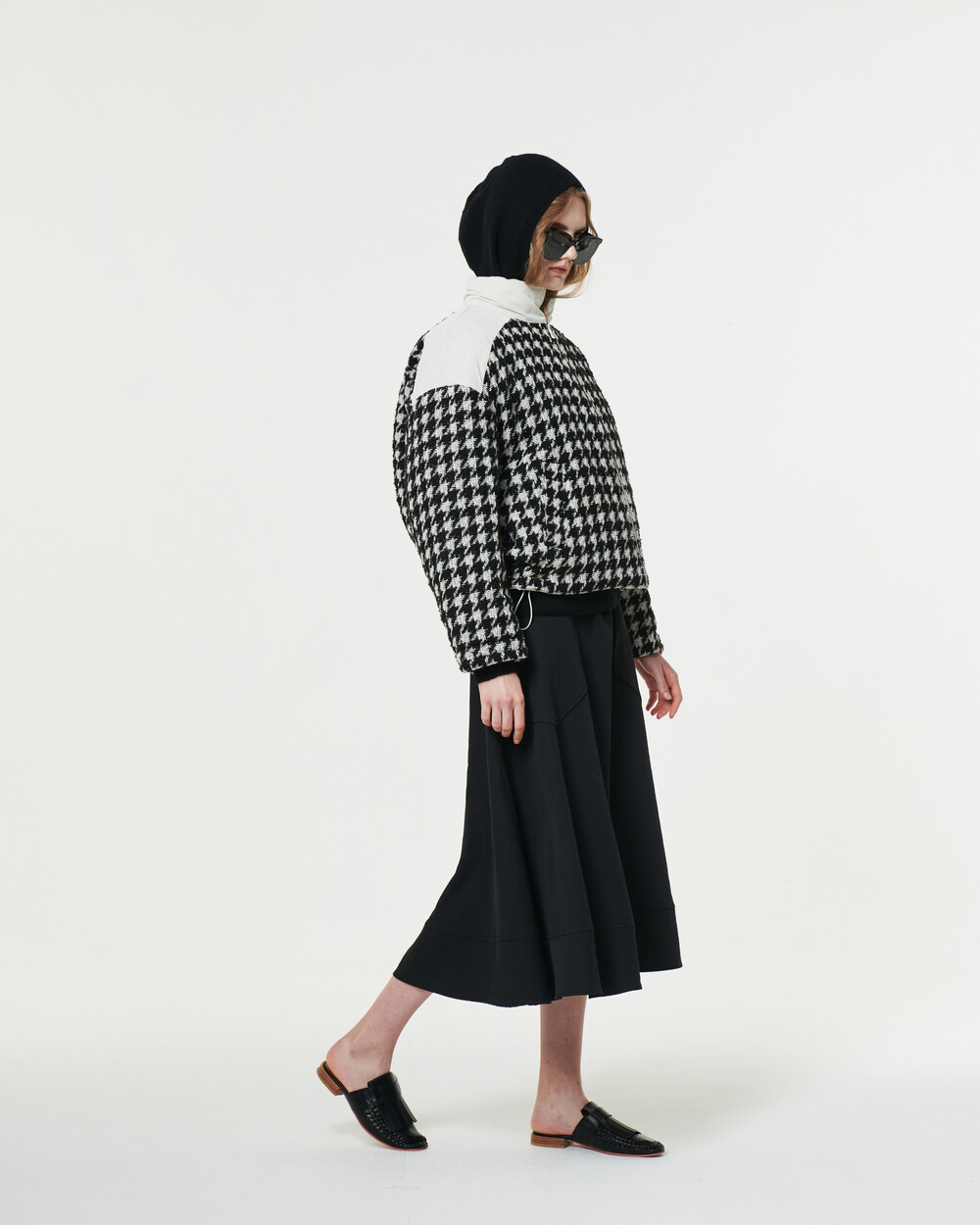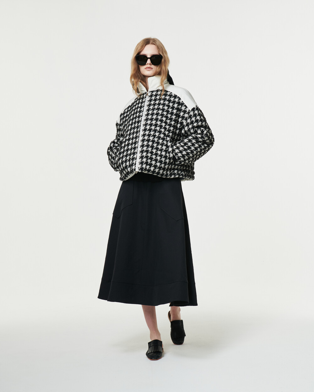6온스 웰론솜을 충전제로 사용하여 따뜻하며, 고급스러운 하운드투스원단을 점퍼로 디자인하여
