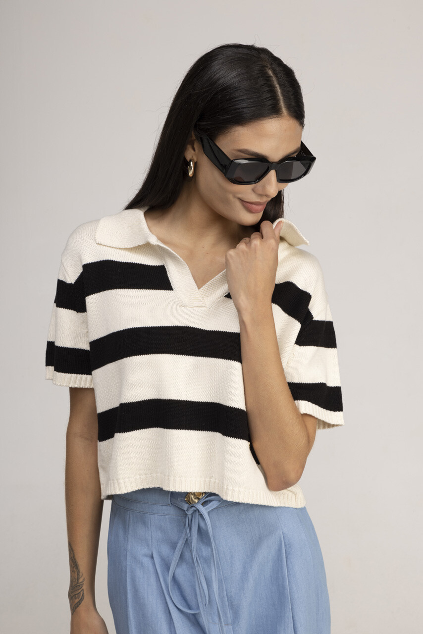 루즈한 실루엣의 스트라이프 니트 탑입니다.