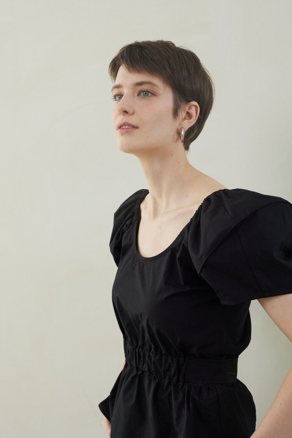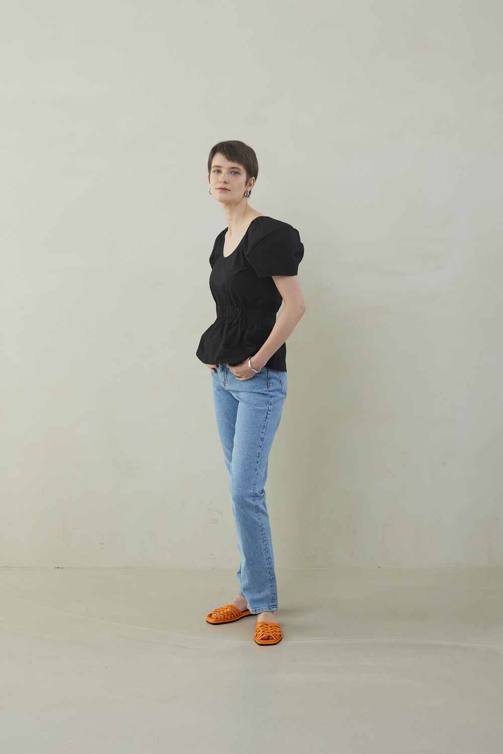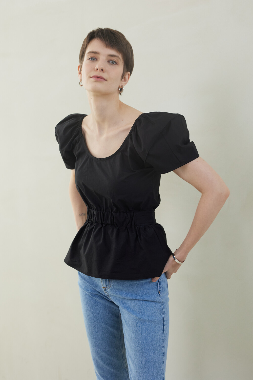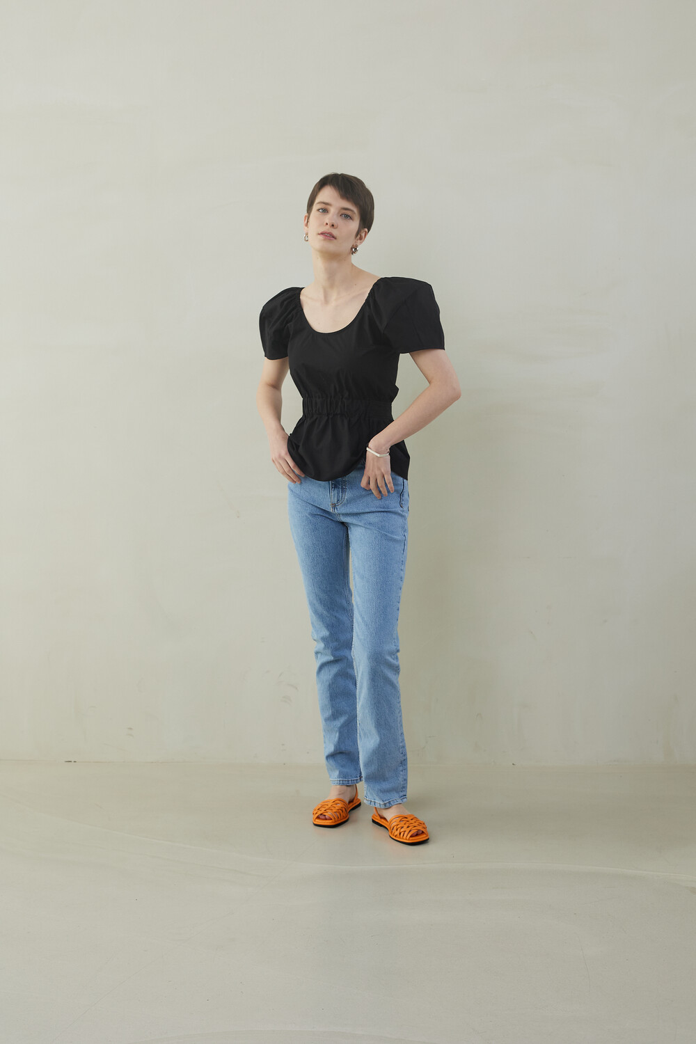 네크라인의 셔링부분과 볼륨소매가 매력적인 블라우스입니다.