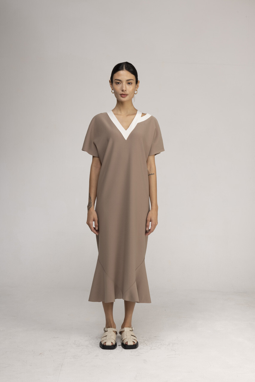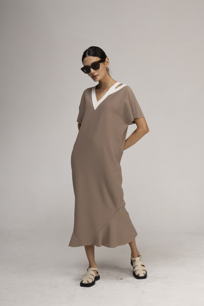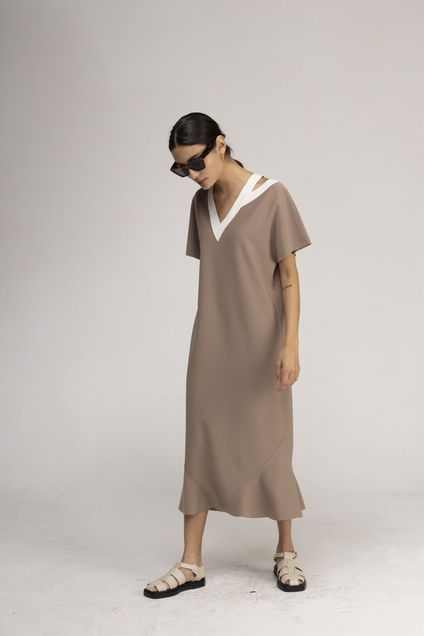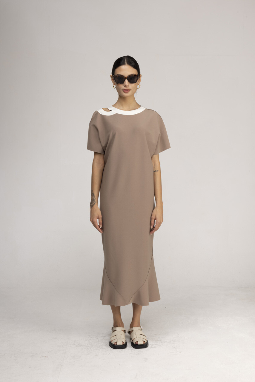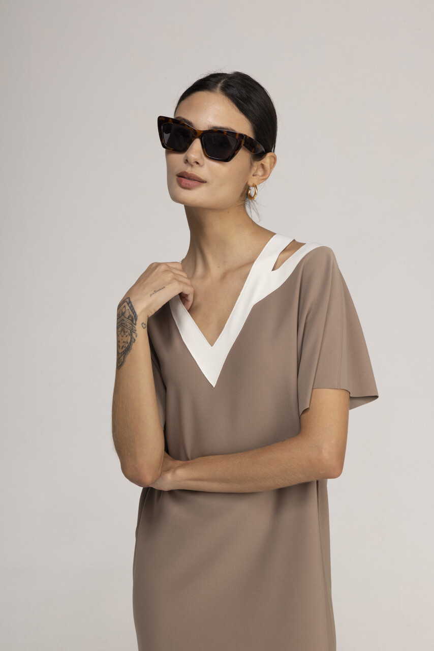 상의의 실루엣이 여유로와 앞,뒤 구분 없이 두가지 타입의 네크라인을 선택하여 착용할 수 있는 드레스 입니다.