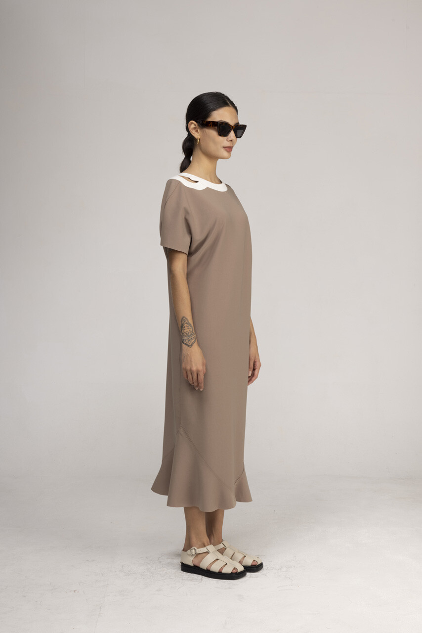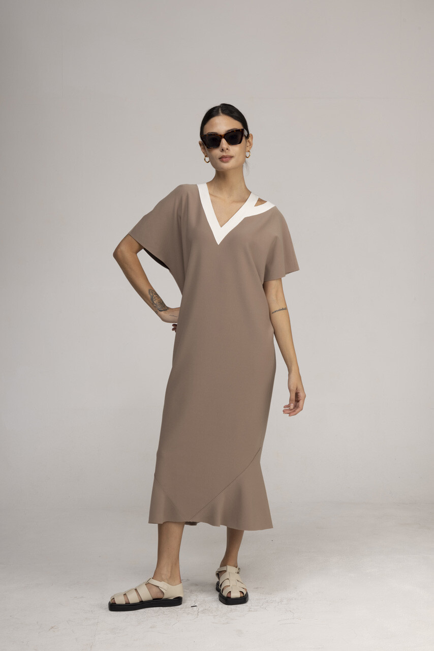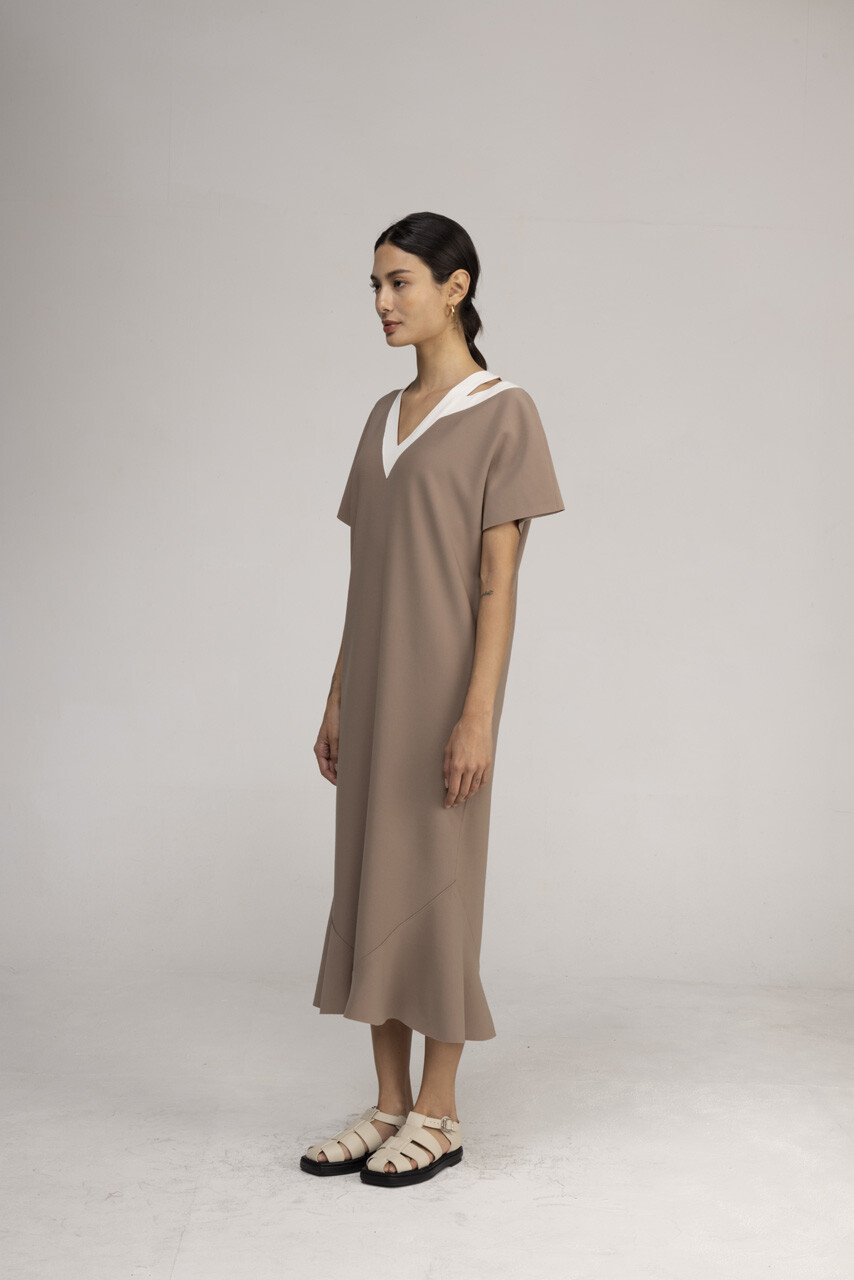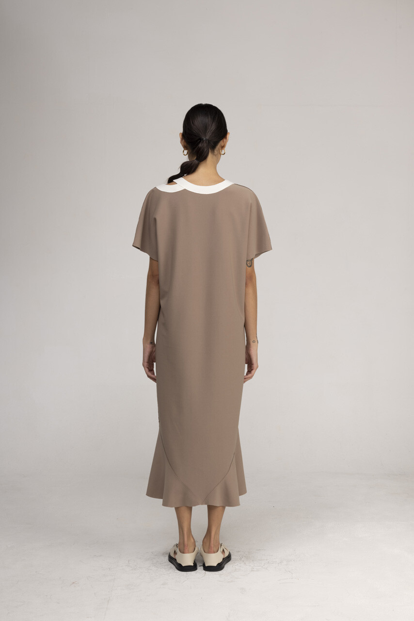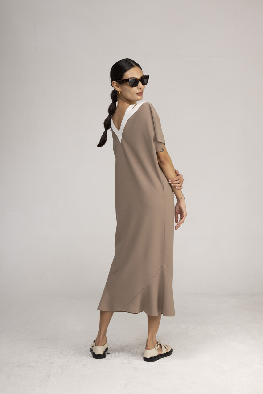 상의의 실루엣이 여유로와 앞,뒤 구분 없이 두가지 타입의 네크라인을 선택하여 착용할 수 있는 드레스 입니다.