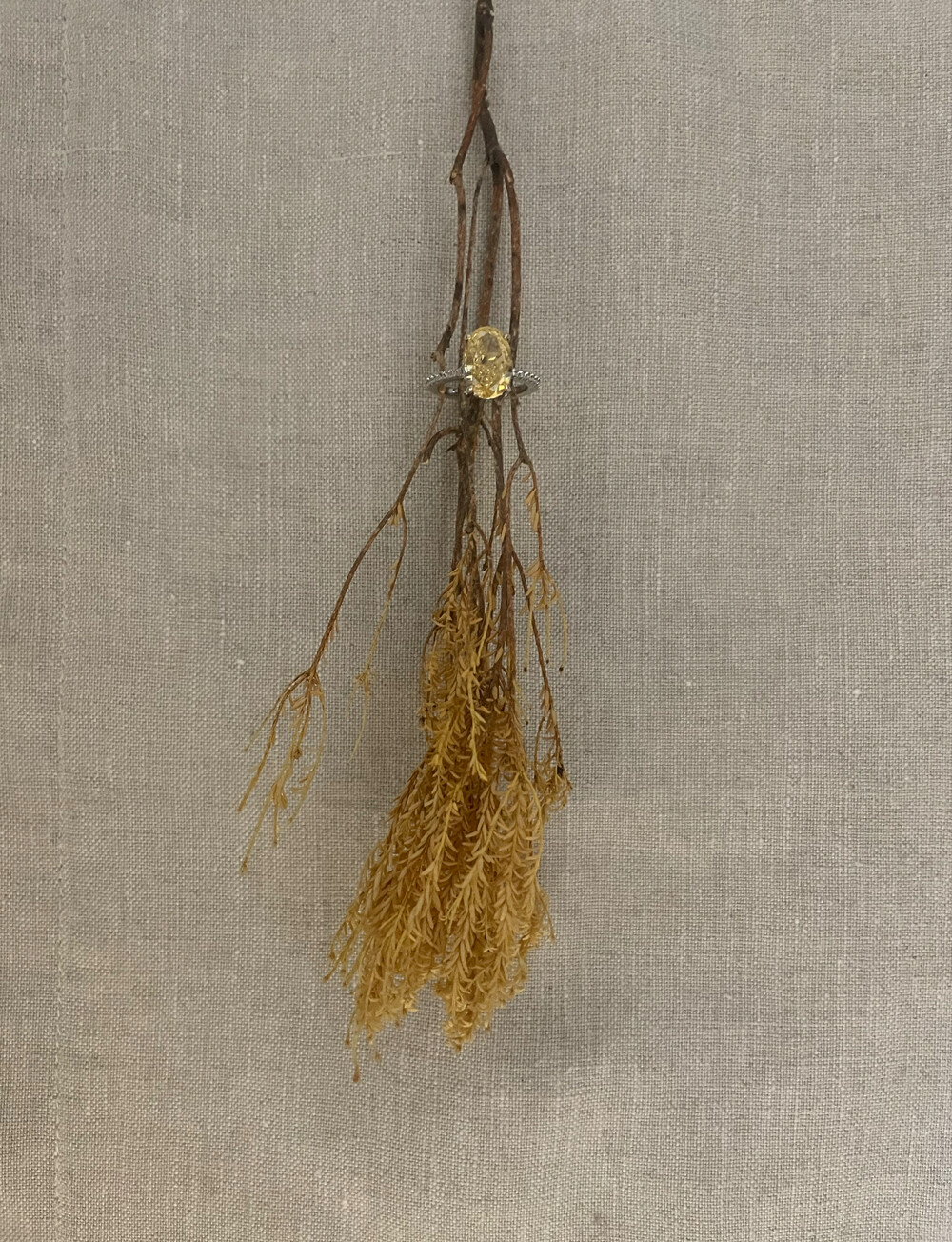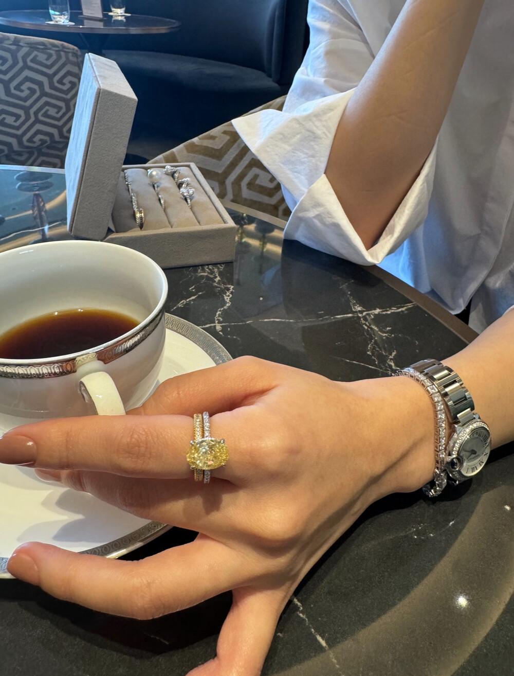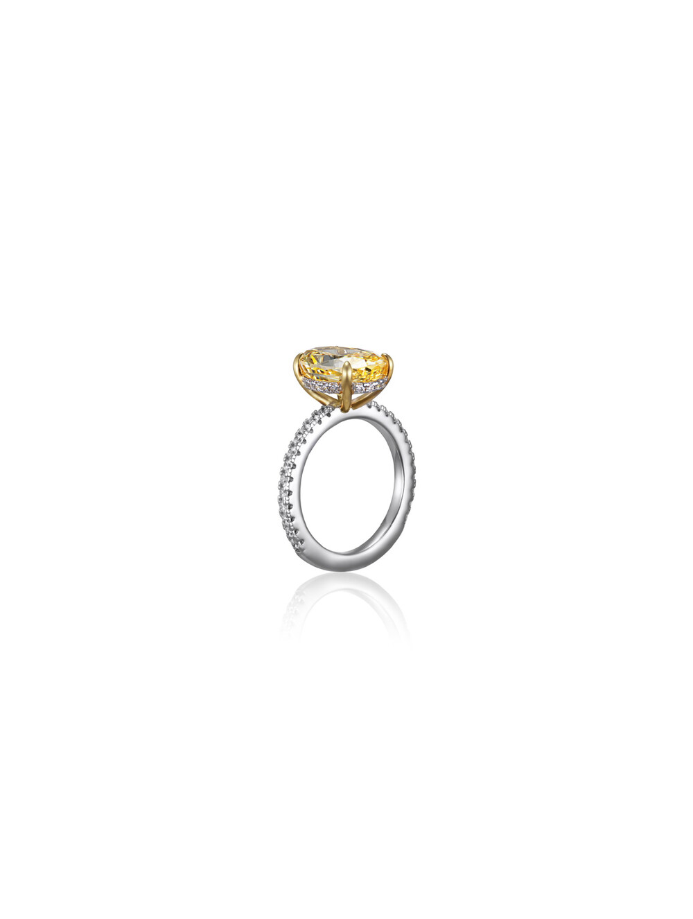 중심의 옐로우 오발 스톤은 옐로우 골드로 도금하였고, 화이트 라운드 스톤은 화이트골드로 도금하여 전체적으로 디자인의 조화가 좋은 링입니다.