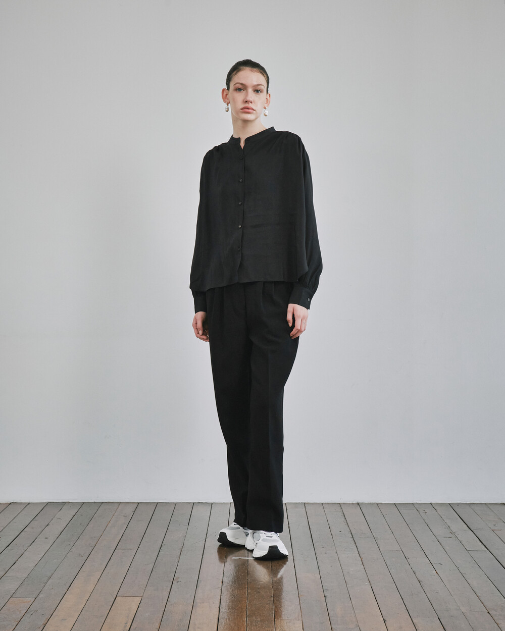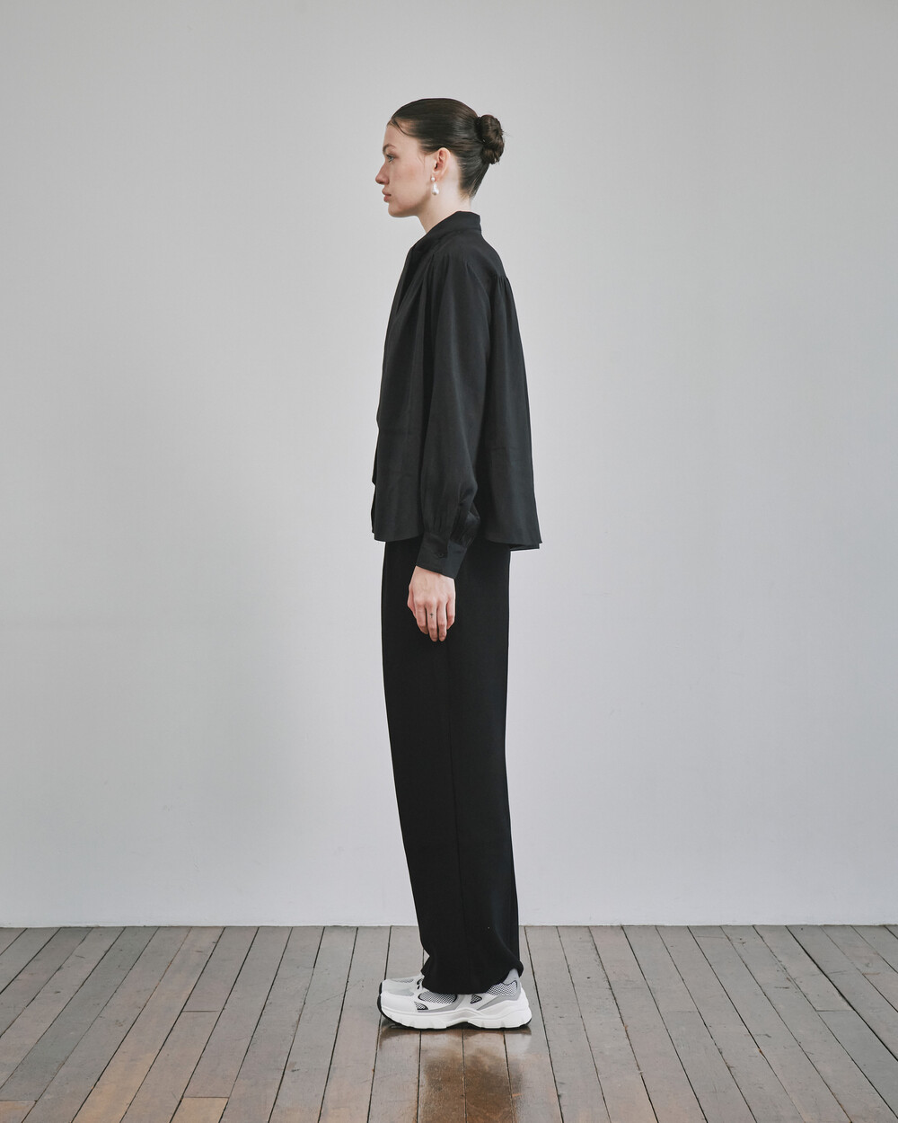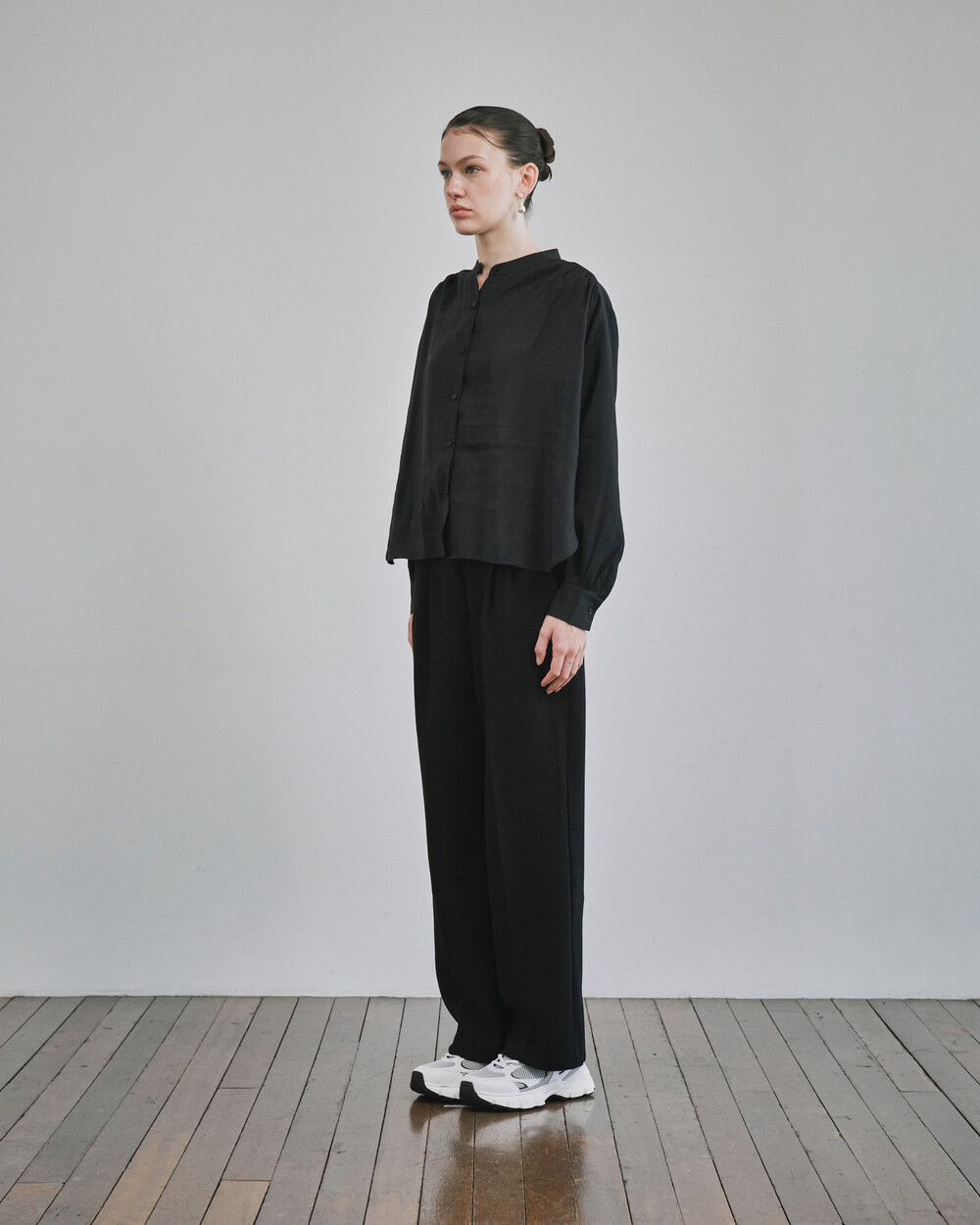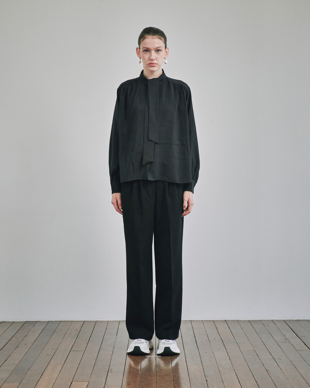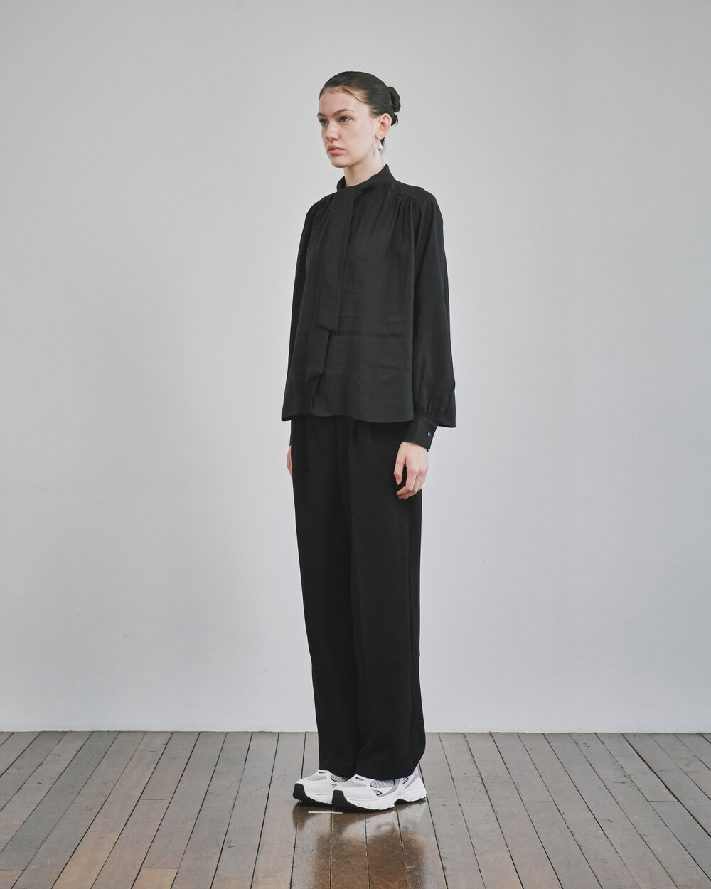 목 부분의 타이를 탈부착하여 스탠딩카라와 타이카라, 두가지 연출이 가능한 블라우스입니다.