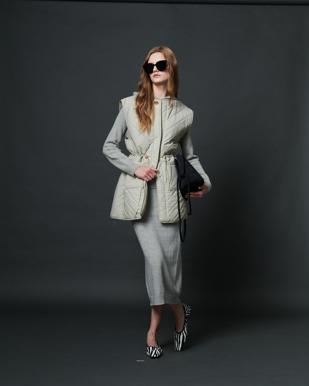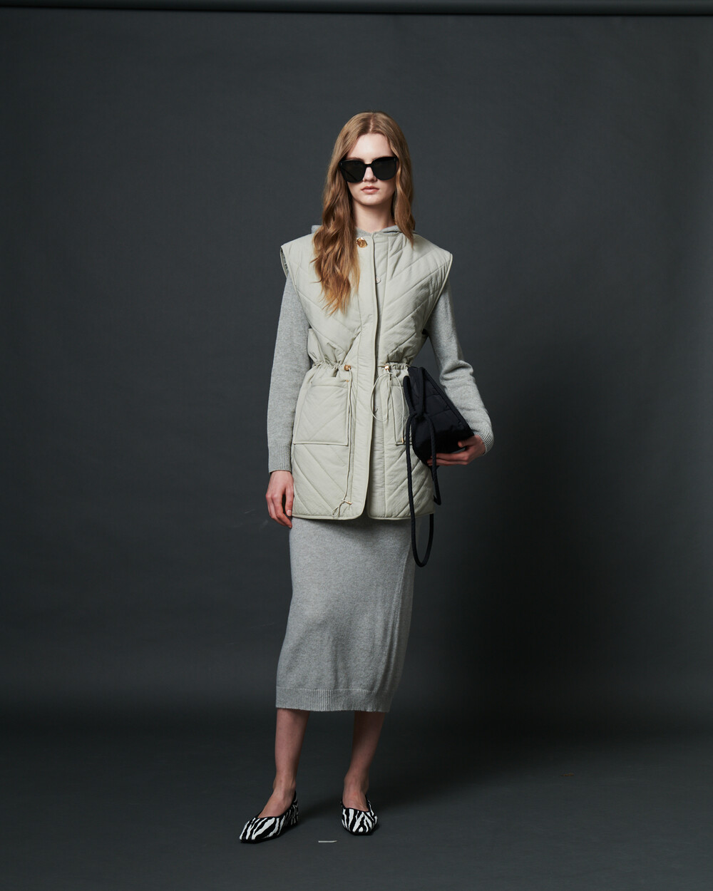 허리부분의 스트링으로 실루엣조절이 가능한 패딩롱베스트입니다.