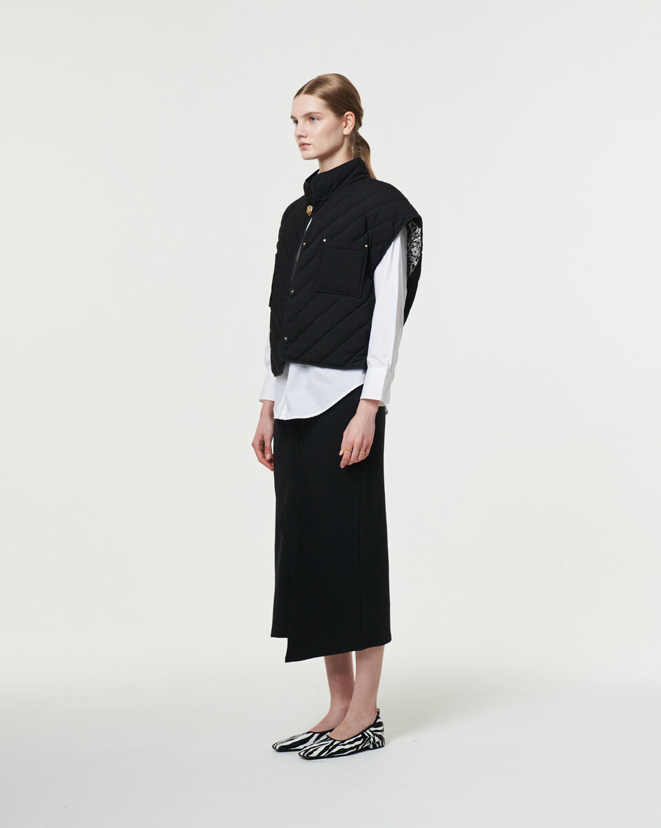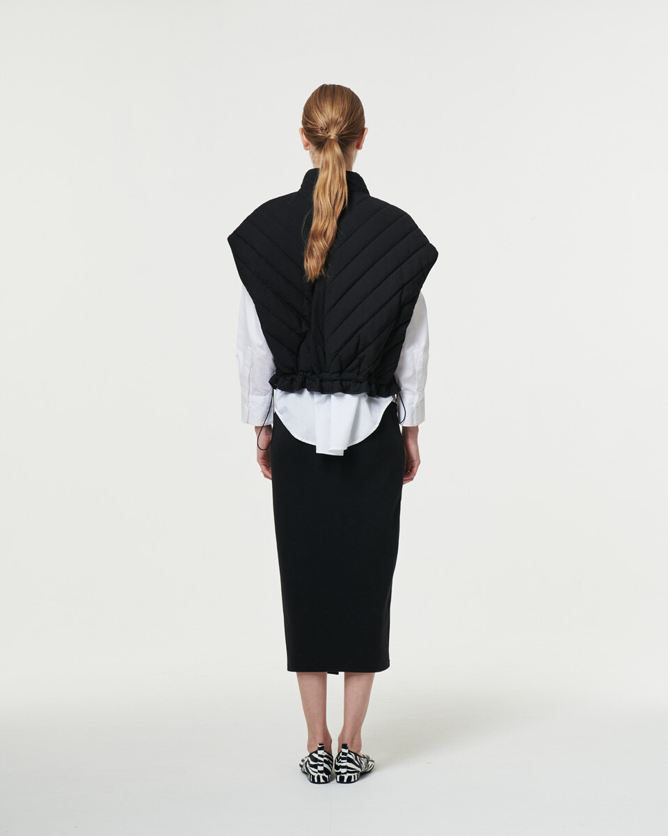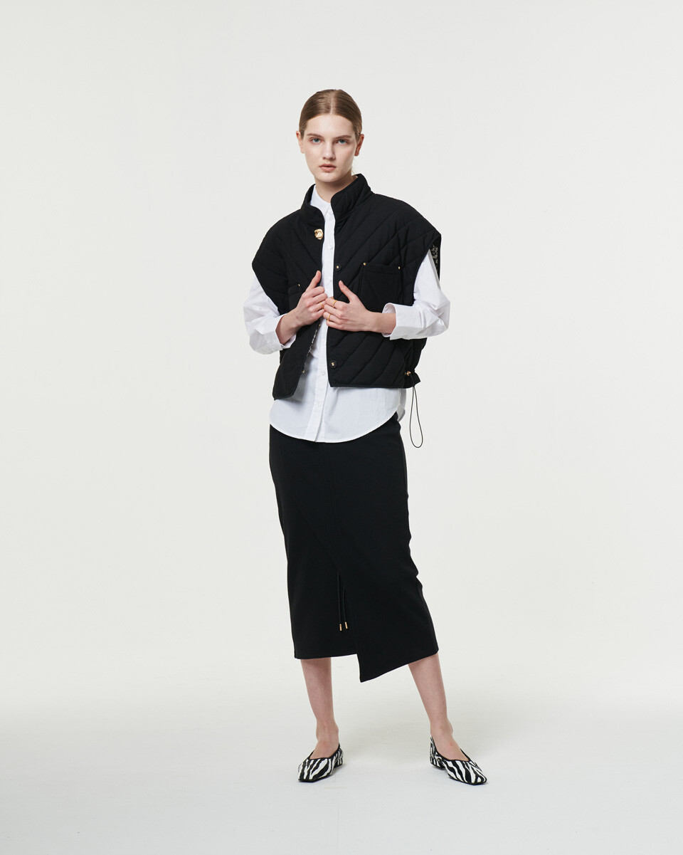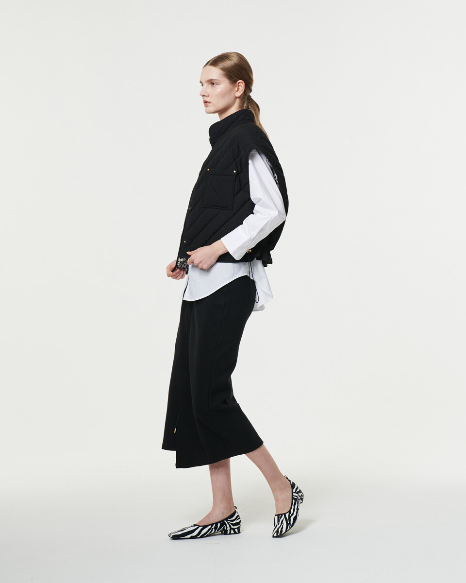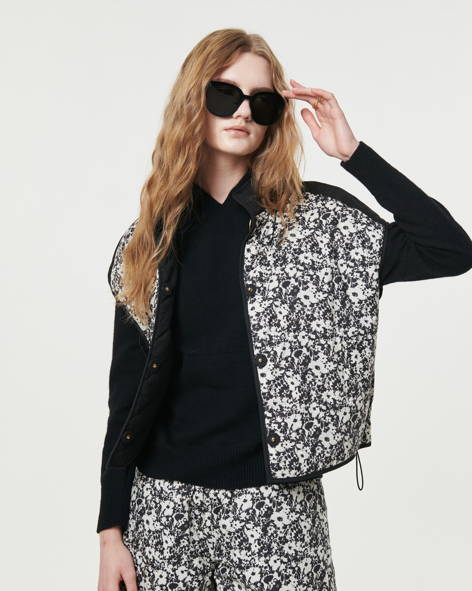 퀼팅된 블랙색상 베스트와 프린트베스트로 연출 가능한 활용도 높은 리버서블 베스트입니다.