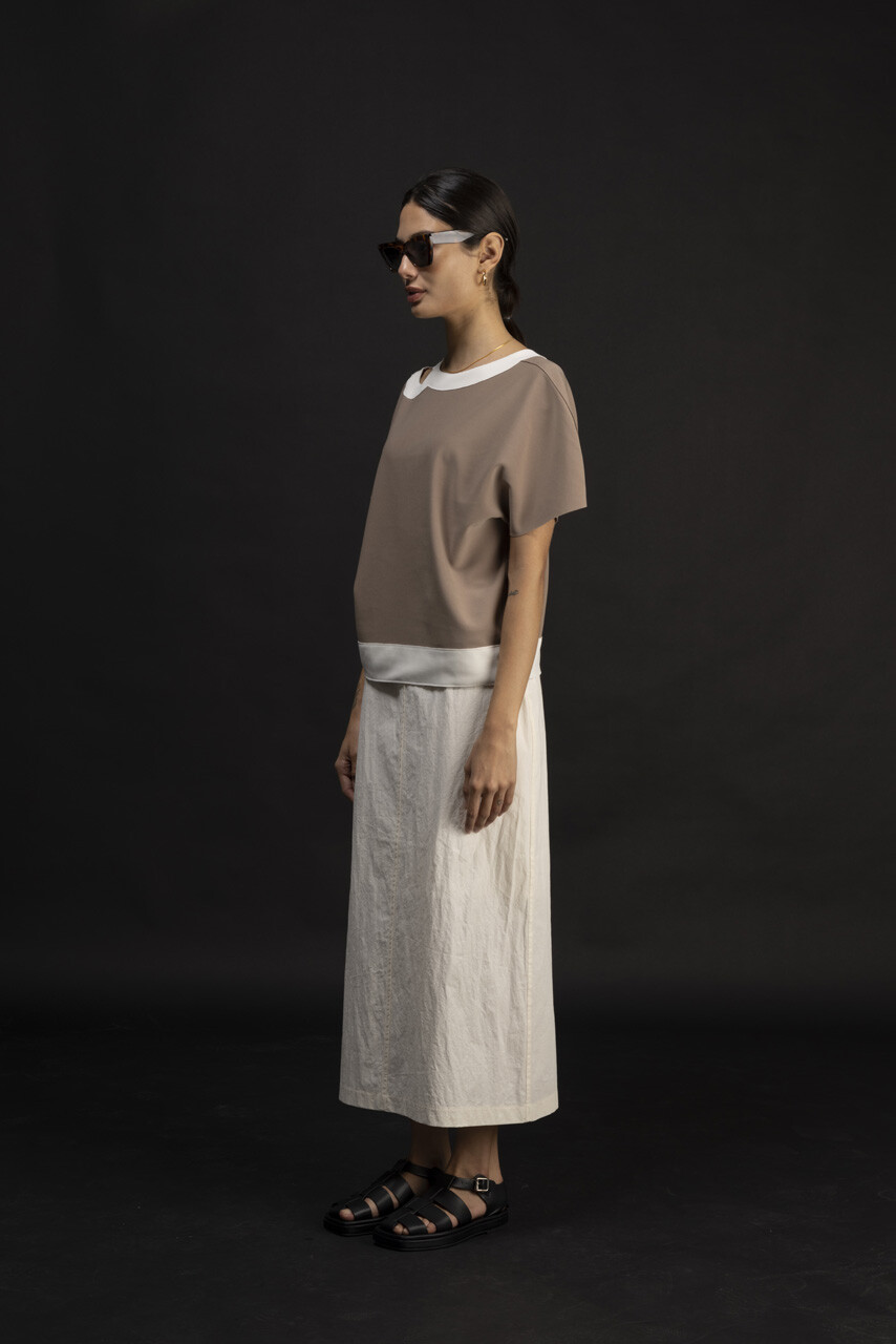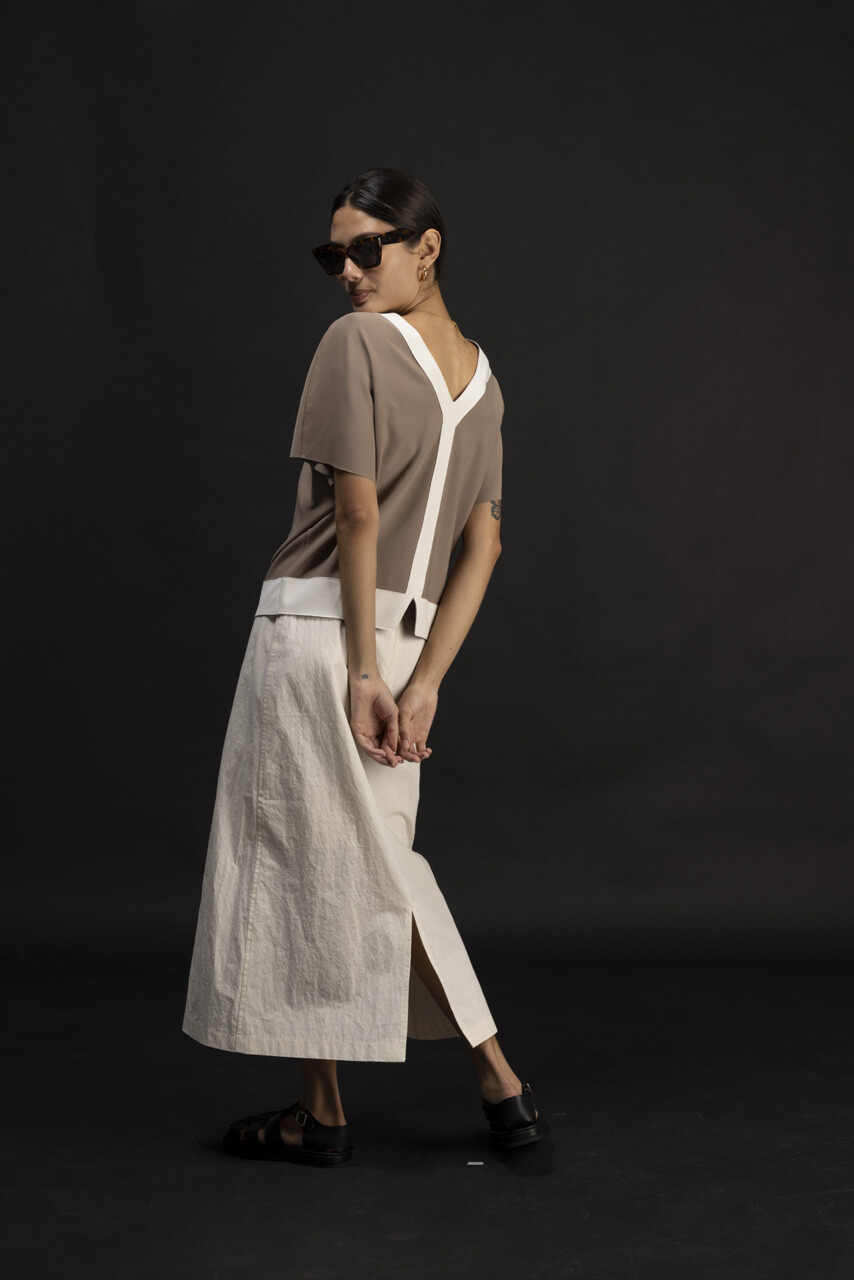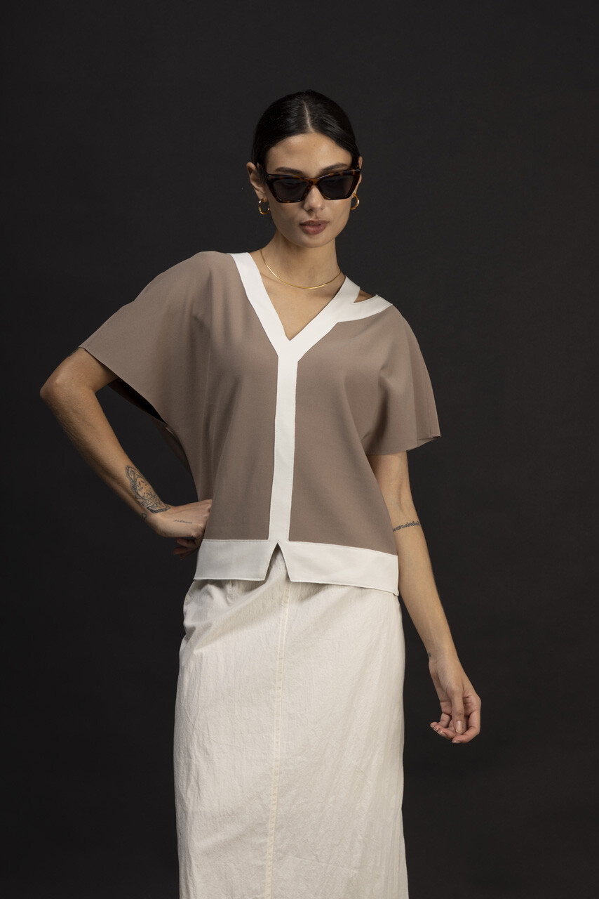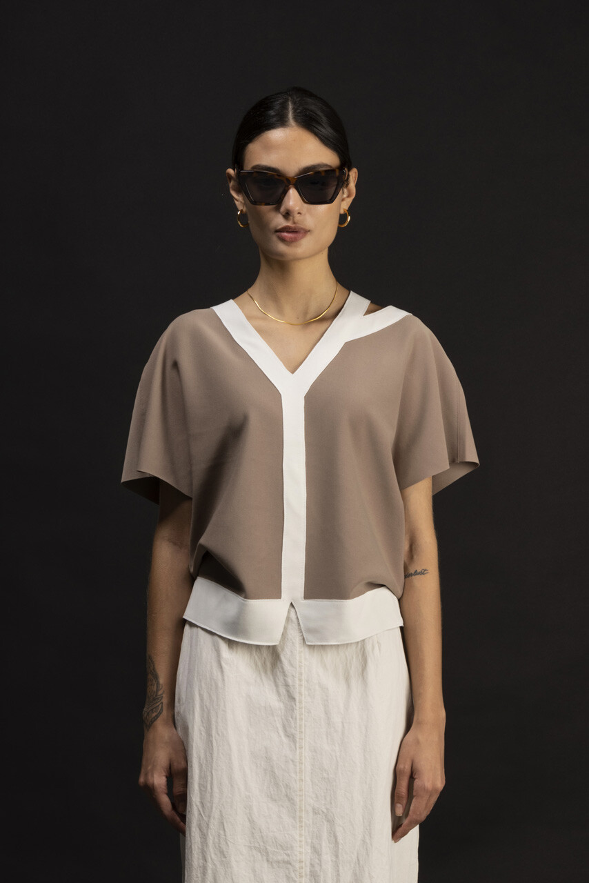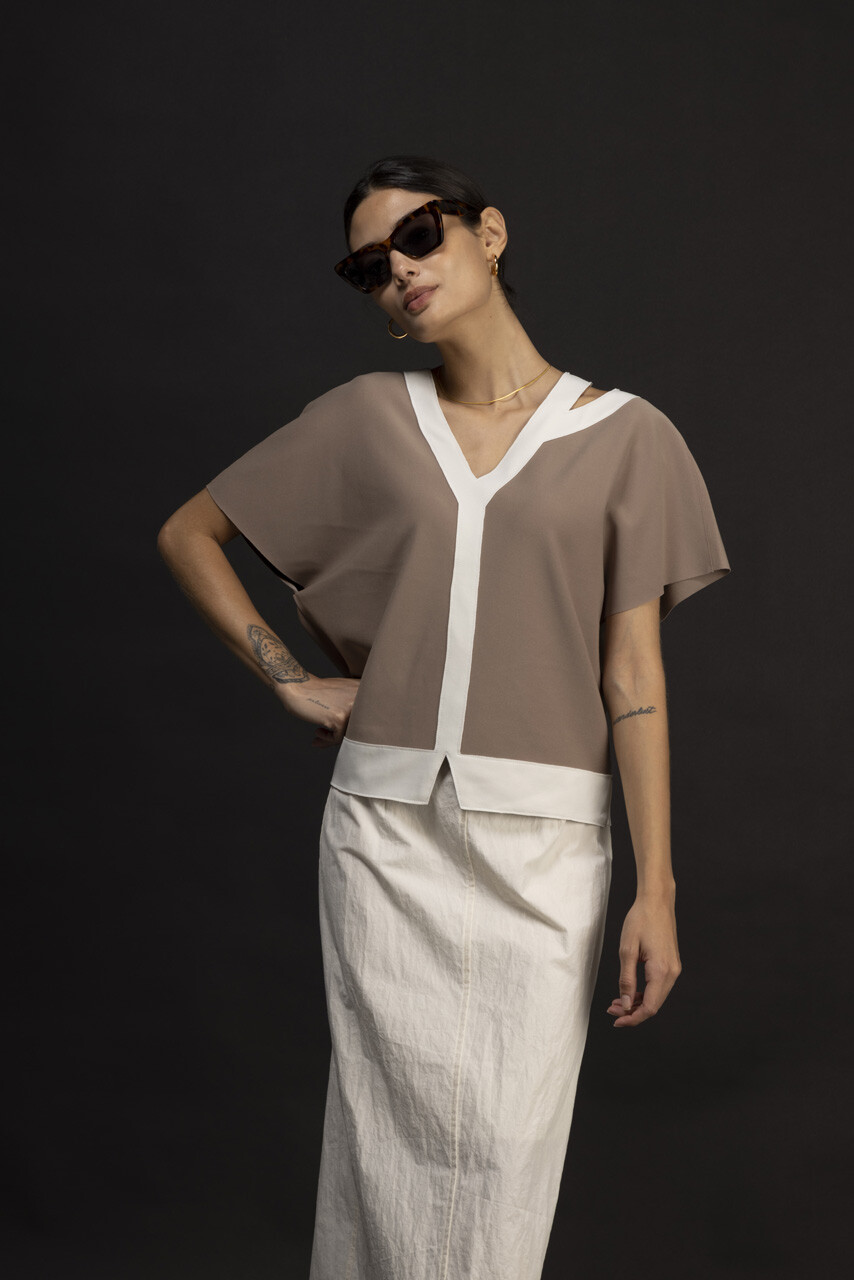 상의의 실루엣이 여유로와 앞,뒤 구분 없이 두가지 타입의 네크라인을 선택하여 착용할 수 있는 탑 입니다.