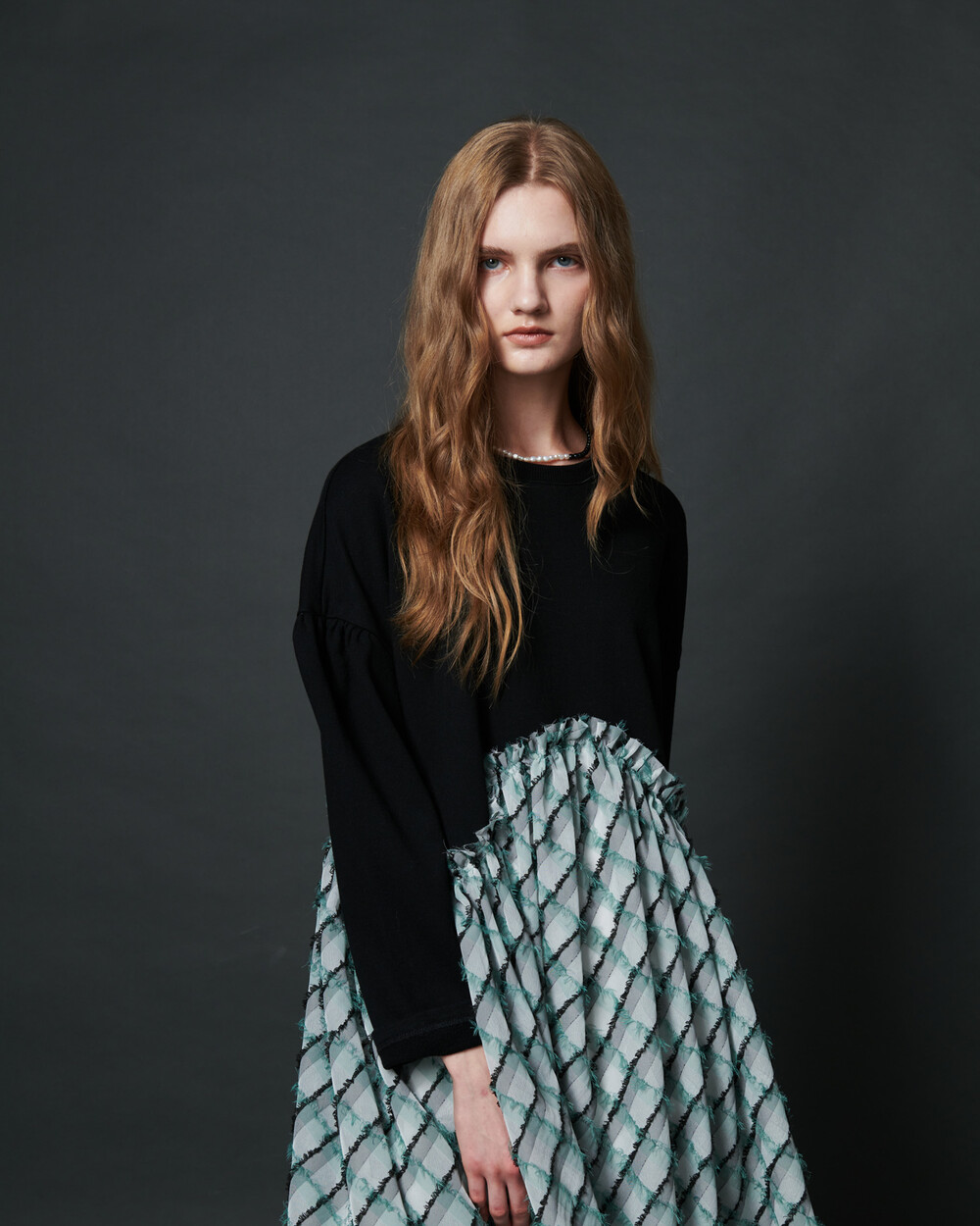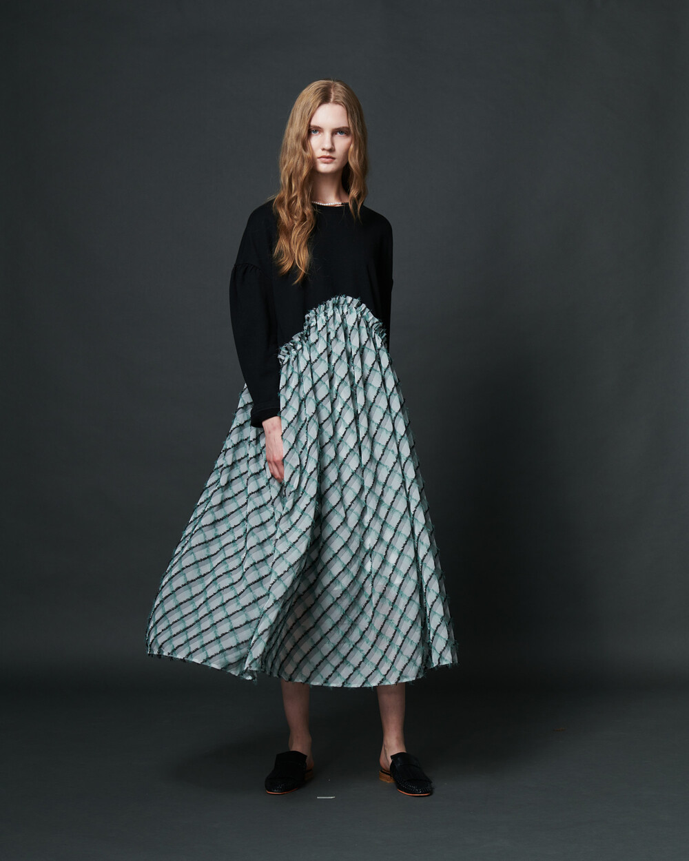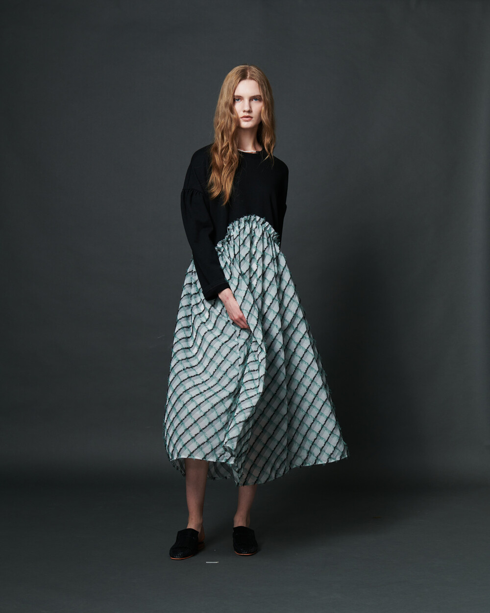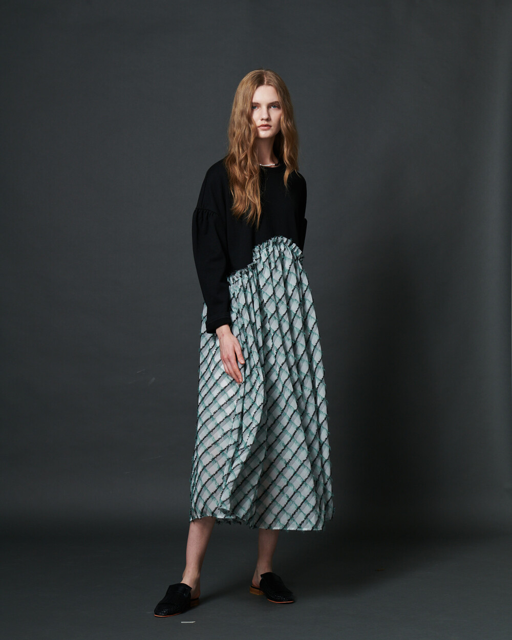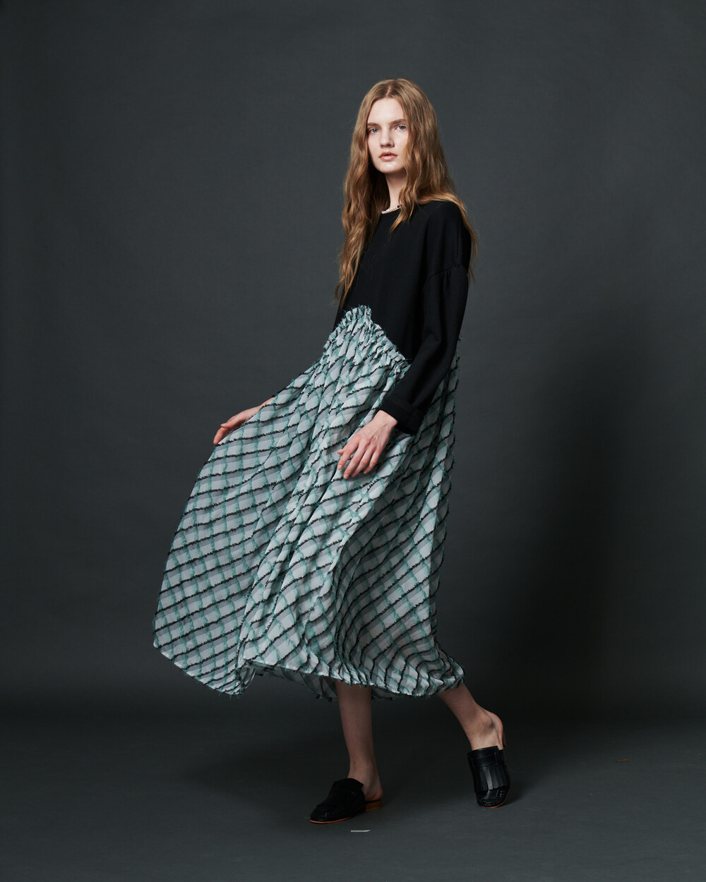 시즌을 잘 표현하고 있는 독특하고 고급스러운 체크원단과 저지원단의 조화가 캐쥬얼하면서도 드라마틱한 분위기를 연출 할 수 있는 아이템입니다. 스커트부분에 안감이 있습니다.