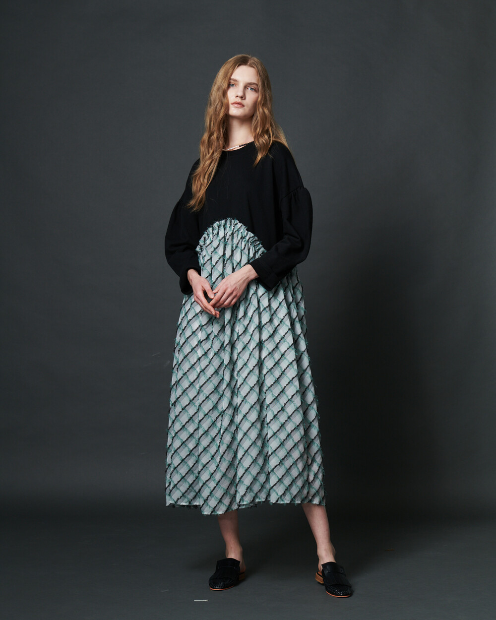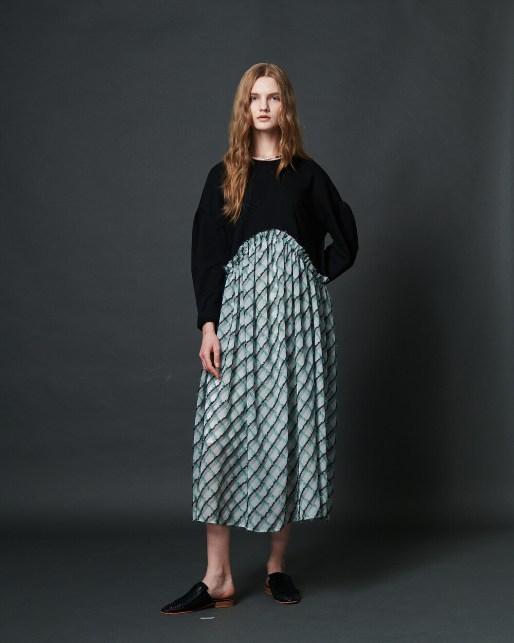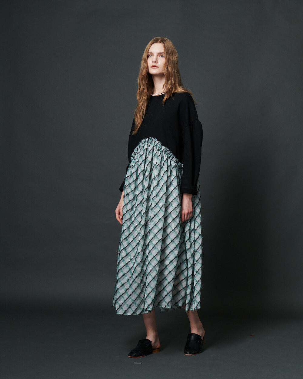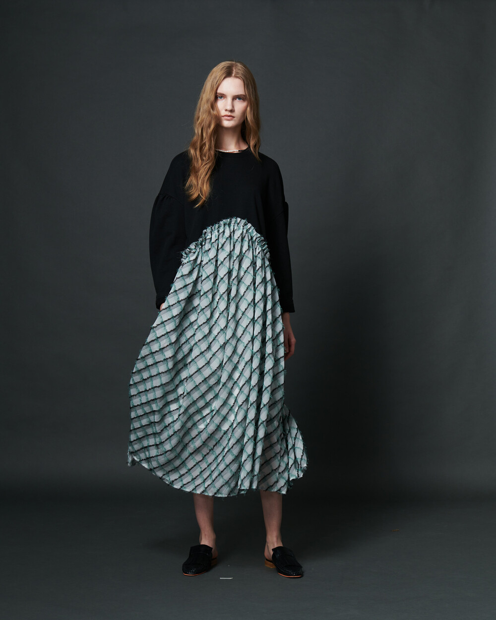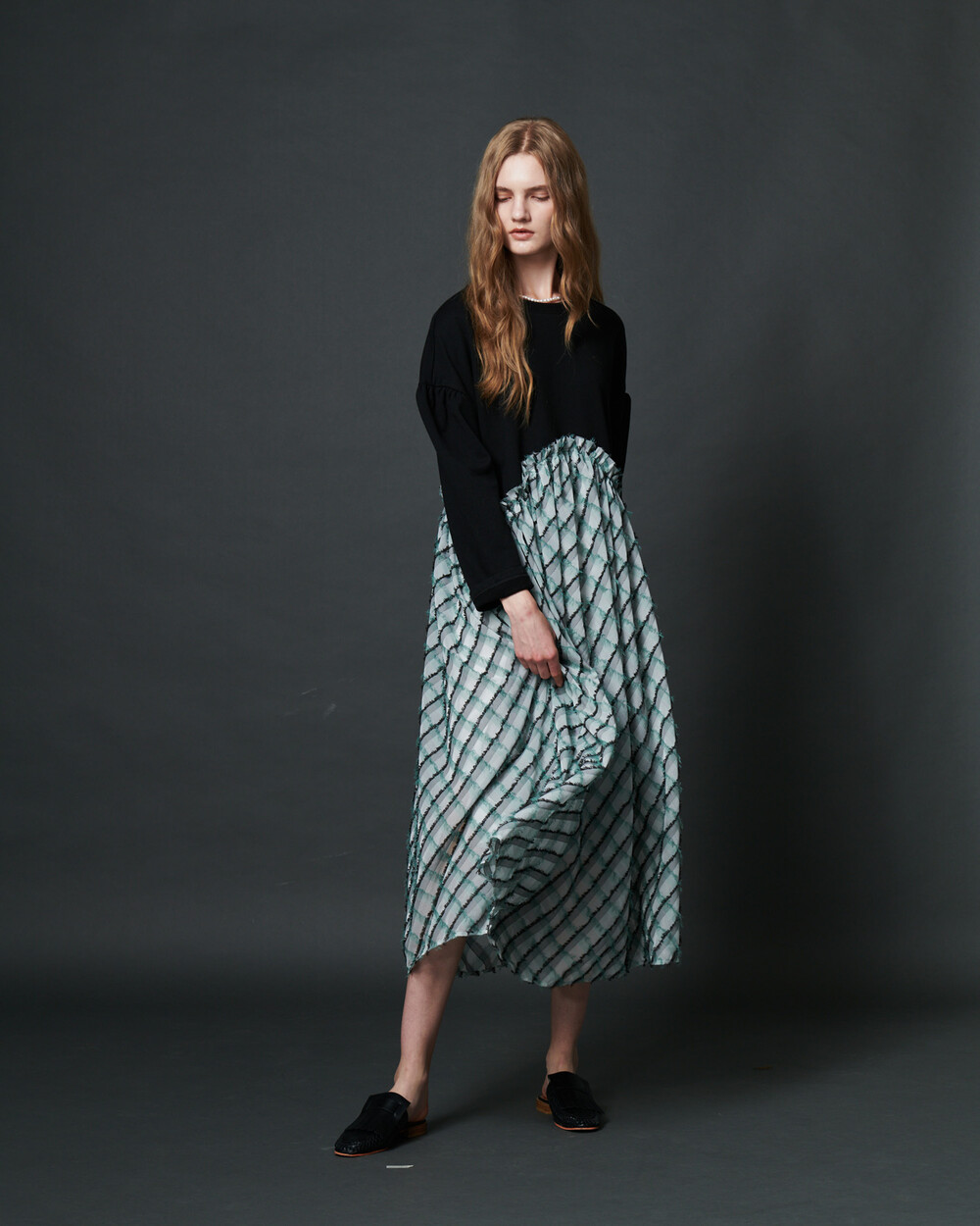 시즌을 잘 표현하고 있는 독특하고 고급스러운 체크원단과 저지원단의 조화가 캐쥬얼하면서도 드라마틱한 분위기를 연출 할 수 있는 아이템입니다. 스커트부분에 안감이 있습니다.