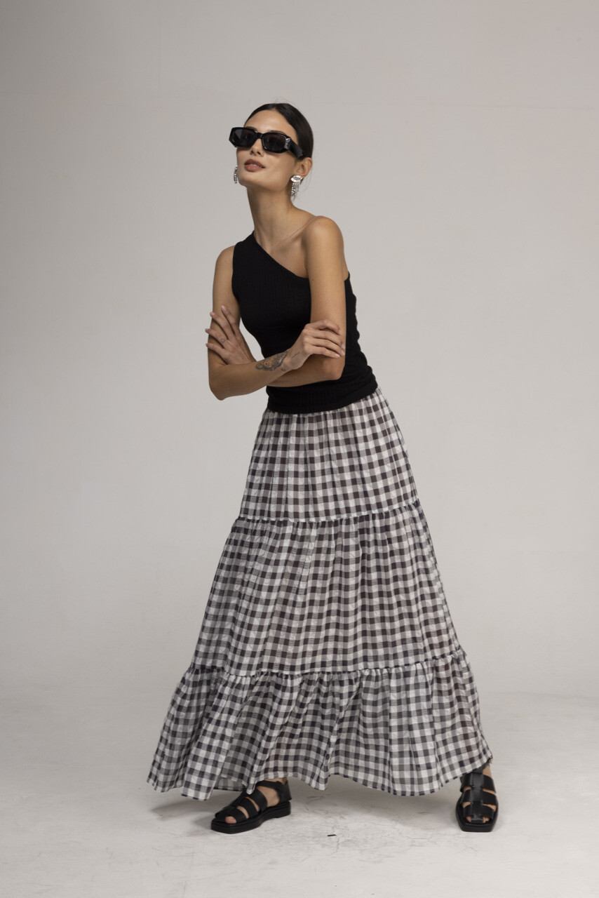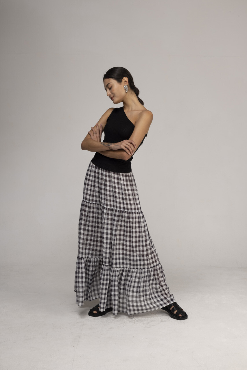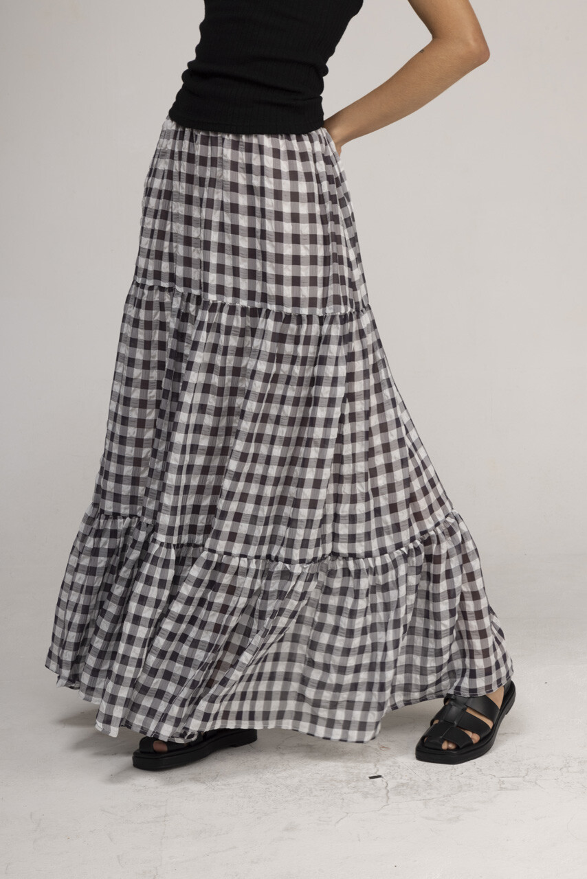 깅엄패턴 소재로 만들어진 3단 셔링의 A라인 실루엣 스커트입니다.