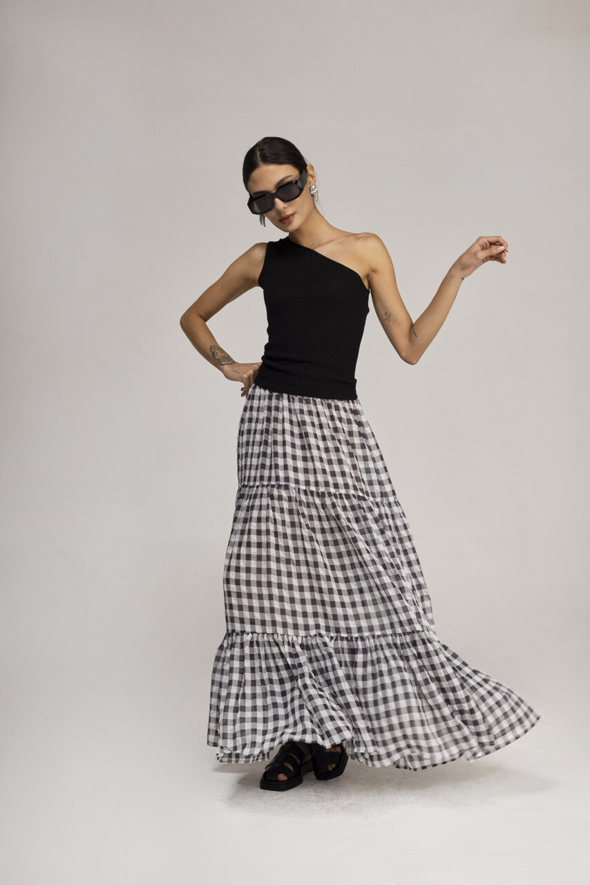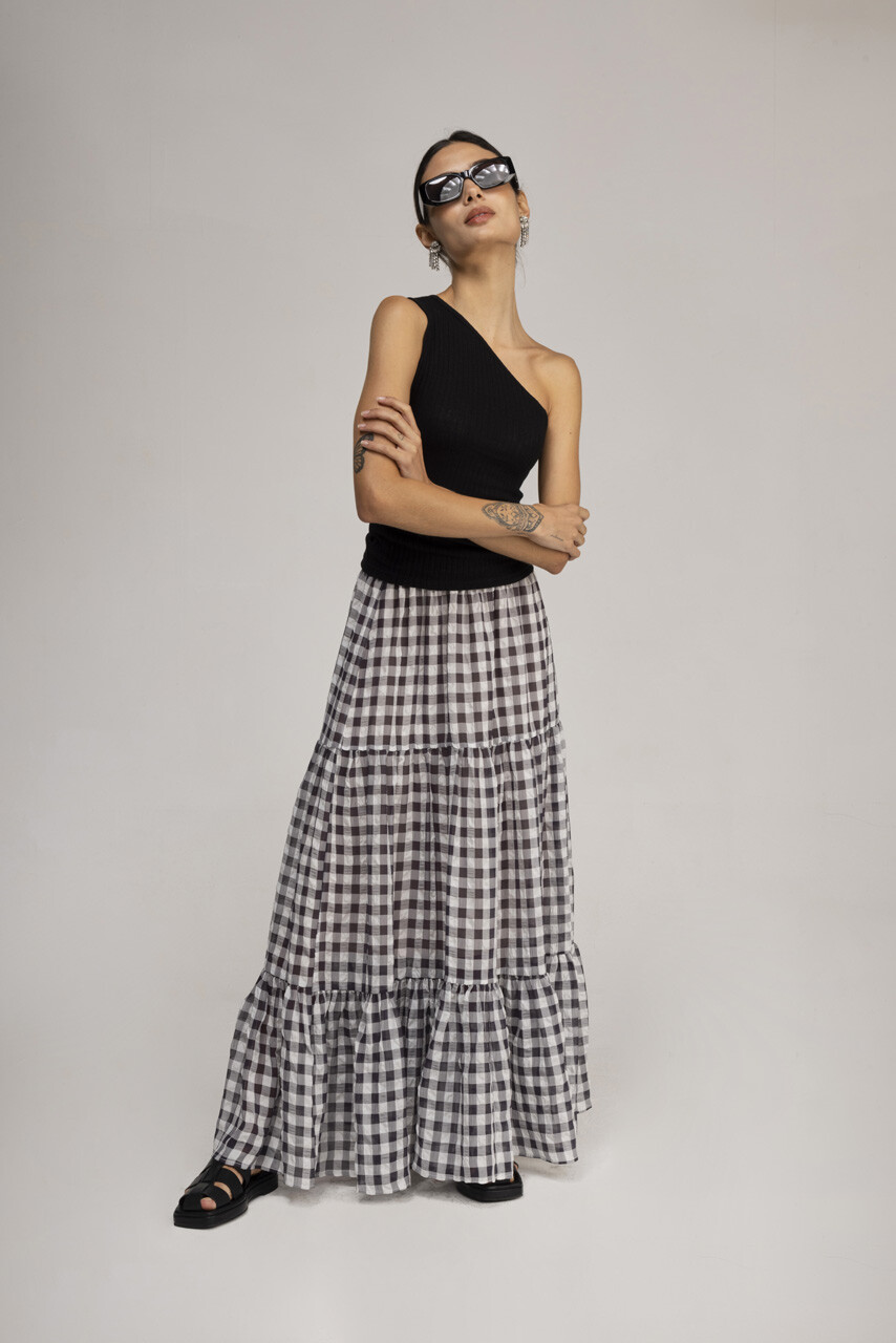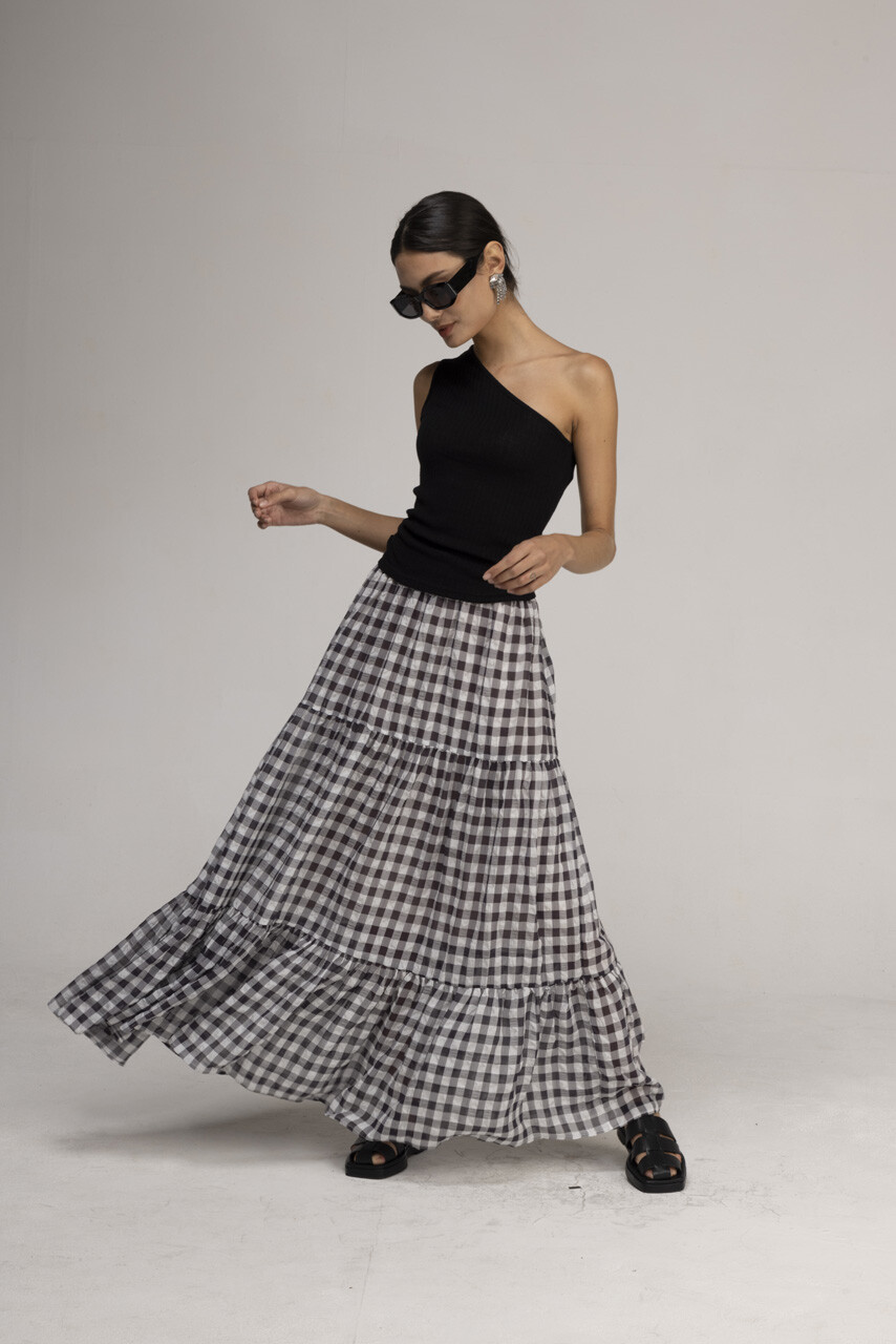깅엄패턴 소재로 만들어진 3단 셔링의 A라인 실루엣 스커트입니다.