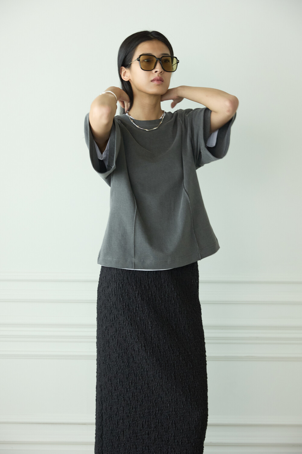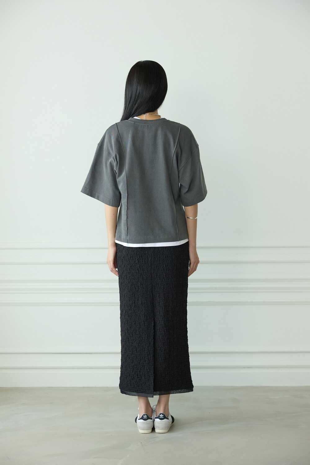 피그먼트 워싱 된 쭈리 원단으로 제작된 루즈한 핏의 탑입니다.