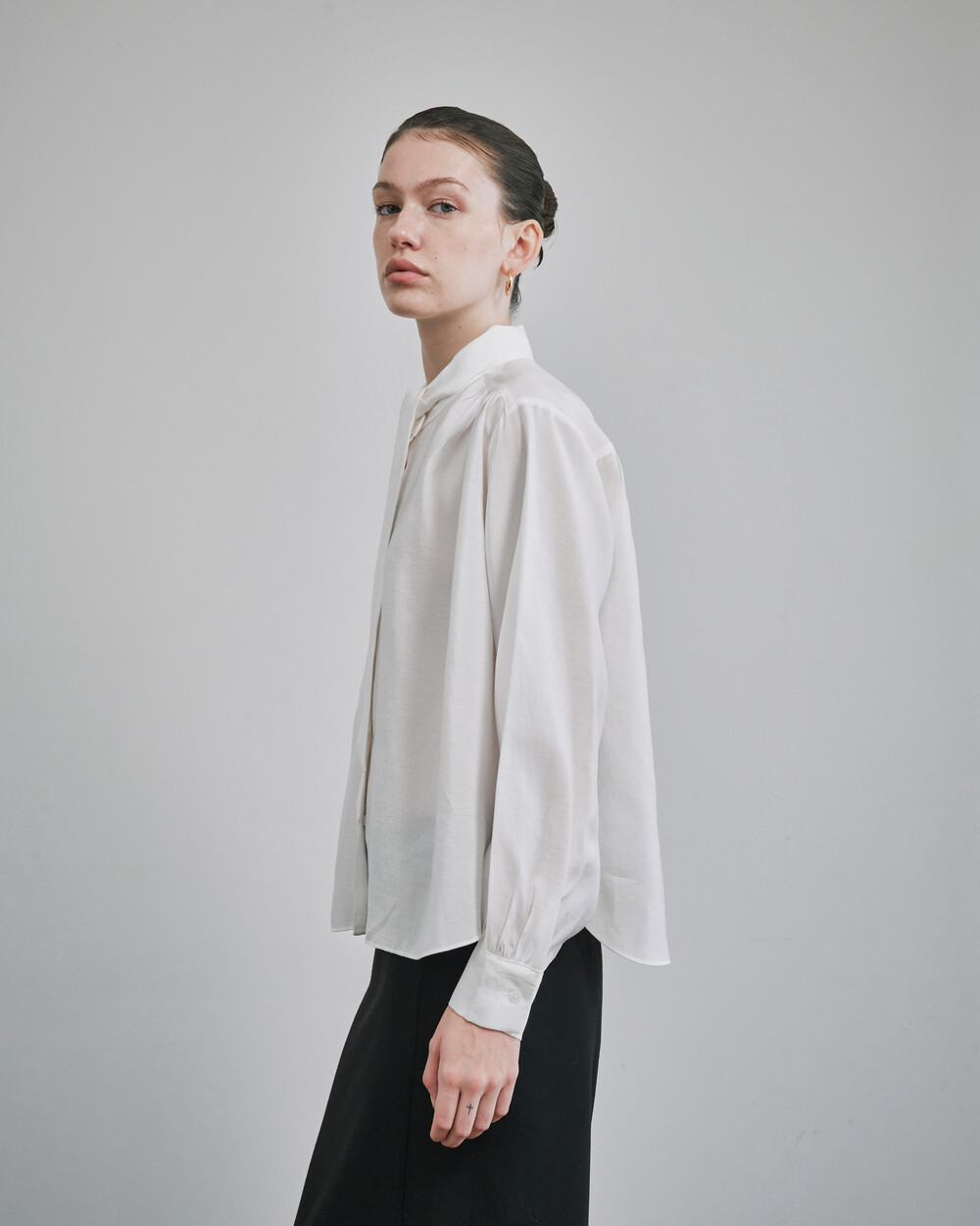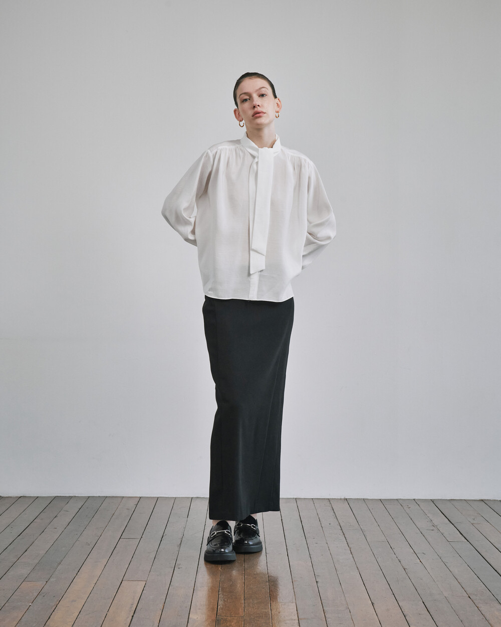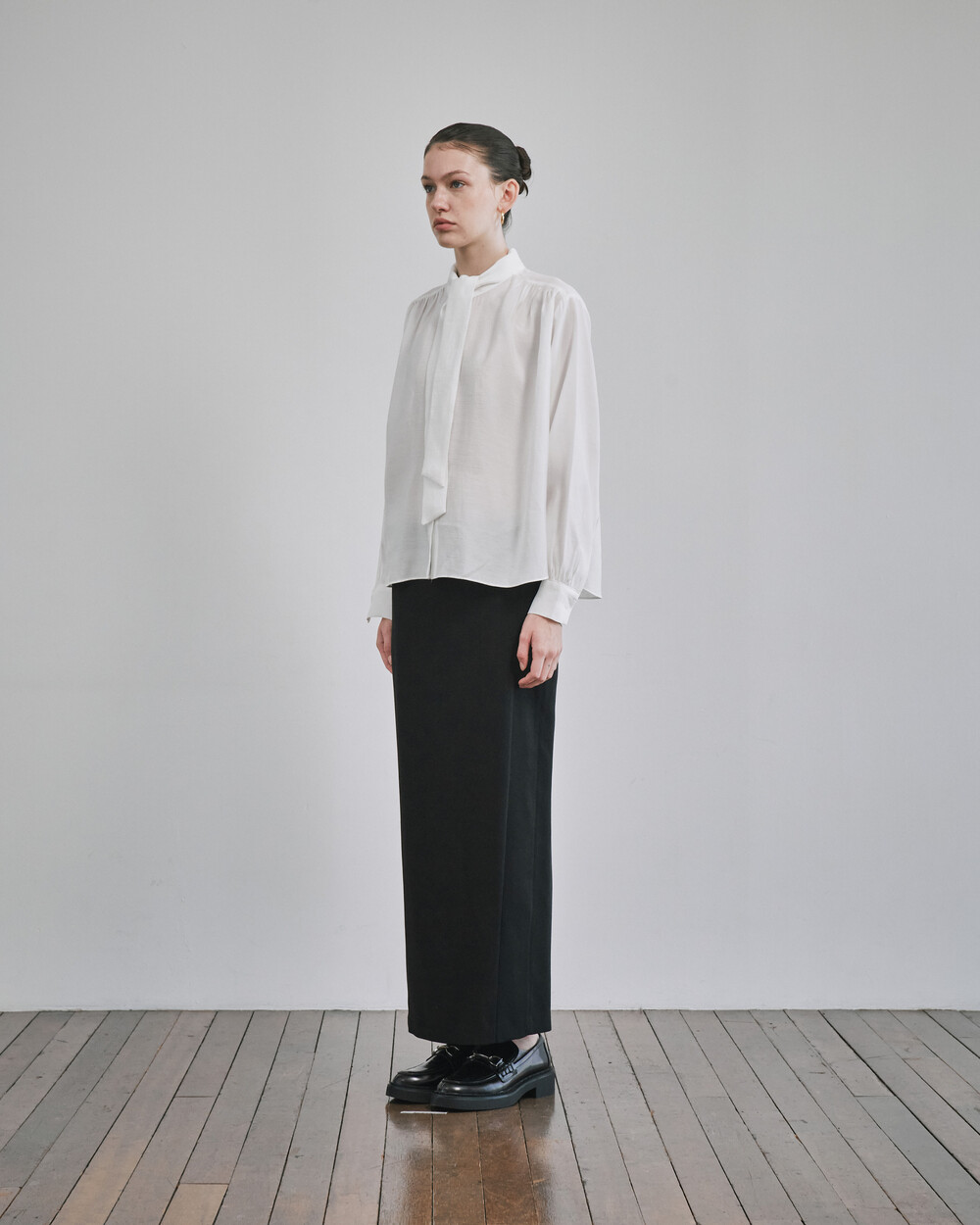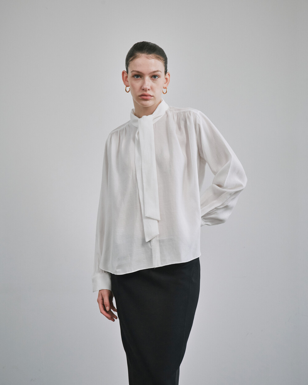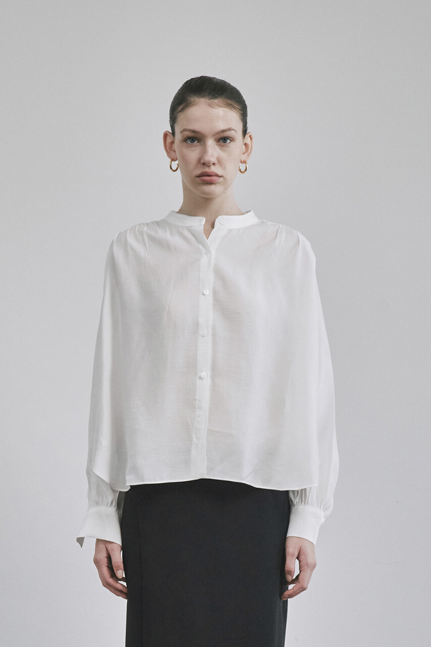목 부분의 타이를 탈부착하여 스탠딩카라와 타이카라, 두가지 연출이 가능한 블라우스입니다.