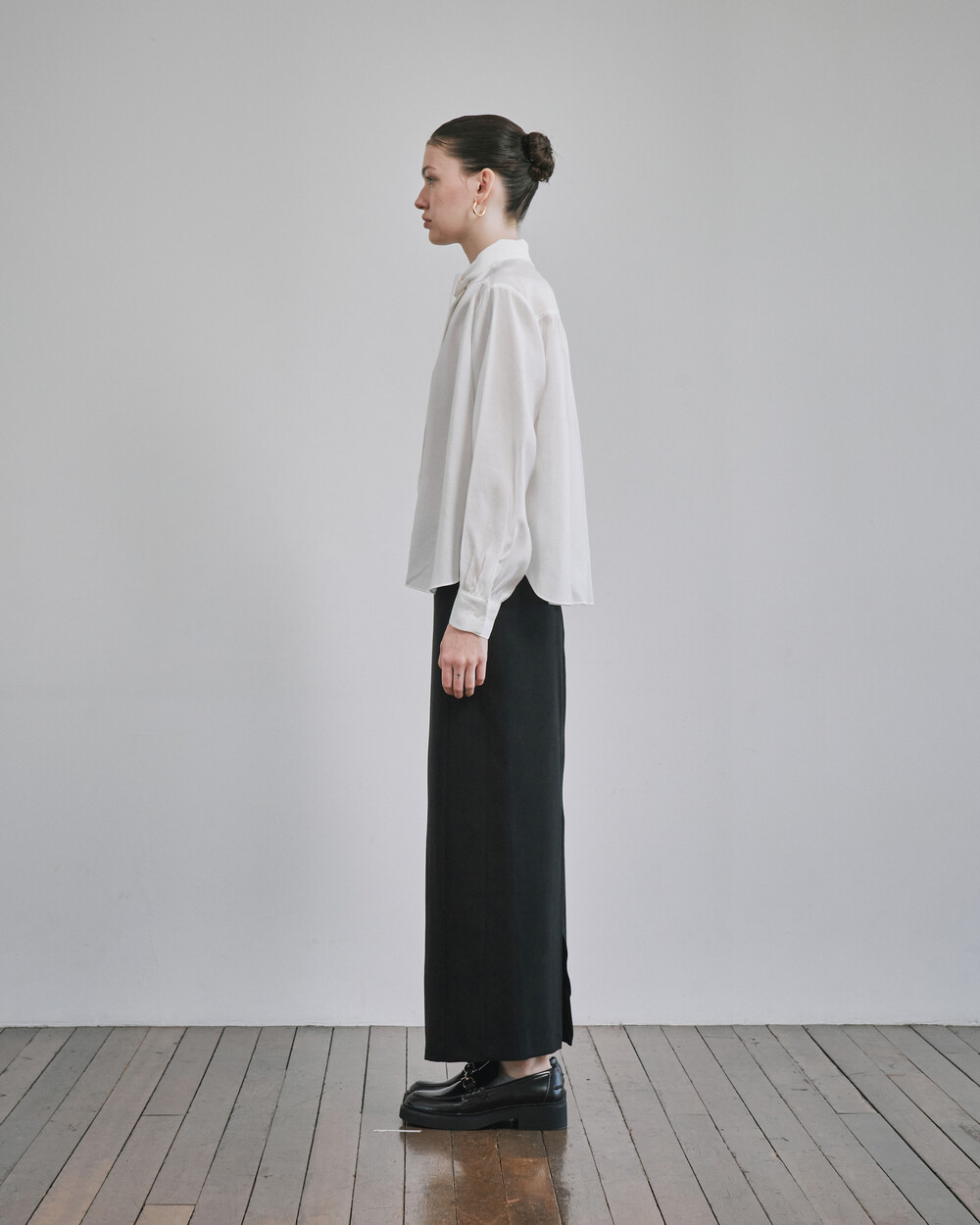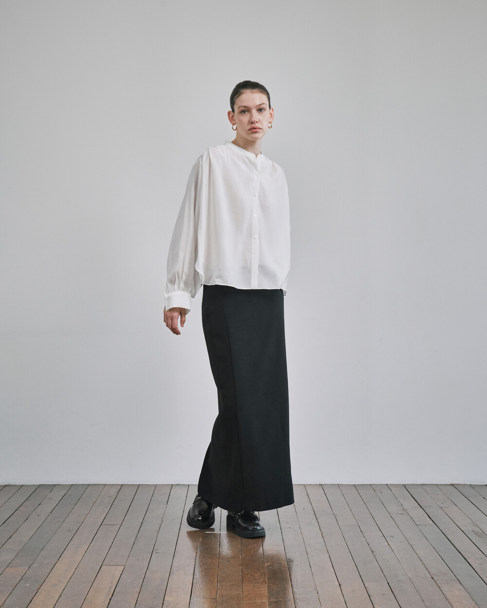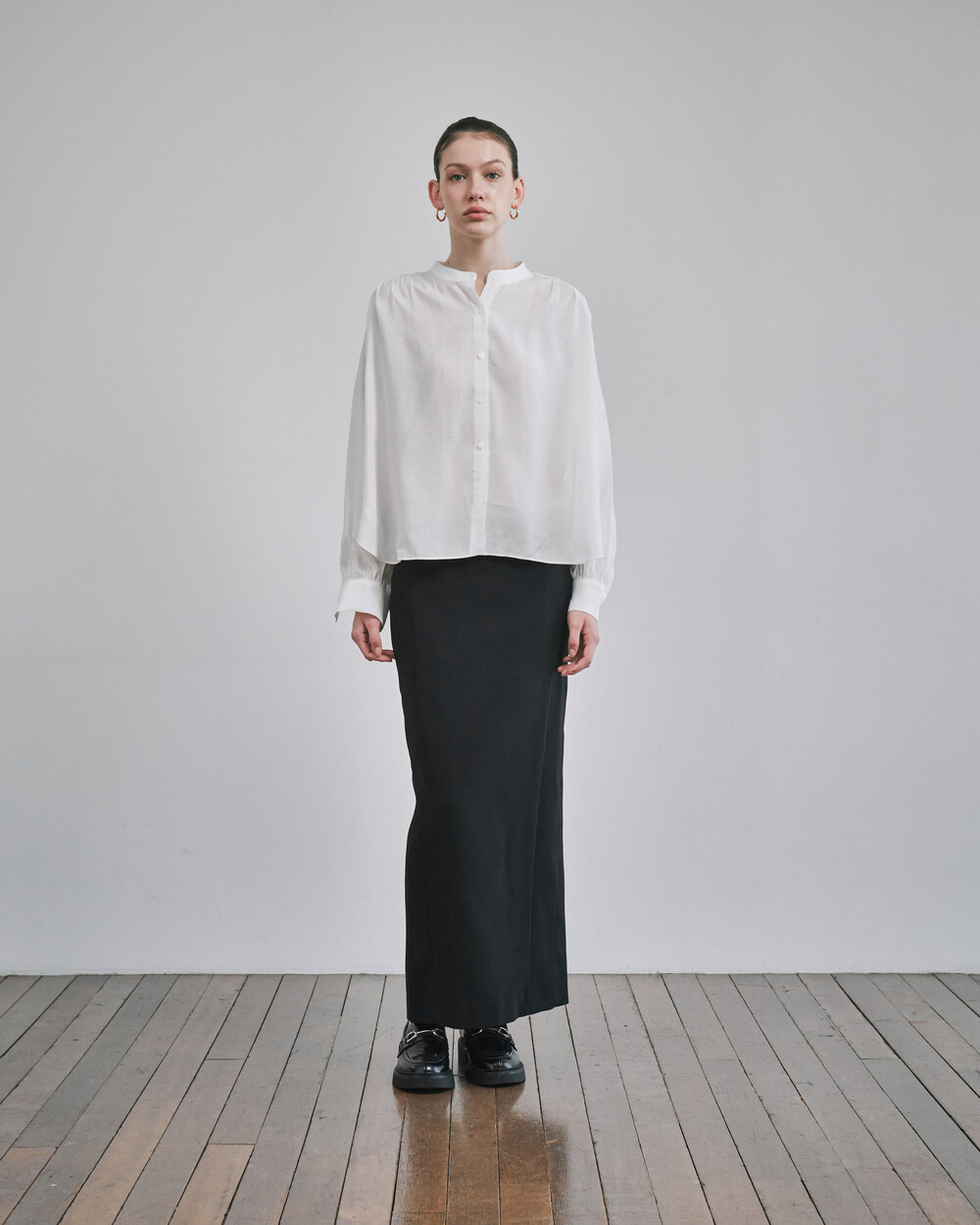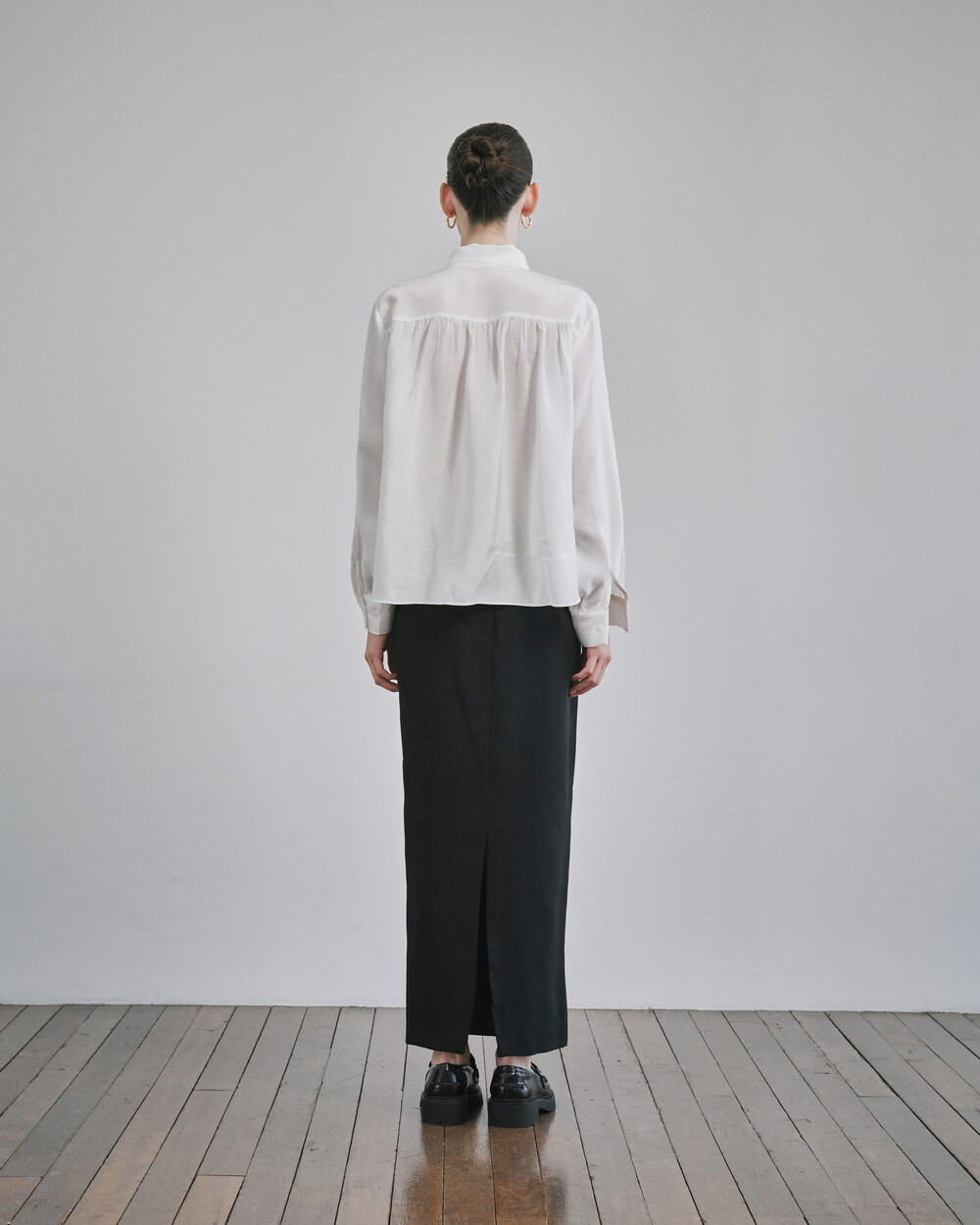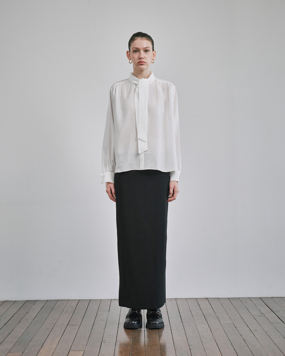 목 부분의 타이를 탈부착하여 스탠딩카라와 타이카라, 두가지 연출이 가능한 블라우스입니다.