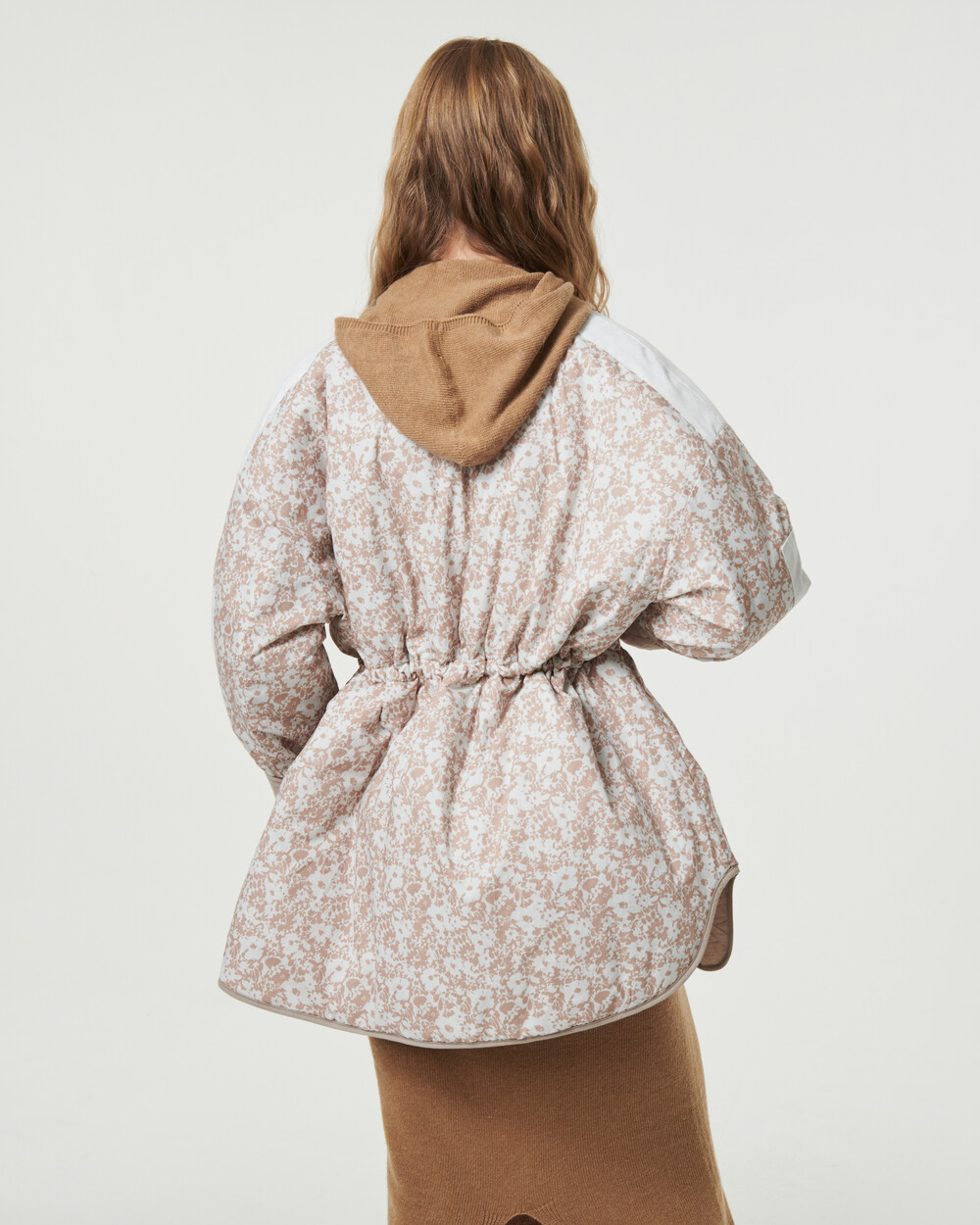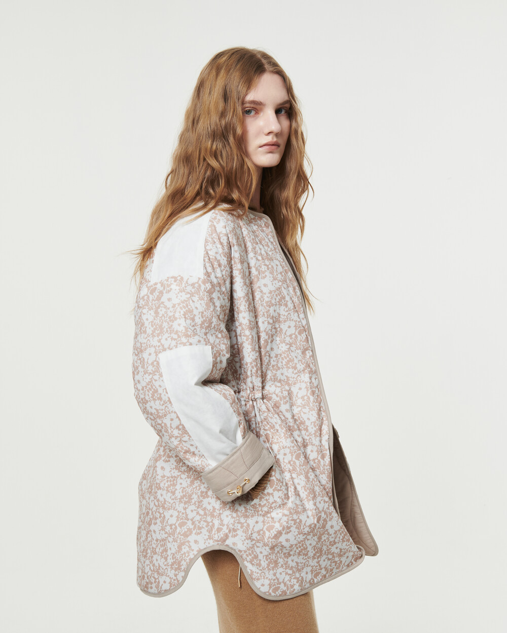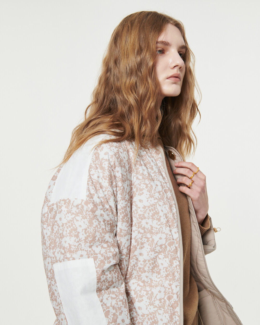 베이지컬러의 패딩원단과 프린트원단 양면으로 착용할 수 있으며,