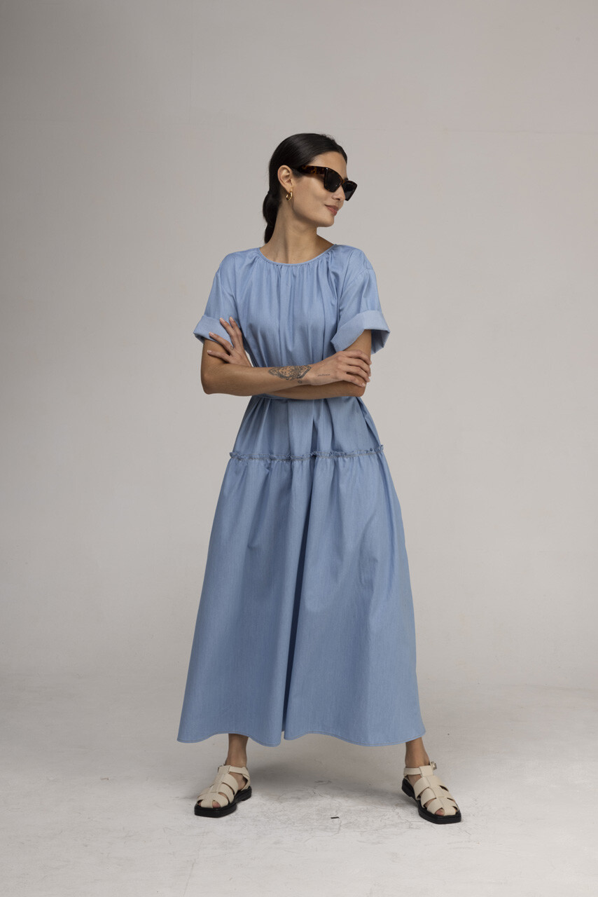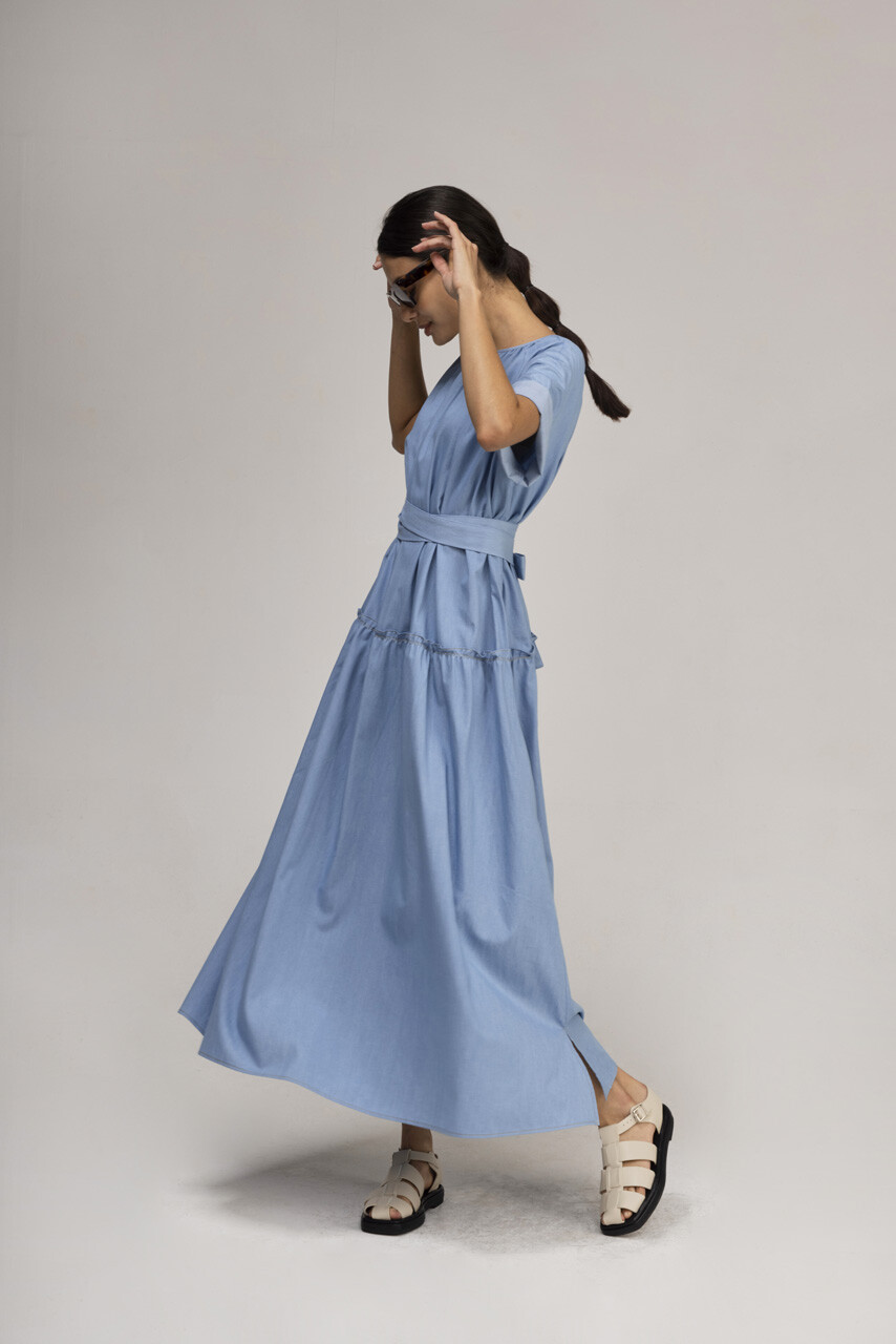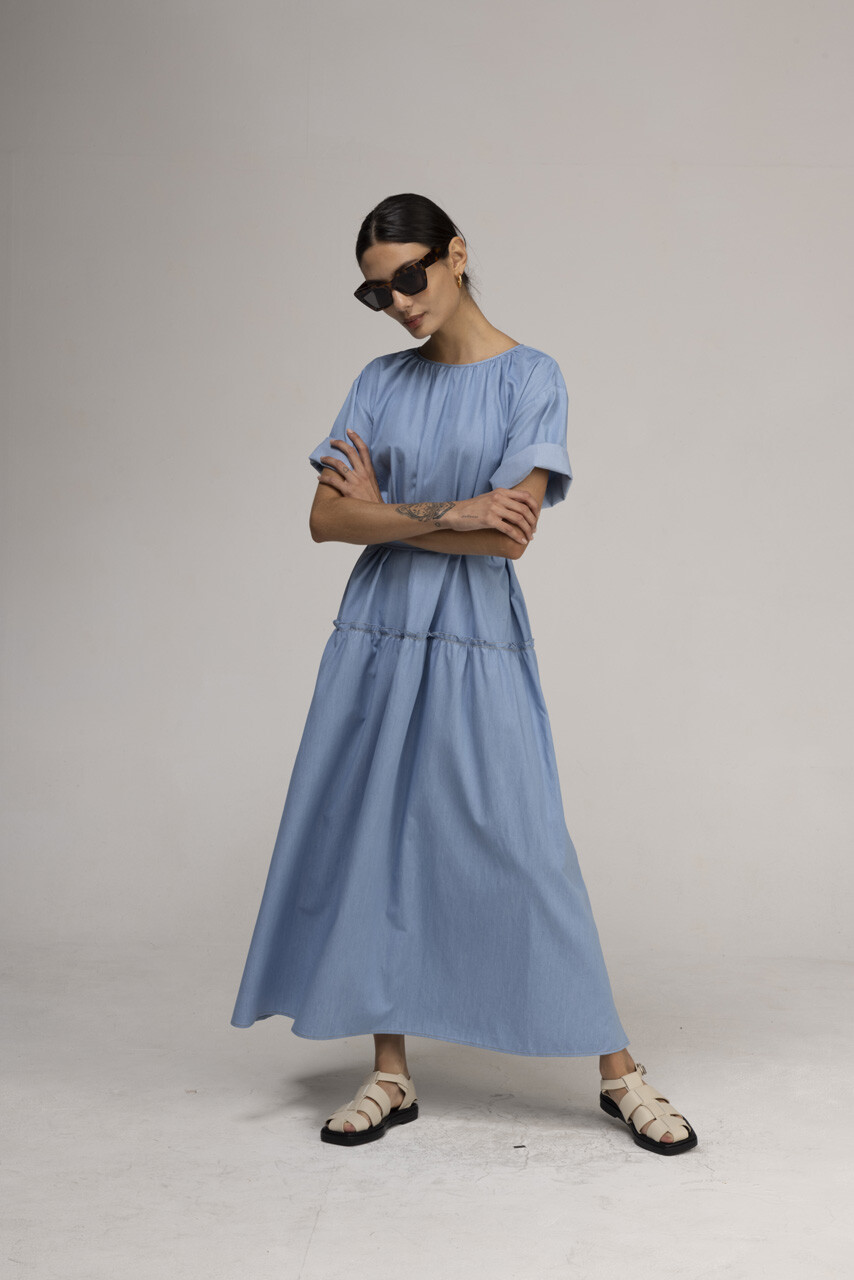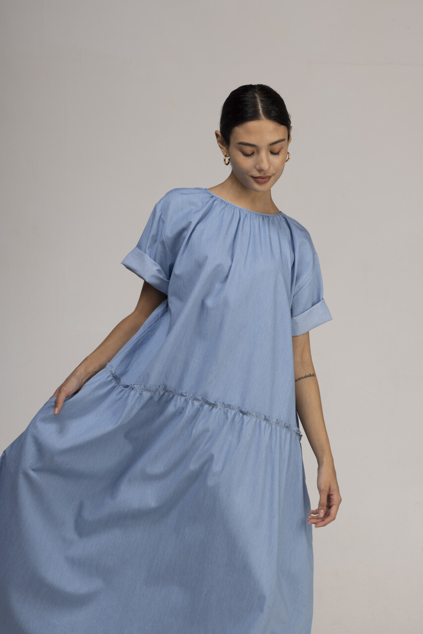 MINNCHAI 의 시그니처 아이템인 카렌듈라 하프슬리브 드레스를 이번 시즌에는 진 소재로 디자인했습니다.