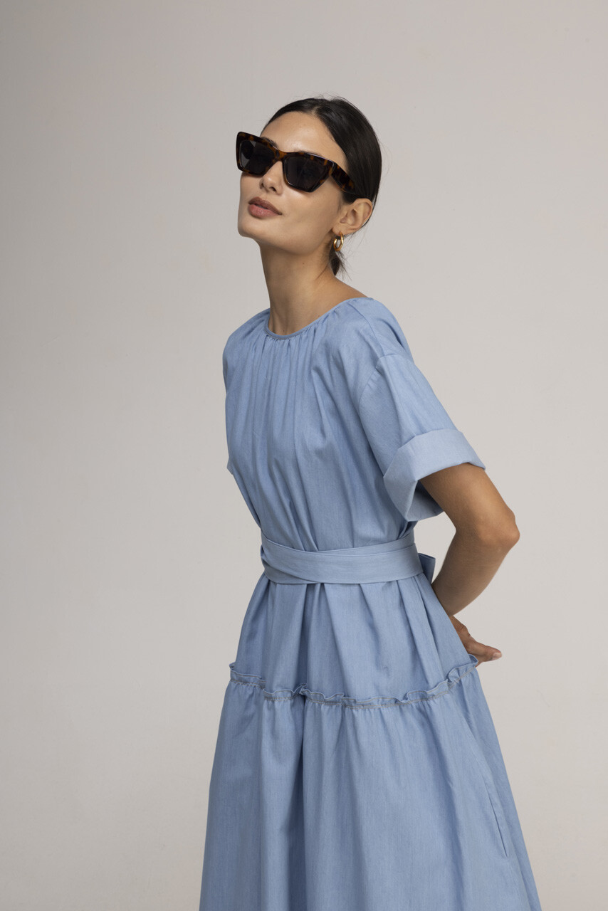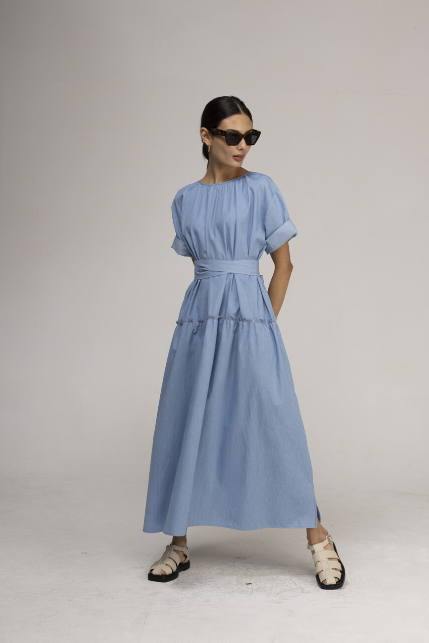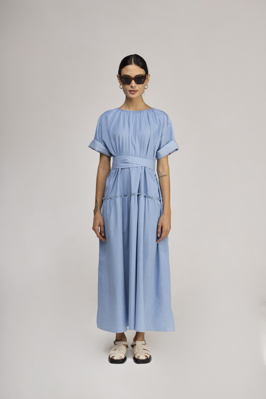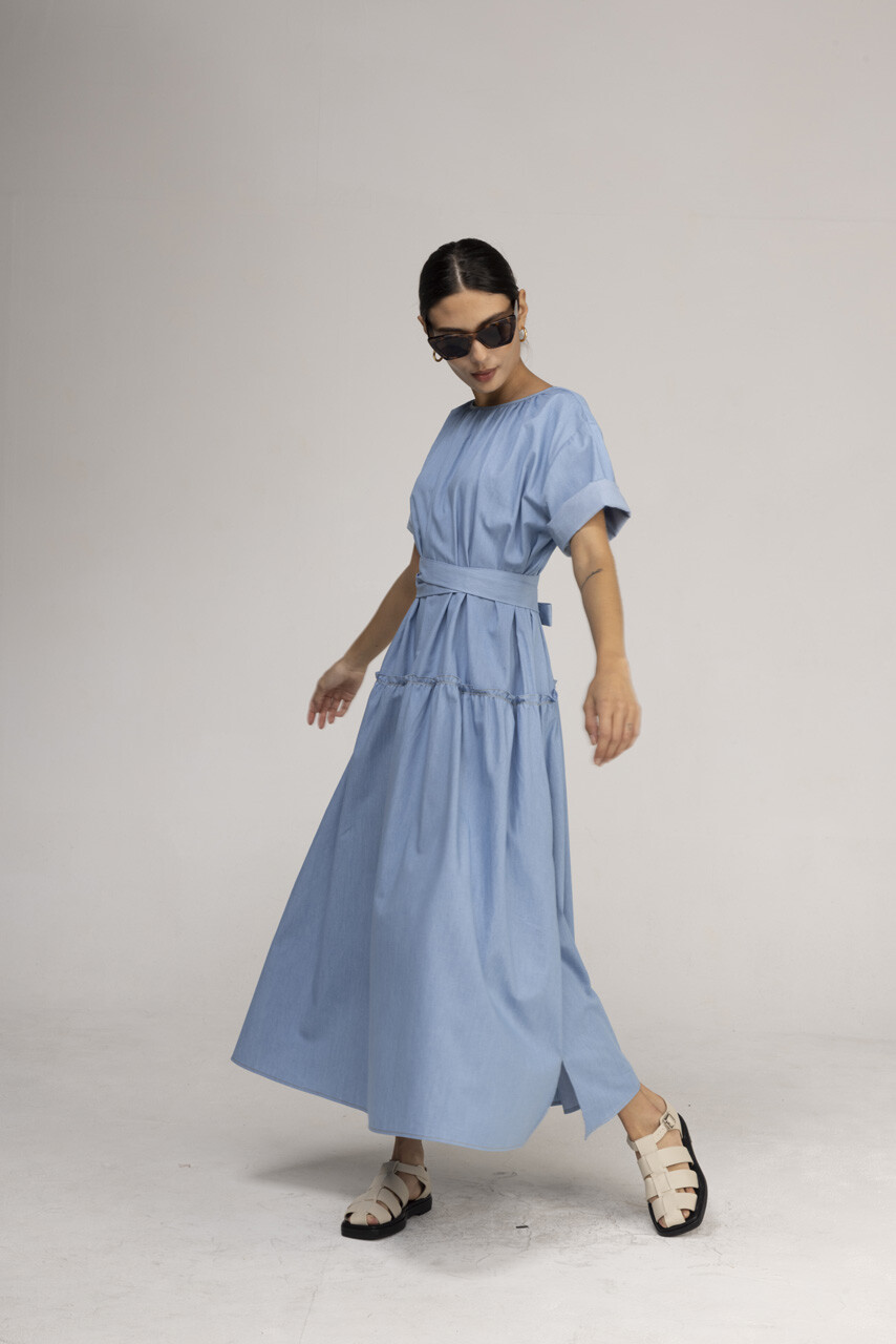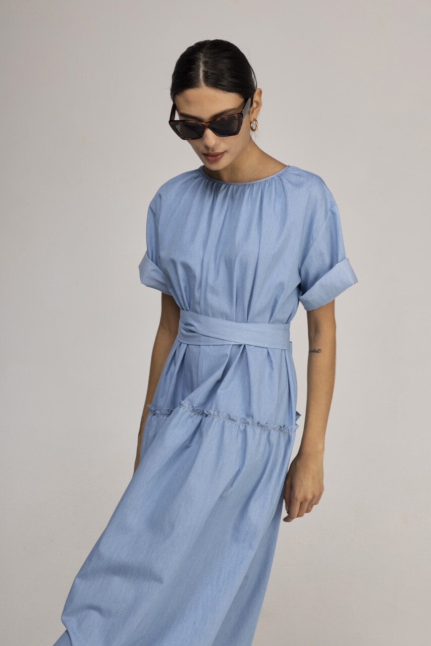 MINNCHAI 의 시그니처 아이템인 카렌듈라 하프슬리브 드레스를 이번 시즌에는 진 소재로 디자인했습니다.