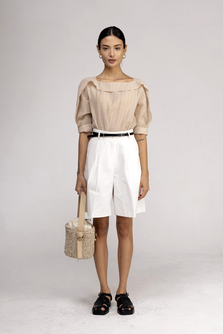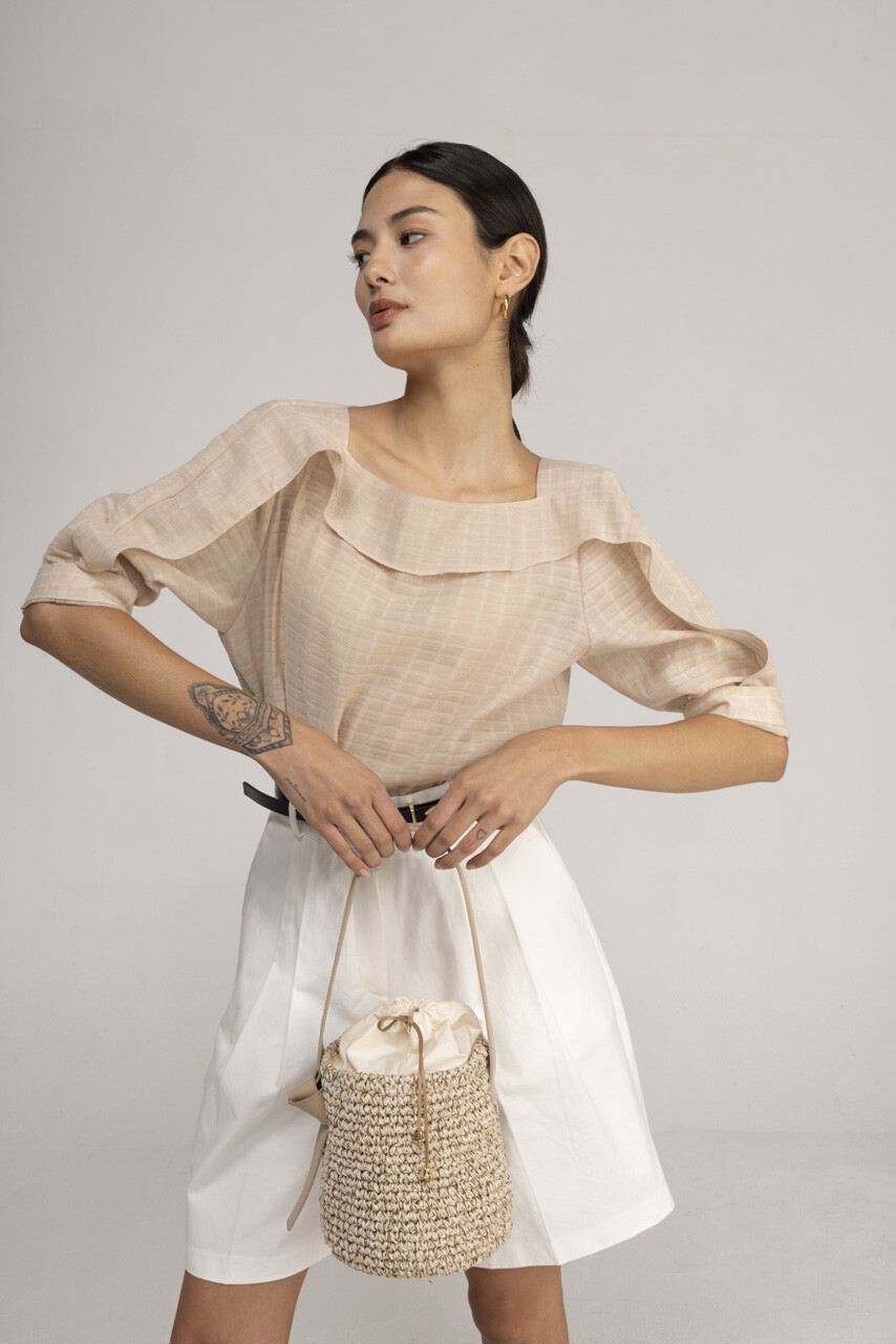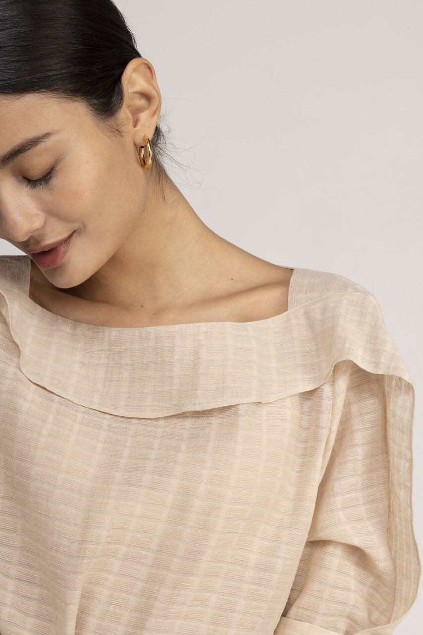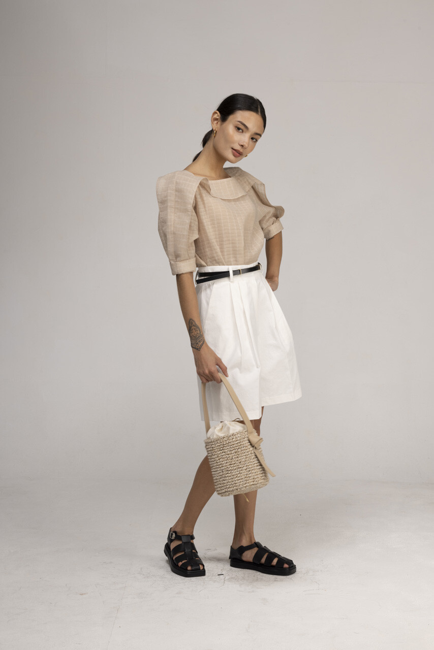 약간의 비침이 있는 조직감이 독특한 소재로 디자인 한 프레임 셔츠블라우스의 여름버전입니다.