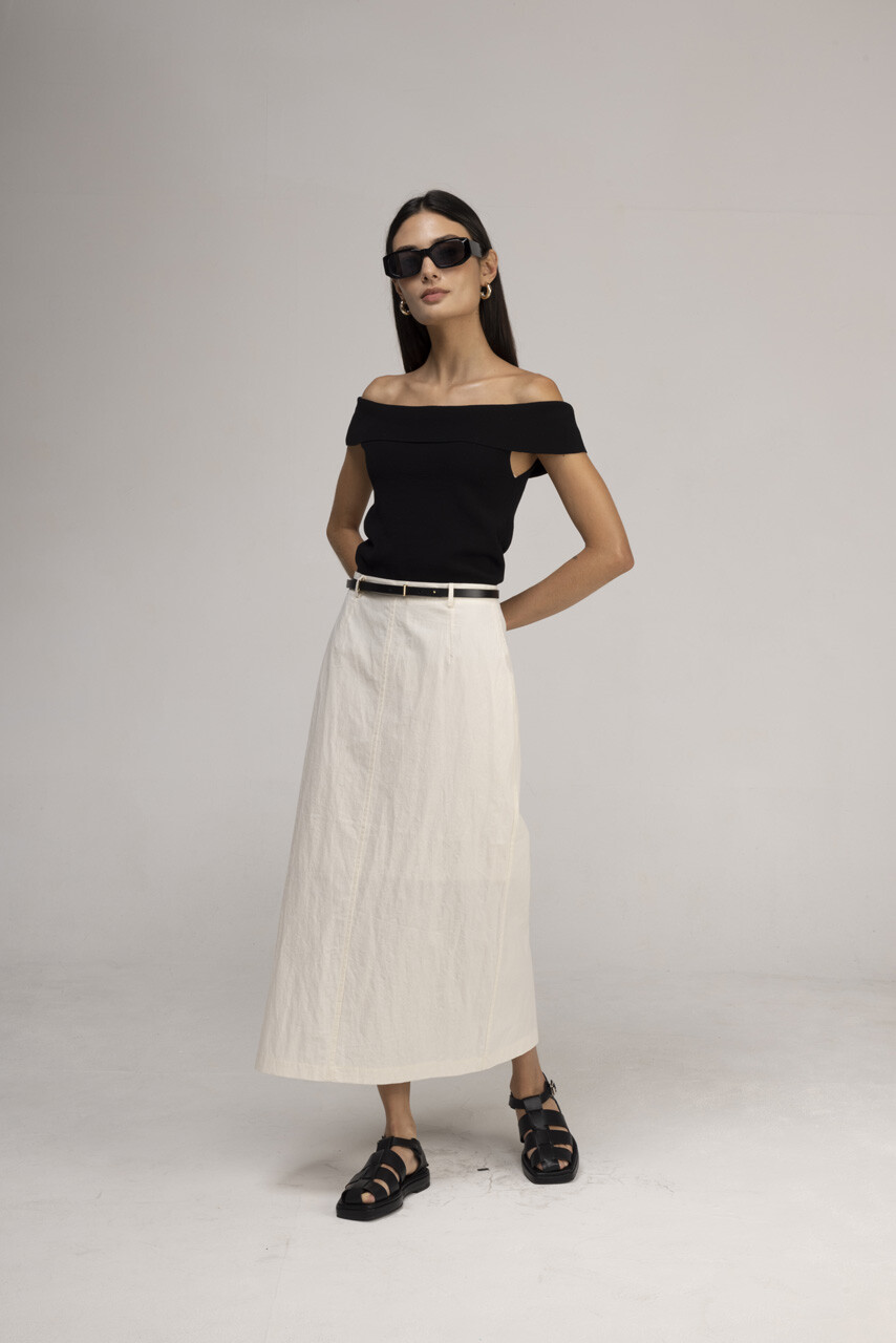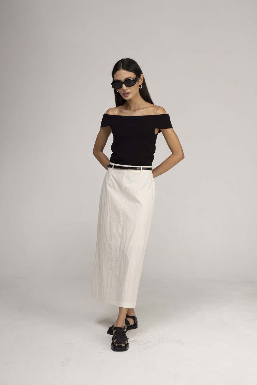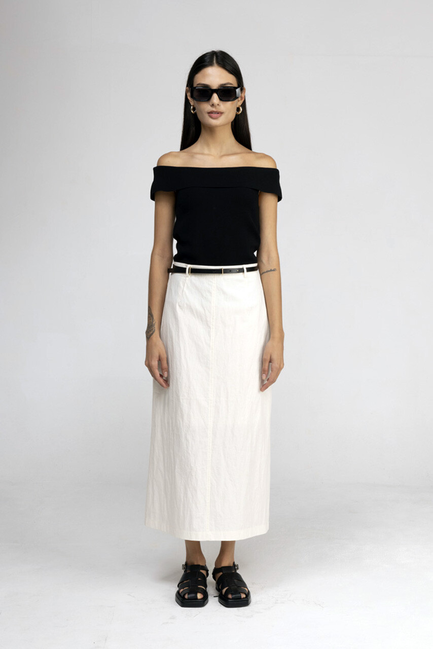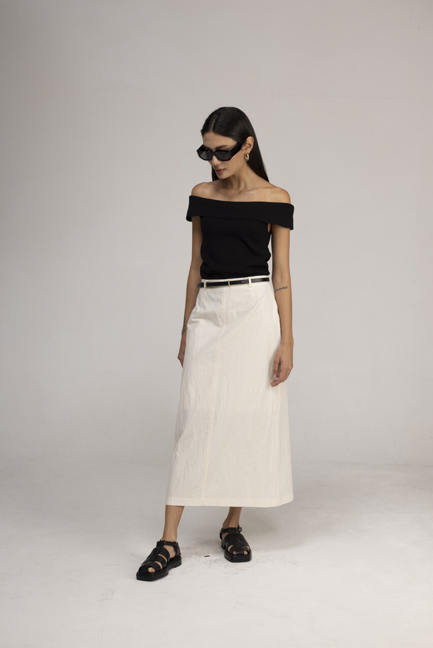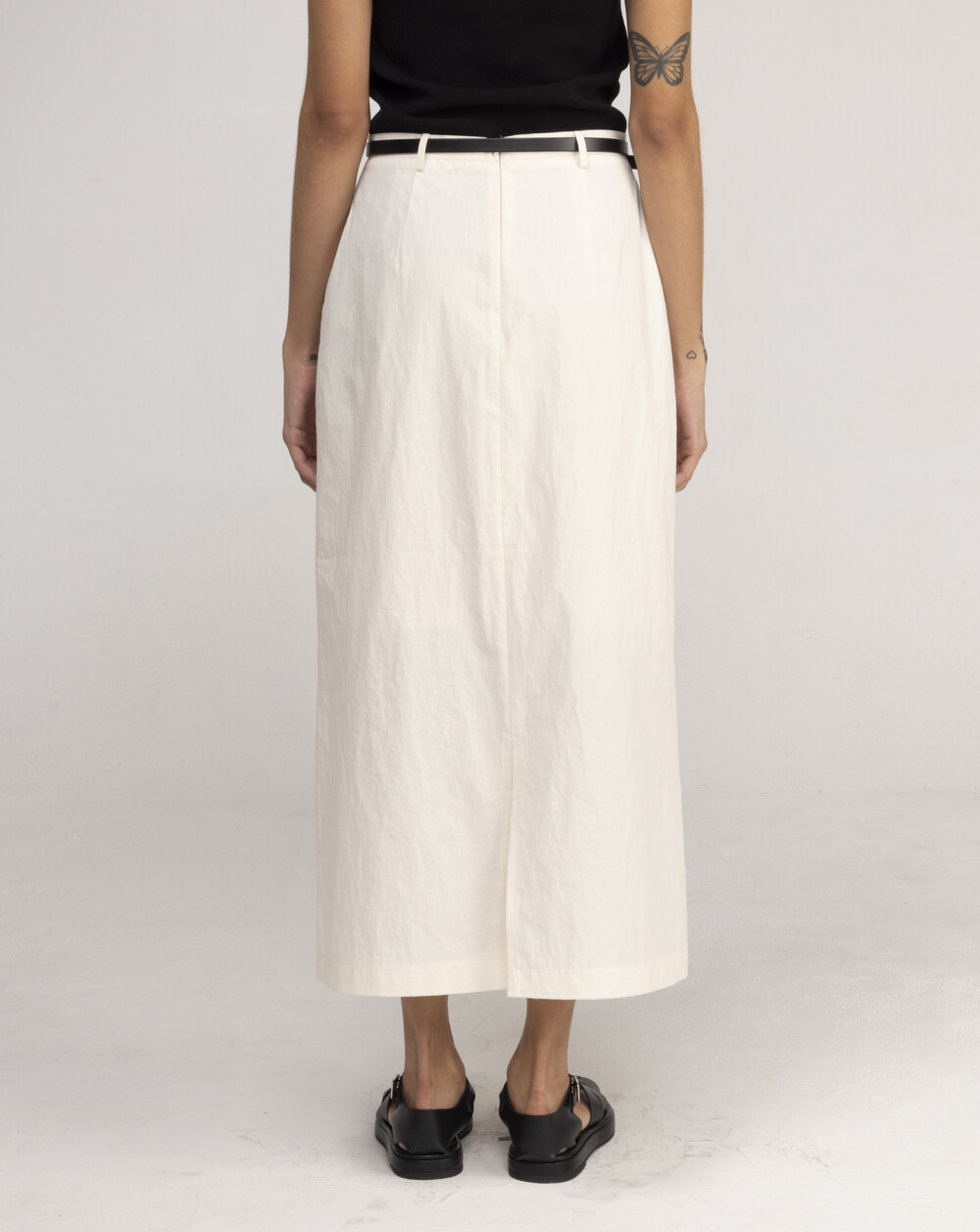 면과 나일론 혼방 소재의 스트레이트 실루엣 롱스커트 입니다.