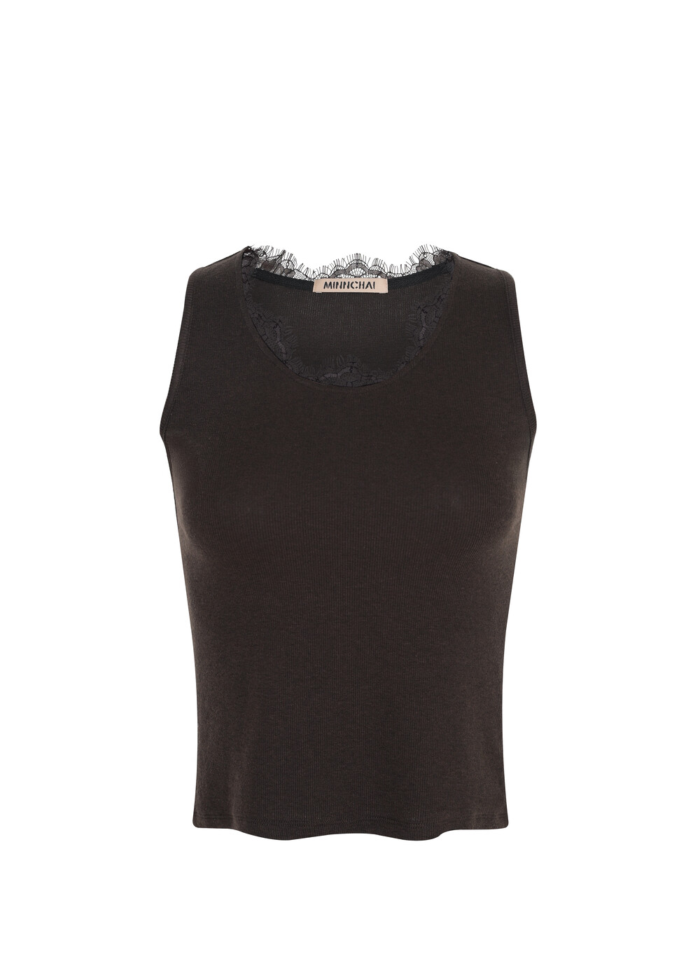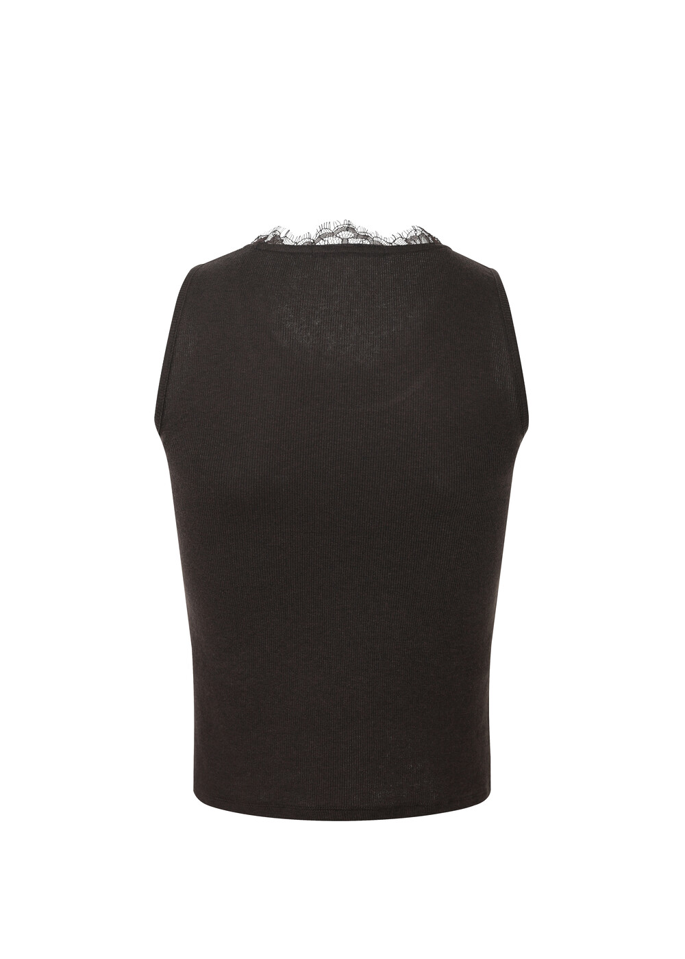 신축성이 좋은 은은한 골지 조직으로 제작된 레이스 민소매 울 니트 탑입니다.