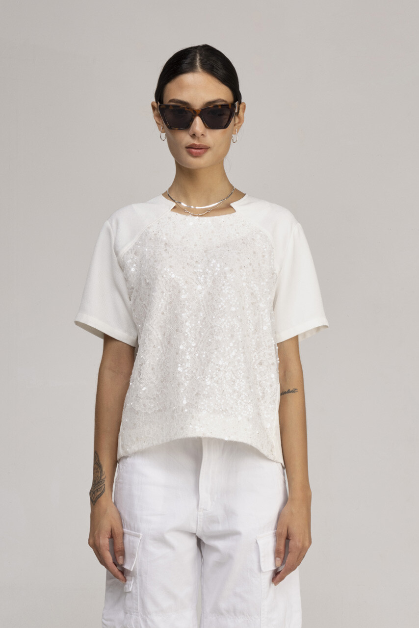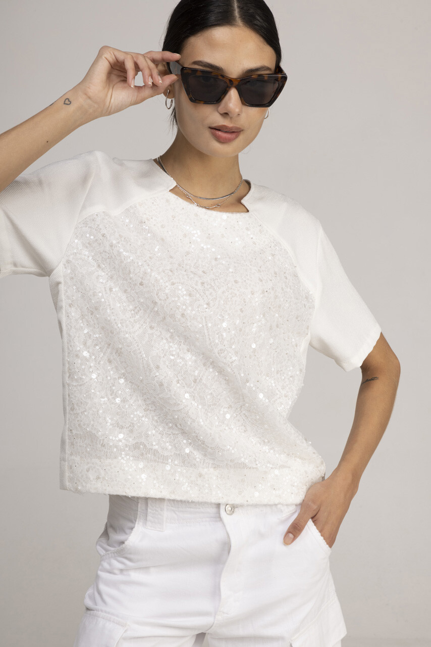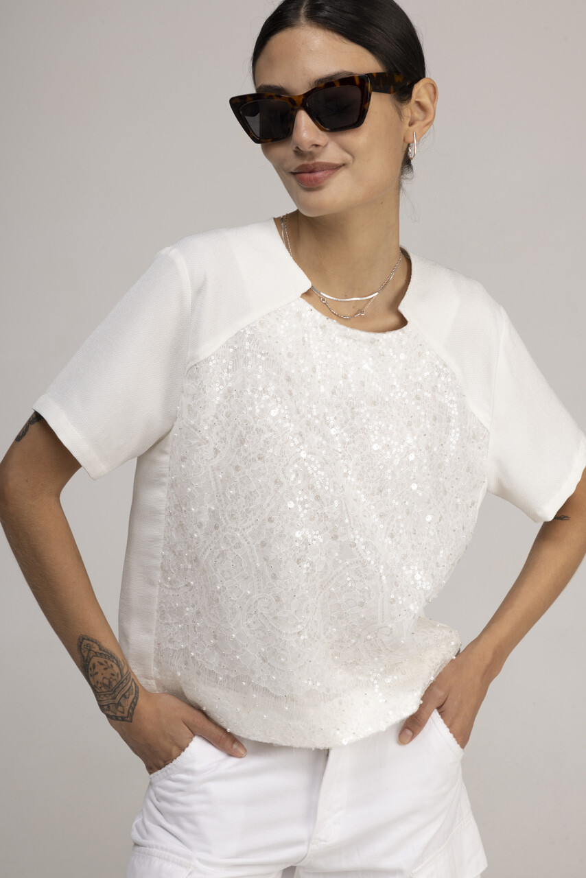 스팽글, 레이스, 쉬폰 소재의 레이어링이 고급스러운 기본실루엣의 블라우스입니다.