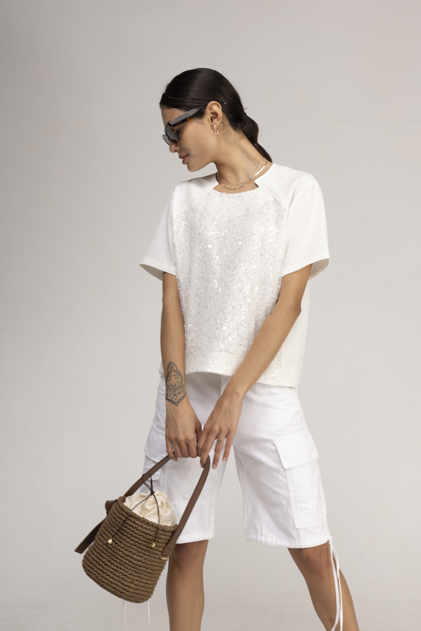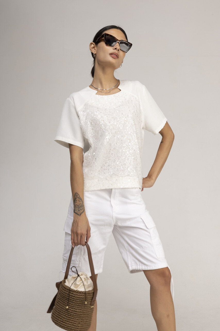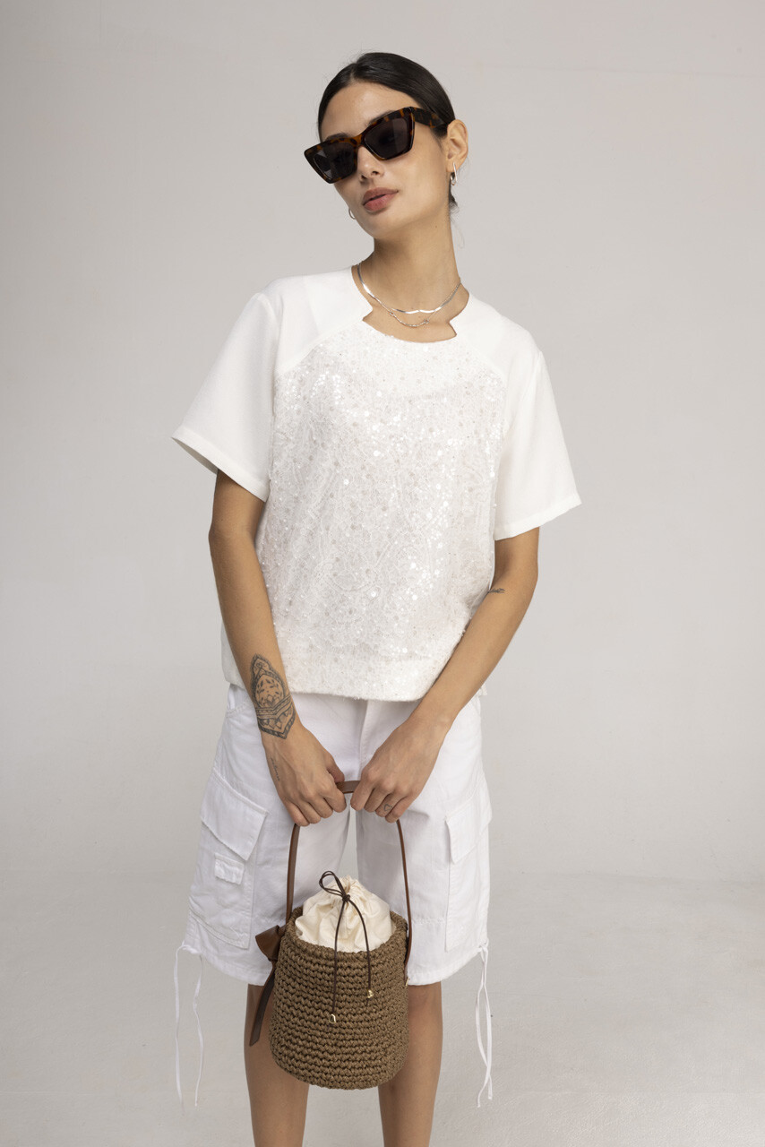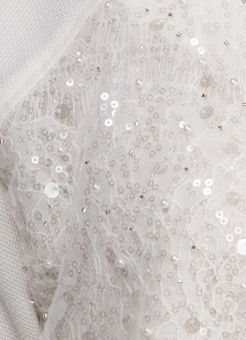 스팽글, 레이스, 쉬폰 소재의 레이어링이 고급스러운 기본실루엣의 블라우스입니다.