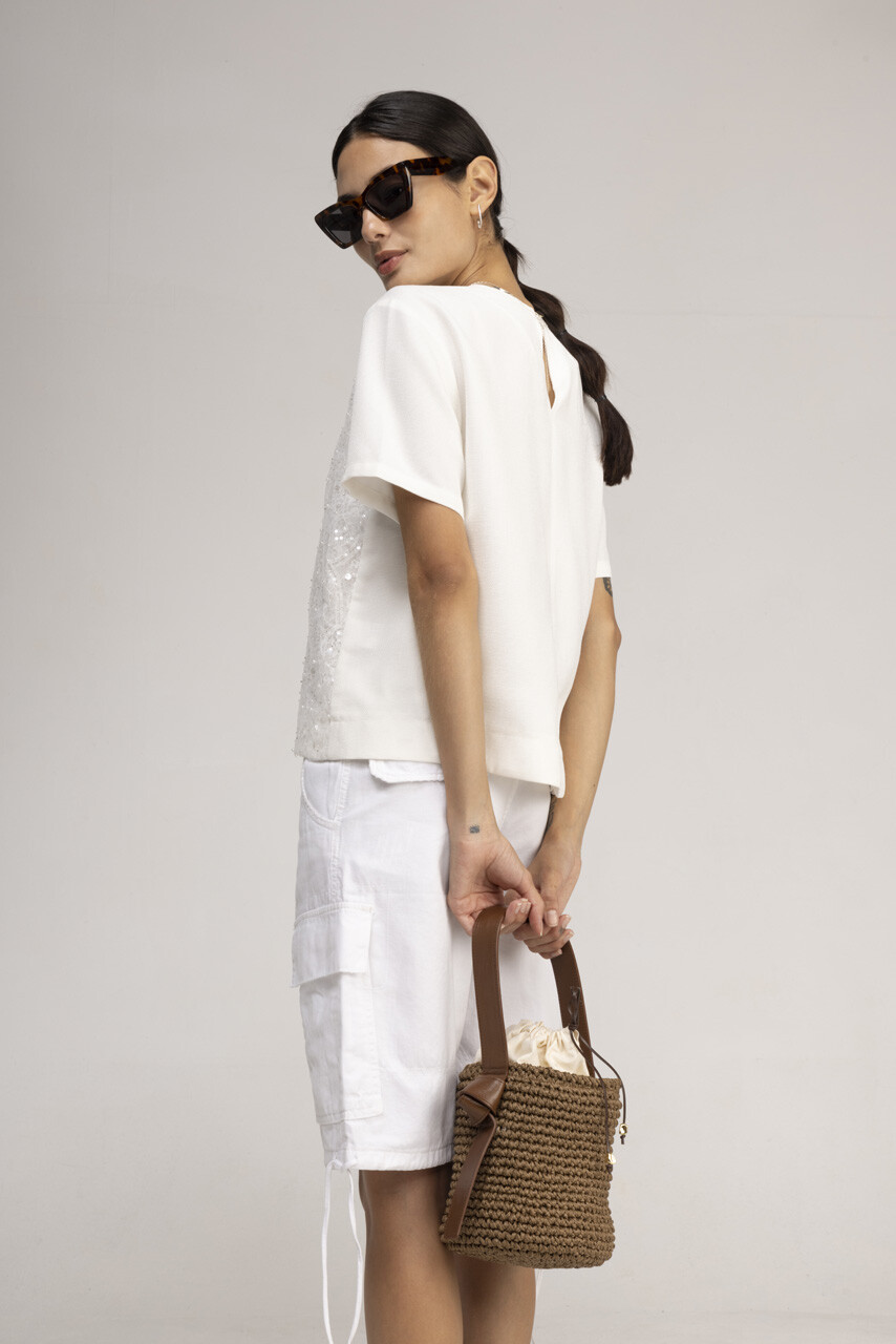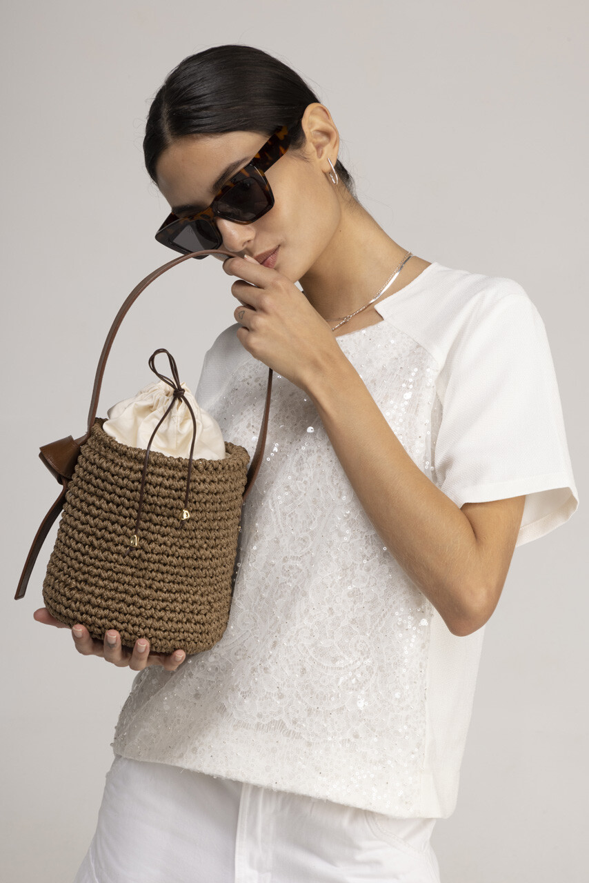 소매부분은 리넨과레이온의 혼방, 몸판 앞부분은 레이어링된 3중소재로 디자인 했습니다.